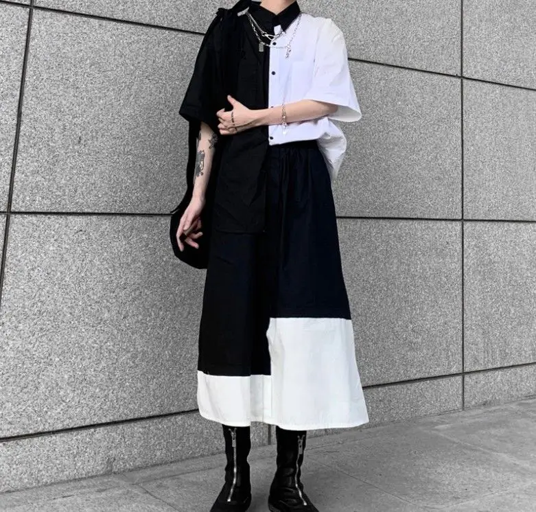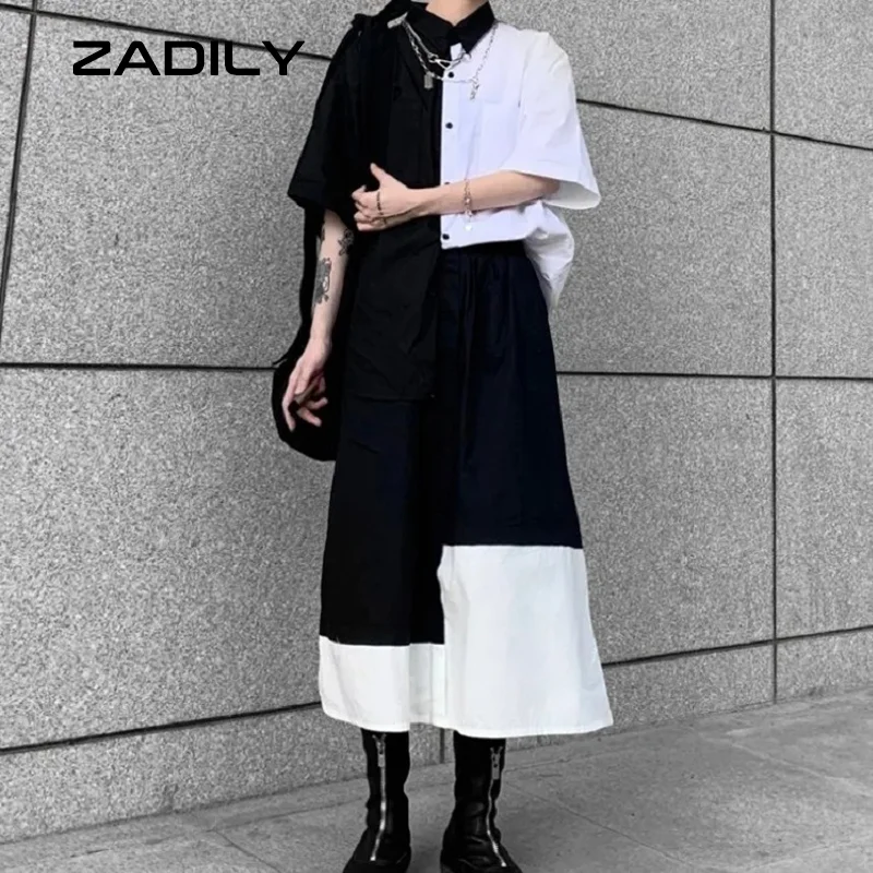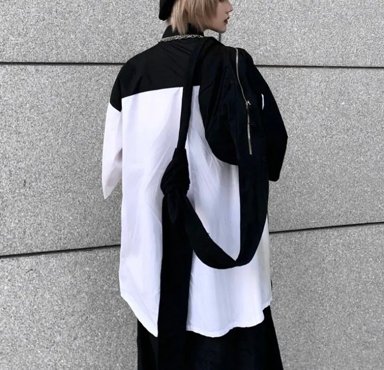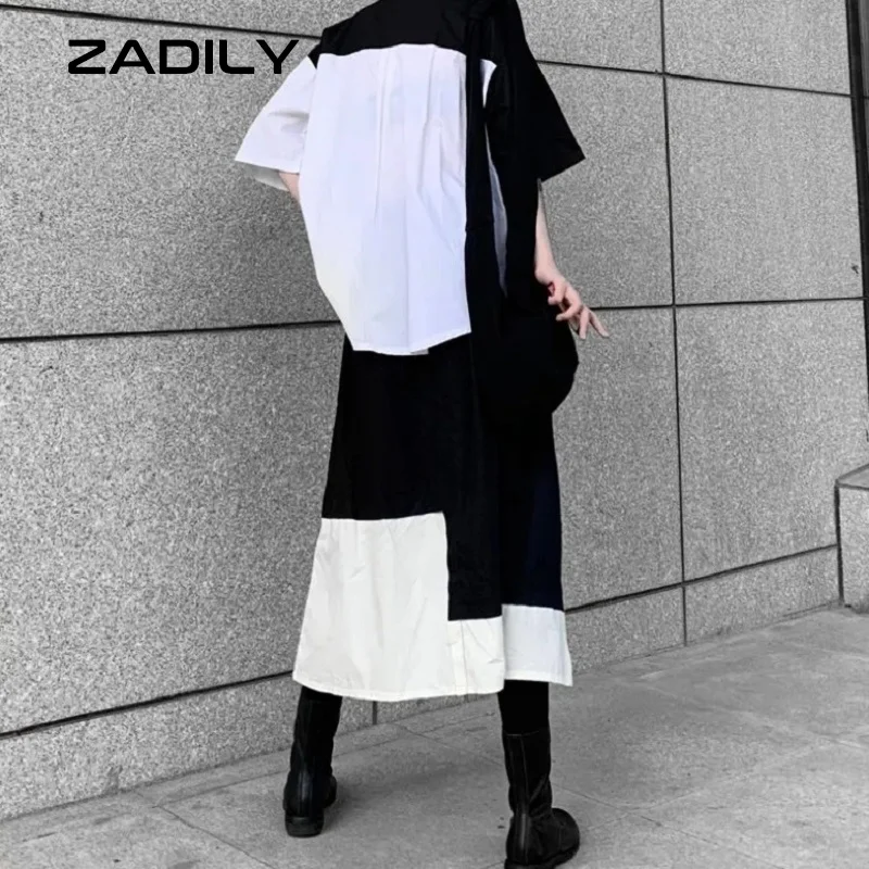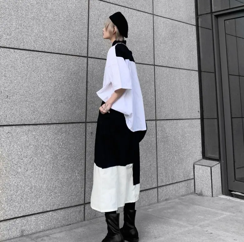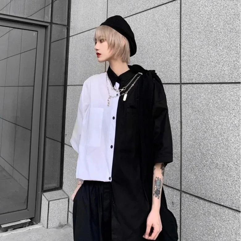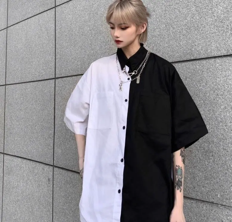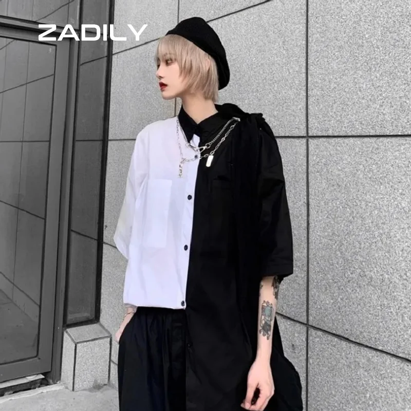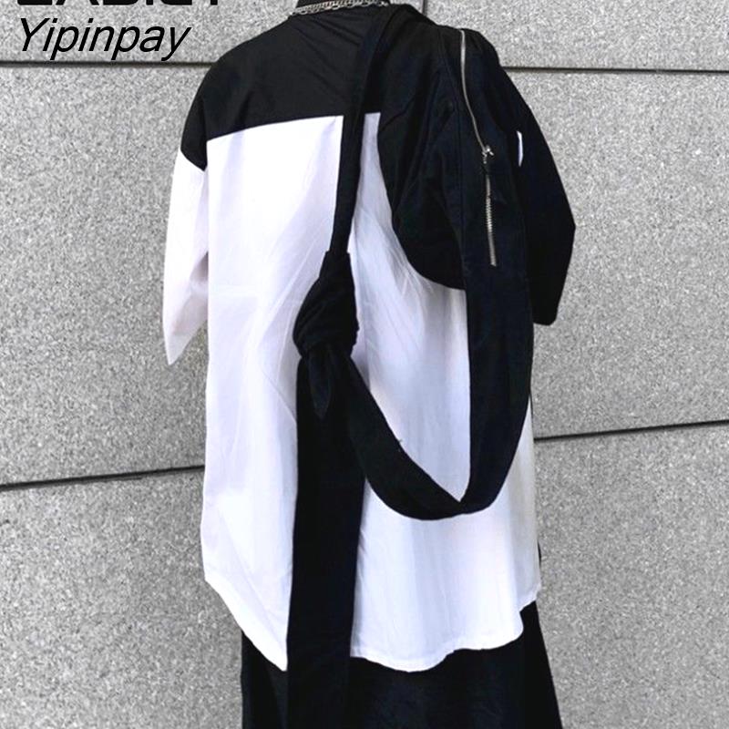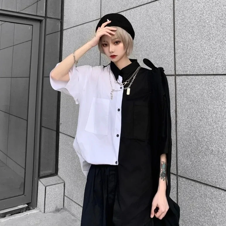 Yipinpay Street Style Oversize Women Shirt Gothic Black White Patackwork Short Sleve Ladies Blouse 2023 Summer Button Up Clothing