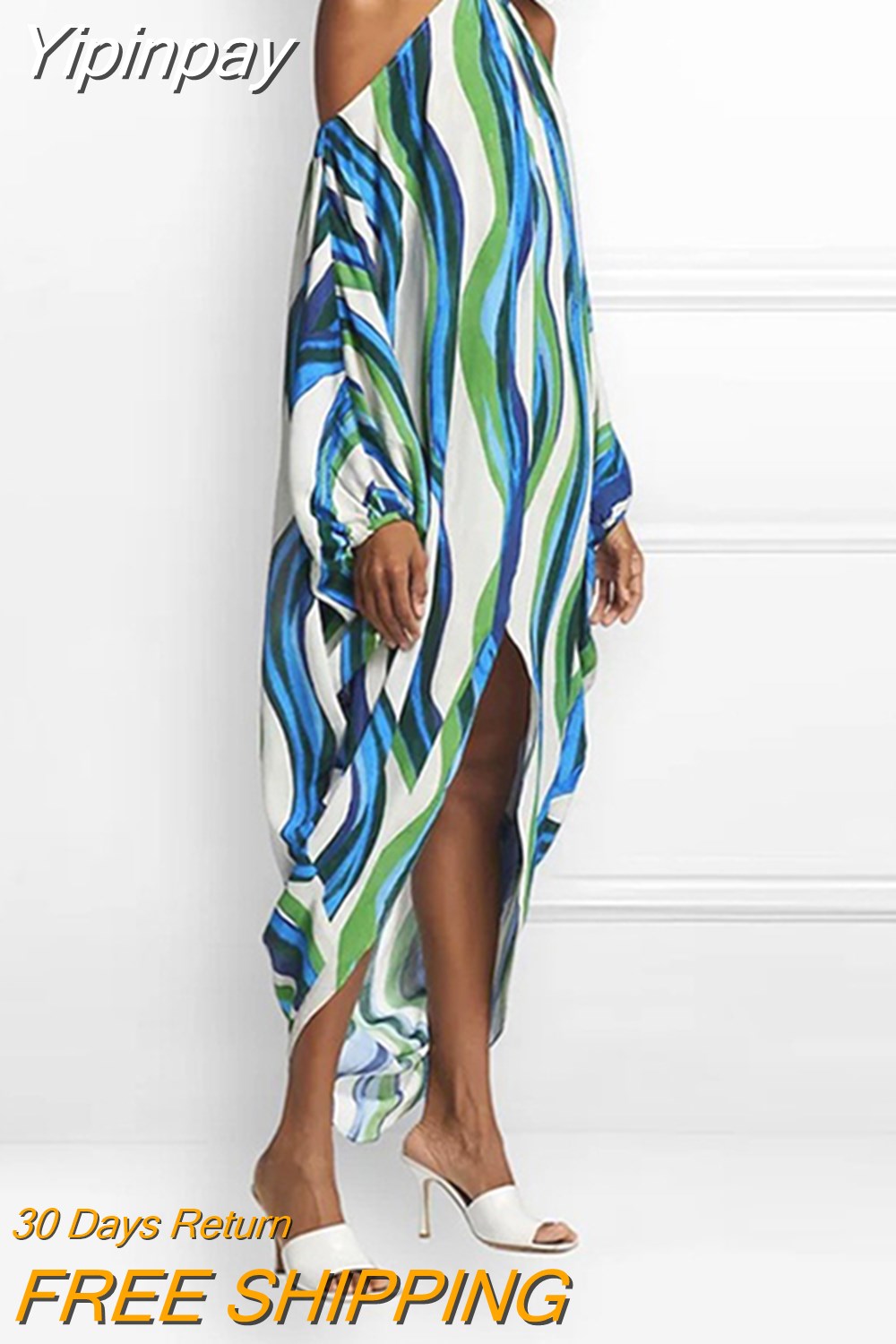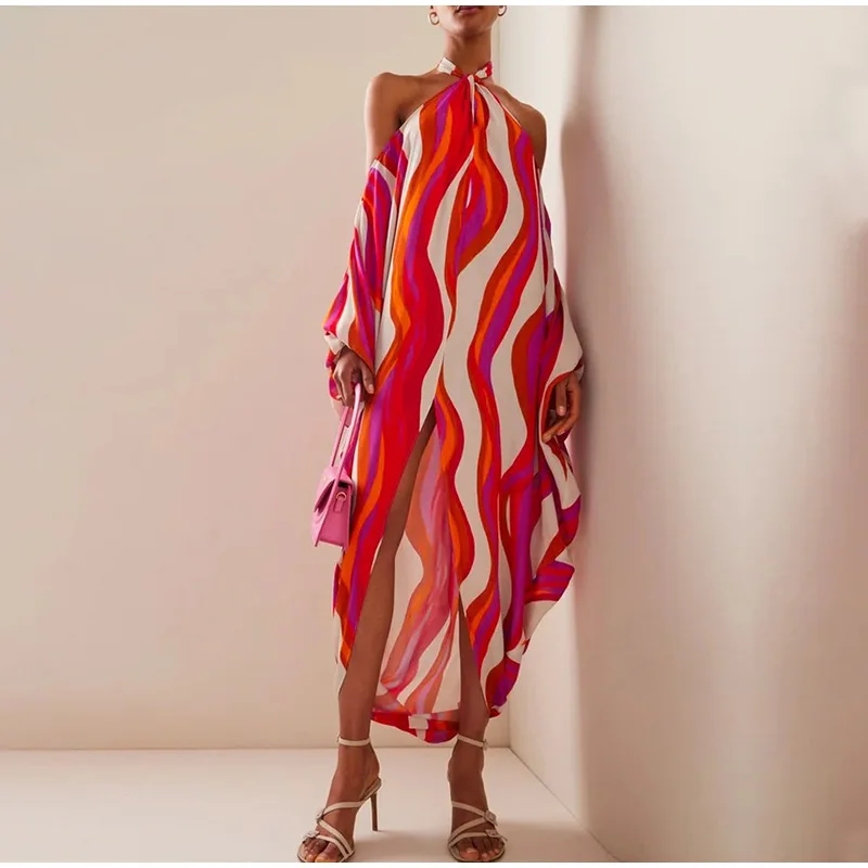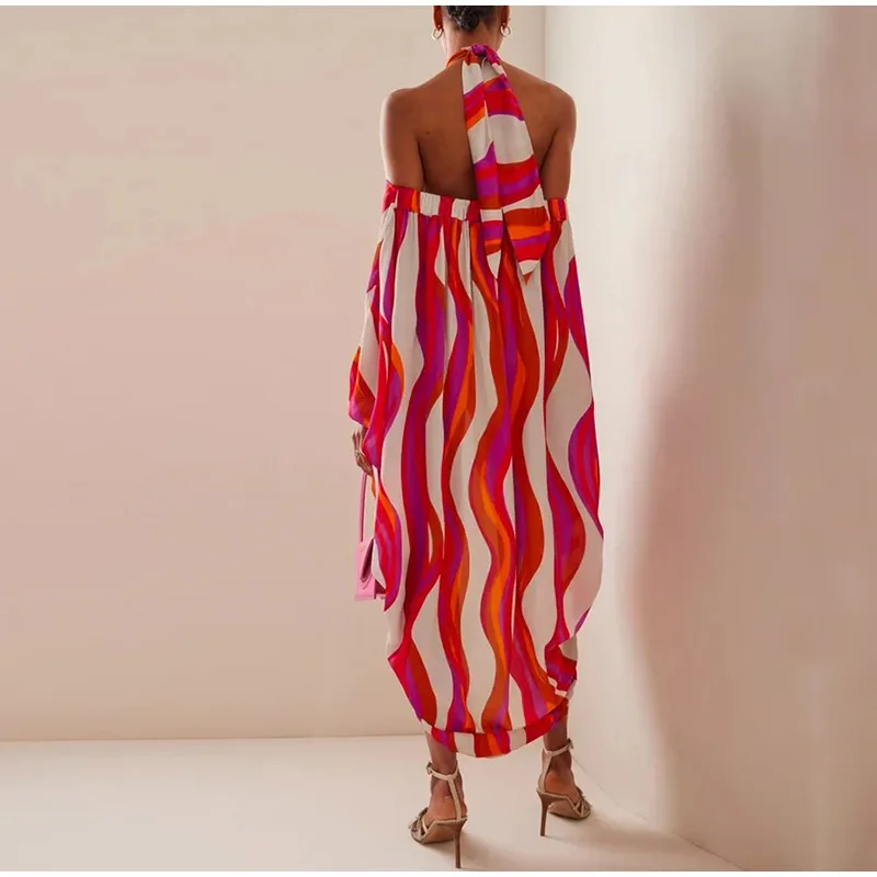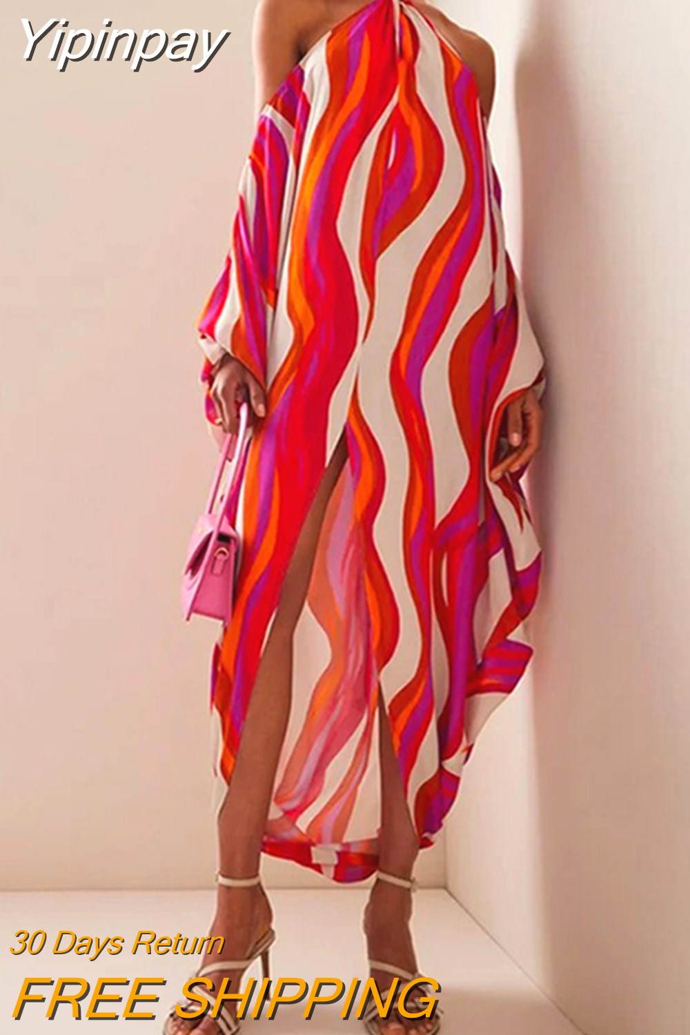 Yipinpay Stripe Printed Halter Dresses Summer Women Sexy Off Shoulder Lace Up Split Dress Elegant Temperament Backless Vestidos