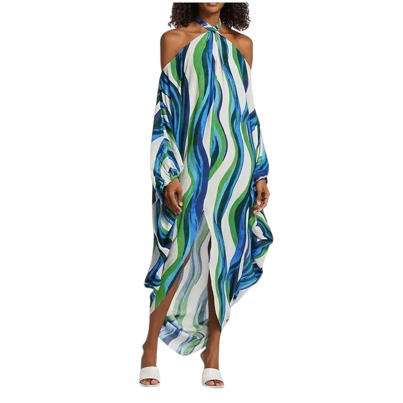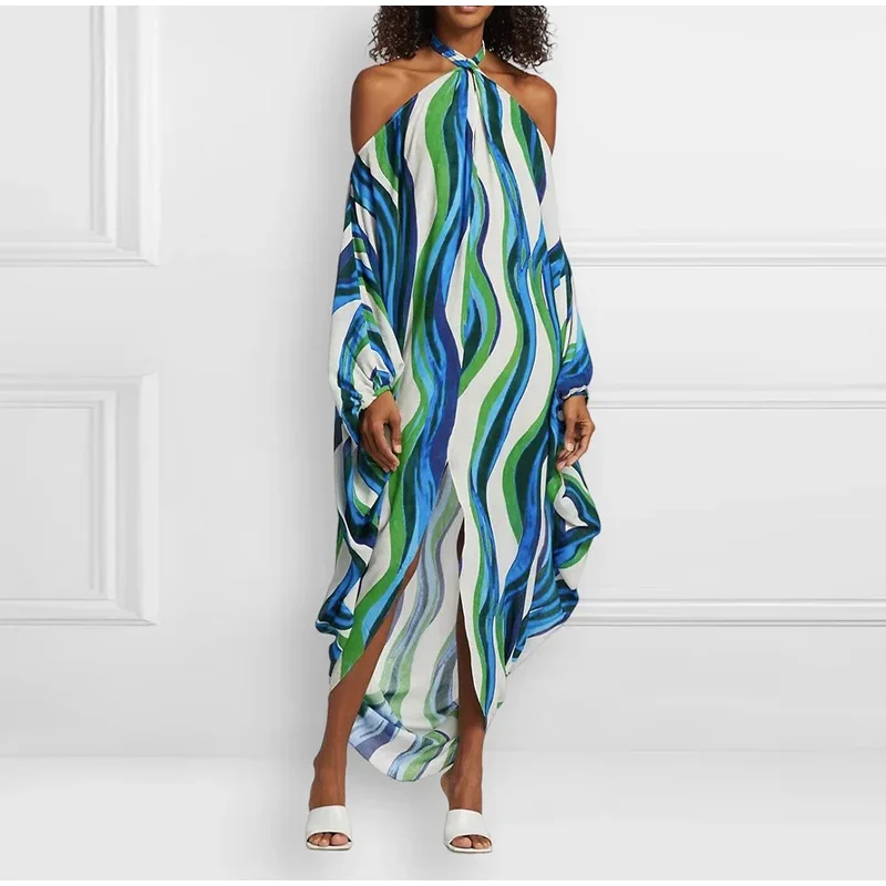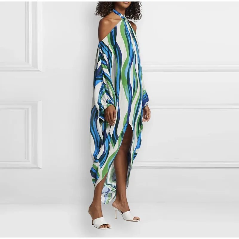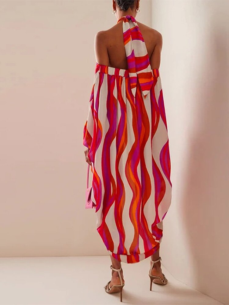 Yipinpay Stripe Printed Halter Dresses Summer Women Sexy Off Shoulder Lace Up Split Dress Elegant Temperament Backless Vestidos