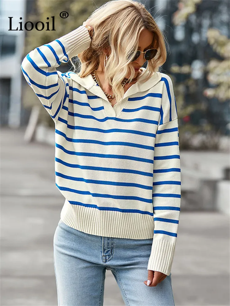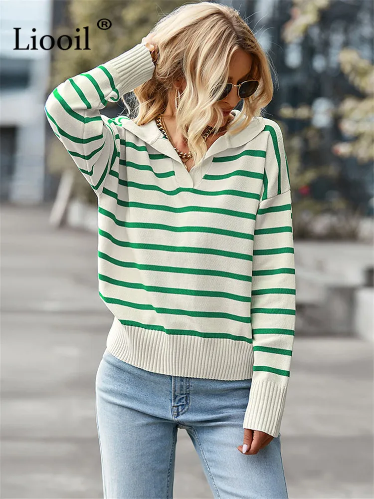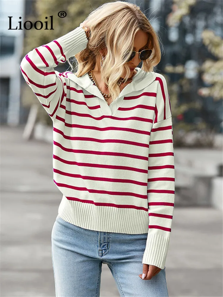 Yipinpay Striped Loose Knitted Sweater Tops Pullover Women Jumpers Streetwear Autumn Winter Long Sleeve V Neck Knitwear Sweaters
