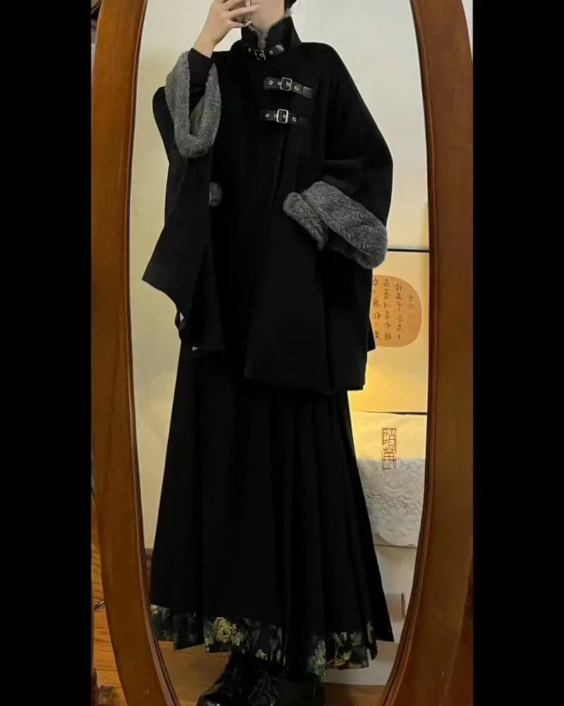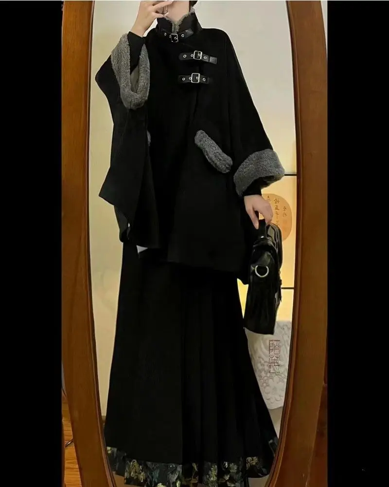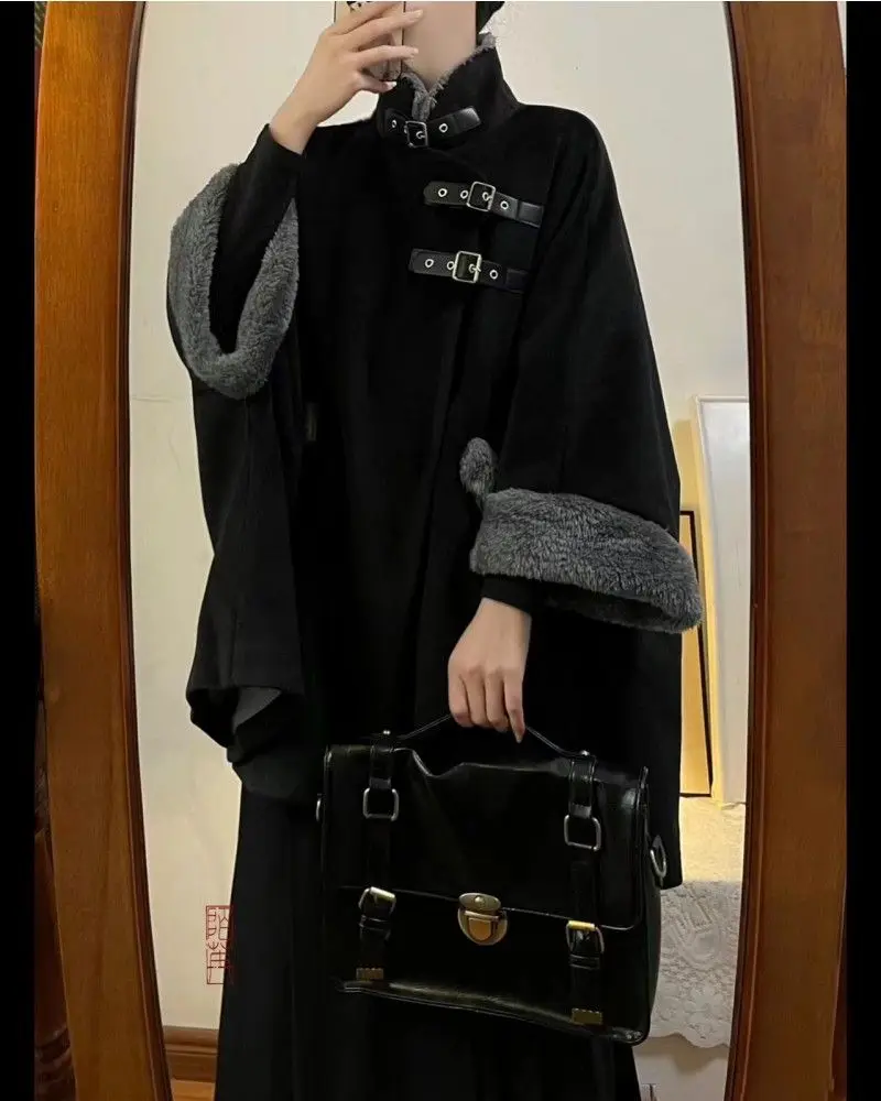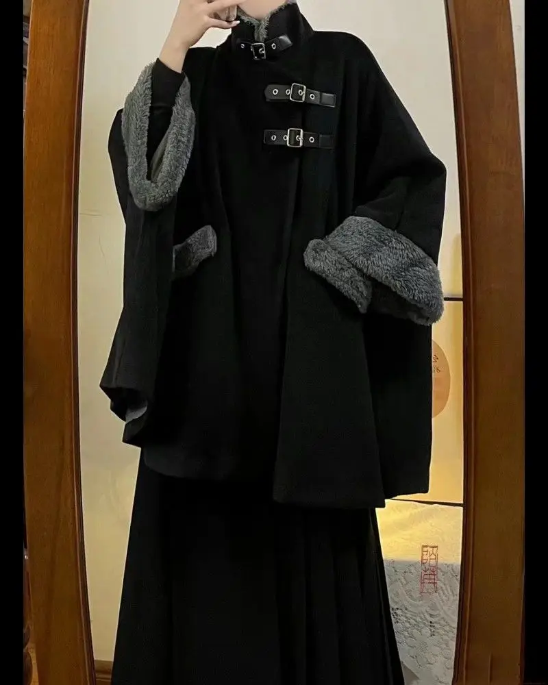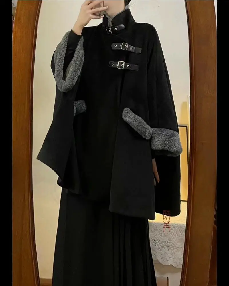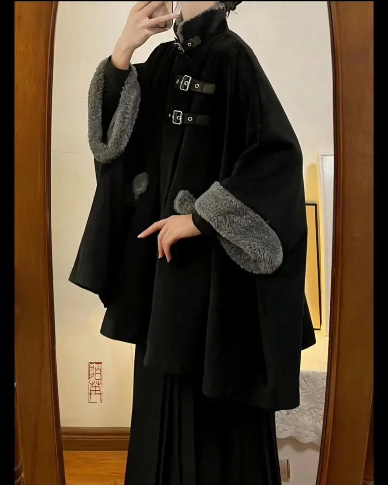 Yipinpay Style Cloak Coat Women New Chinese High end Plush Capes Autumn and Winter Loose Causal Warm Black Coat Women Clothing