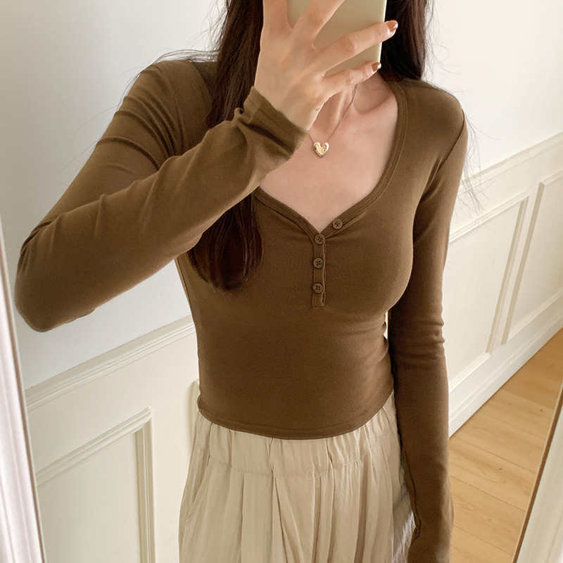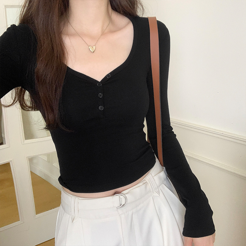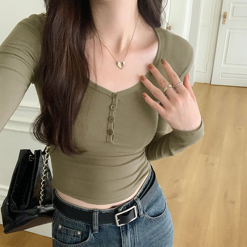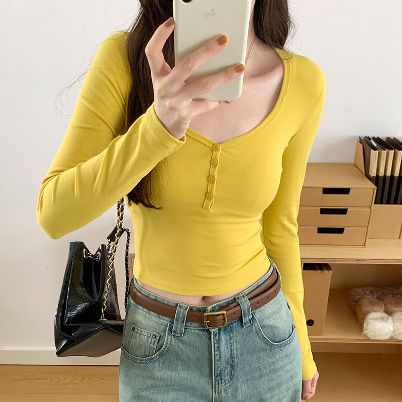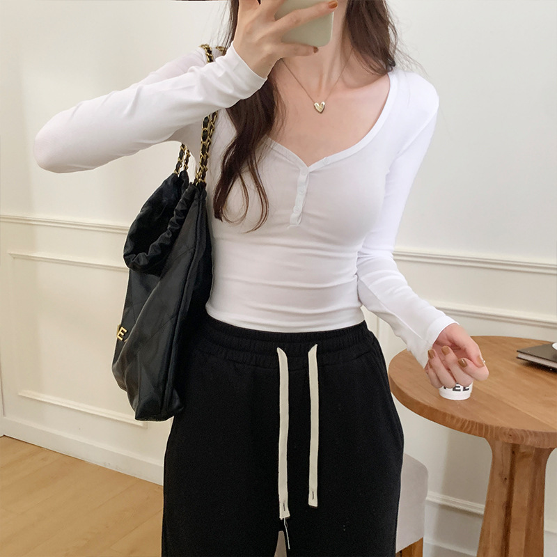 Yipinpay Style Slim Long-Sleeved T-Shirt For Thin Spice Girl A New Solid Color Bottomed Shirt With Low Collar Collarbone Blouse For Women In Early Autumn