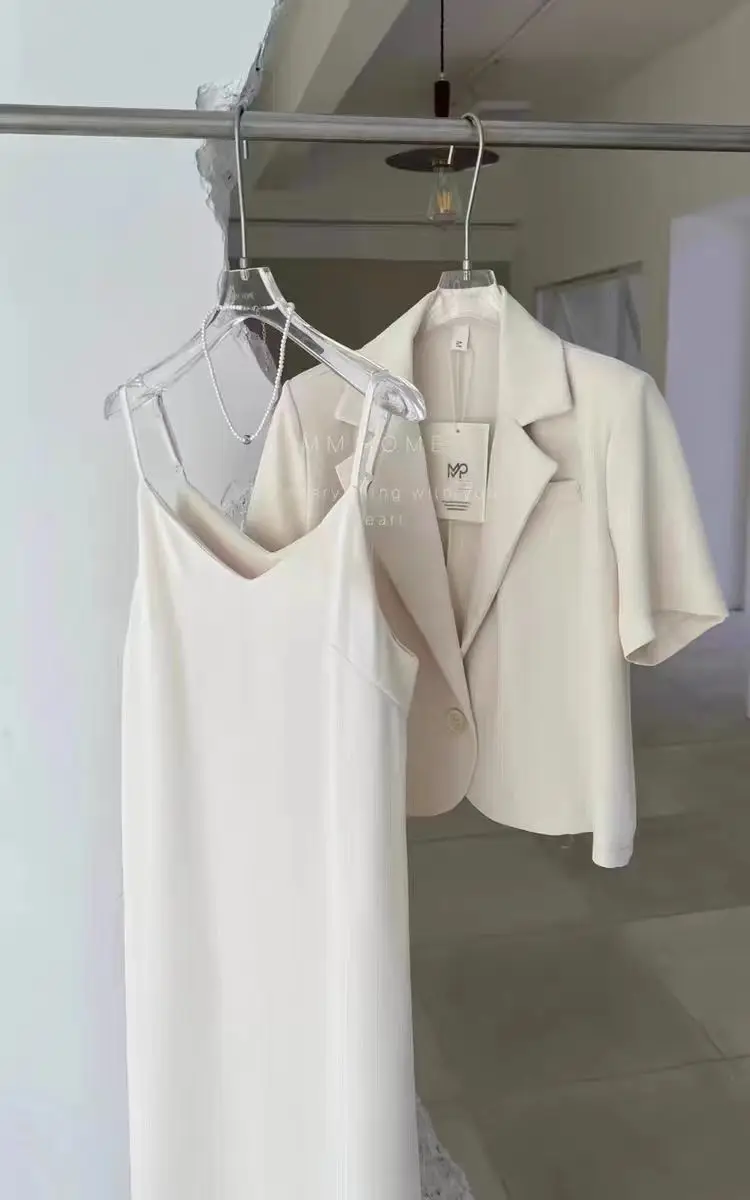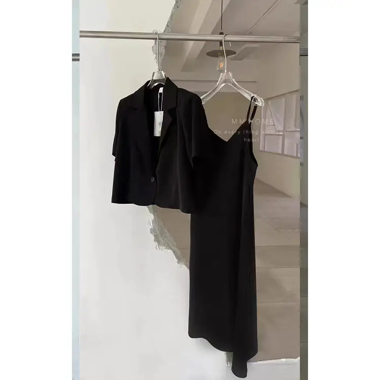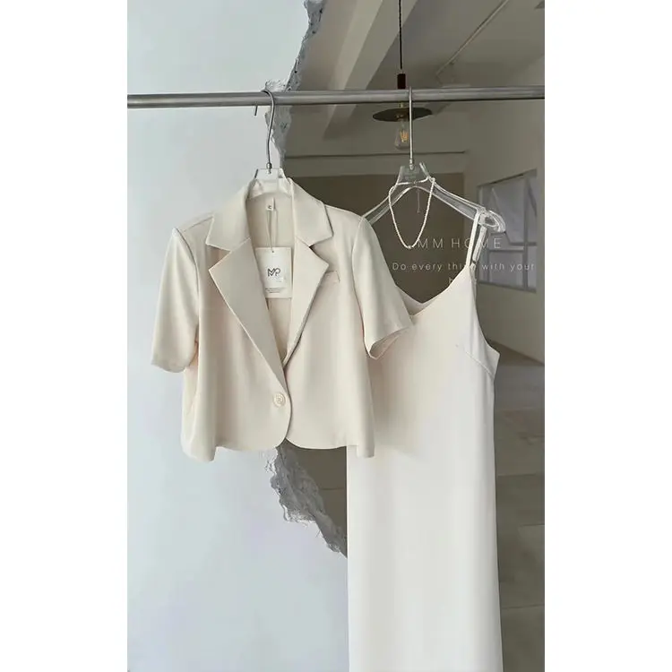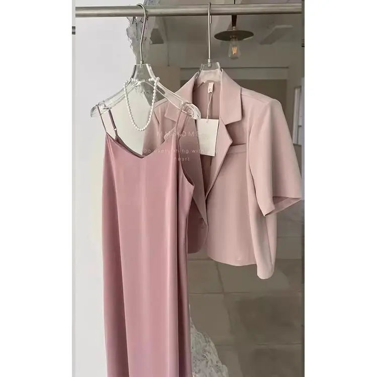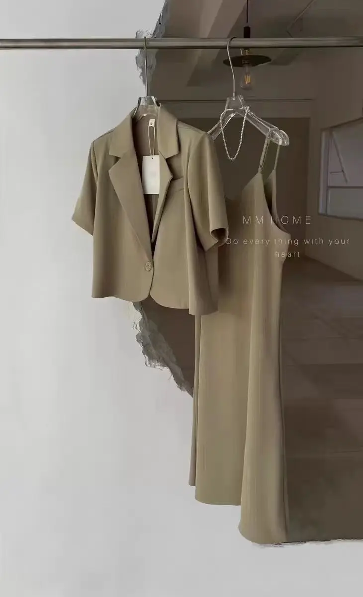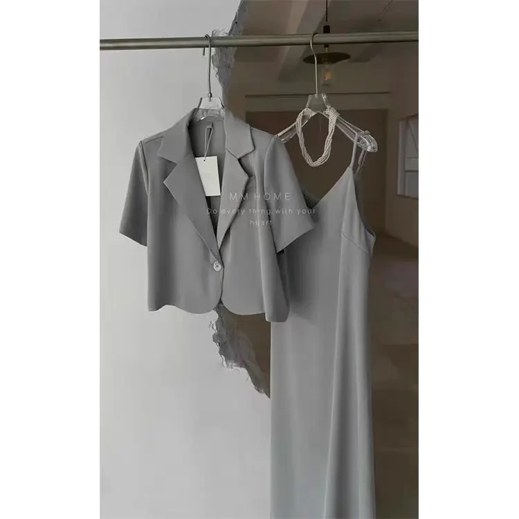 Yipinpay Suits Office Lady Grey Blazers Short Coat Short Sleeve Jacket Sexy Camisole Dress Bodycon Two Piece Sets Womens Outifits