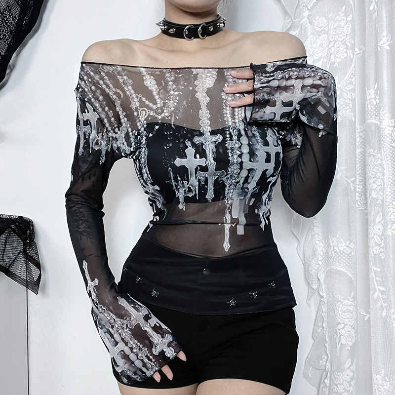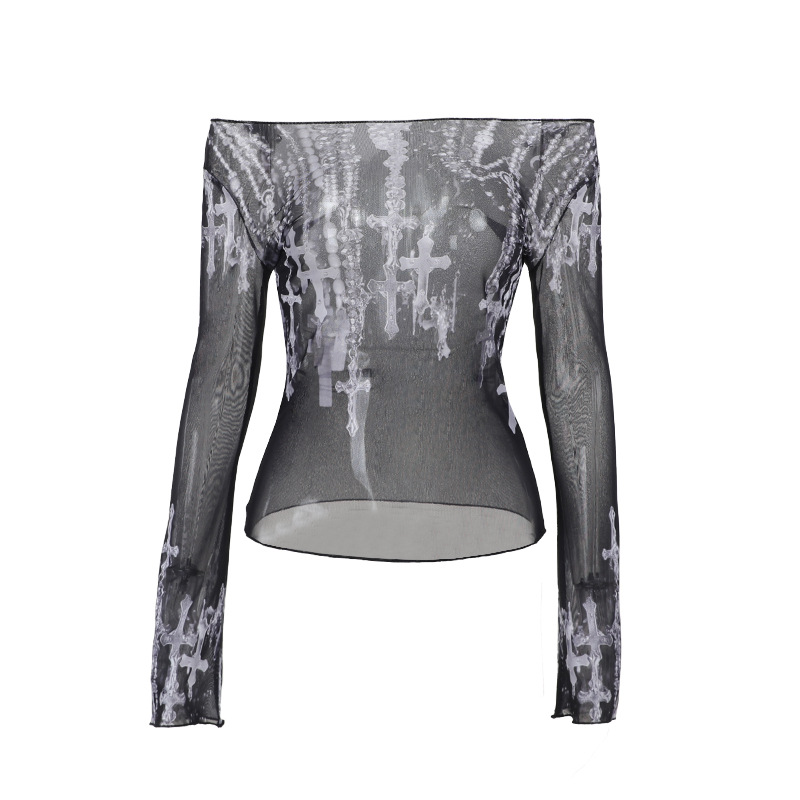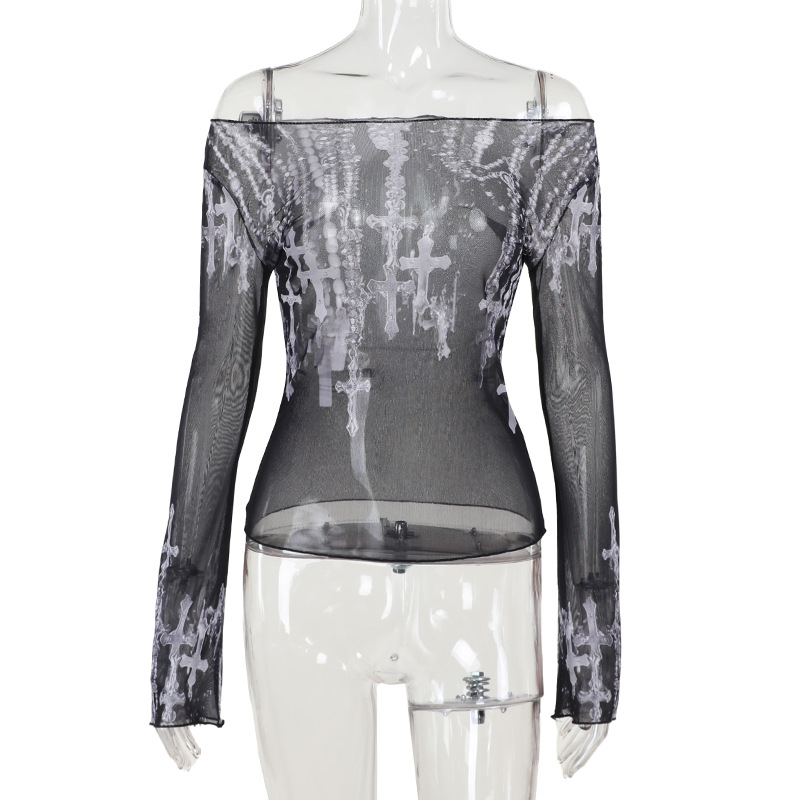 Yipinpay Summer 2024 New Punk Spice Girl Shoulder Printing Net Yarn Long-Sleeved Bottom Shirt Sunscreen Shirt Girl
