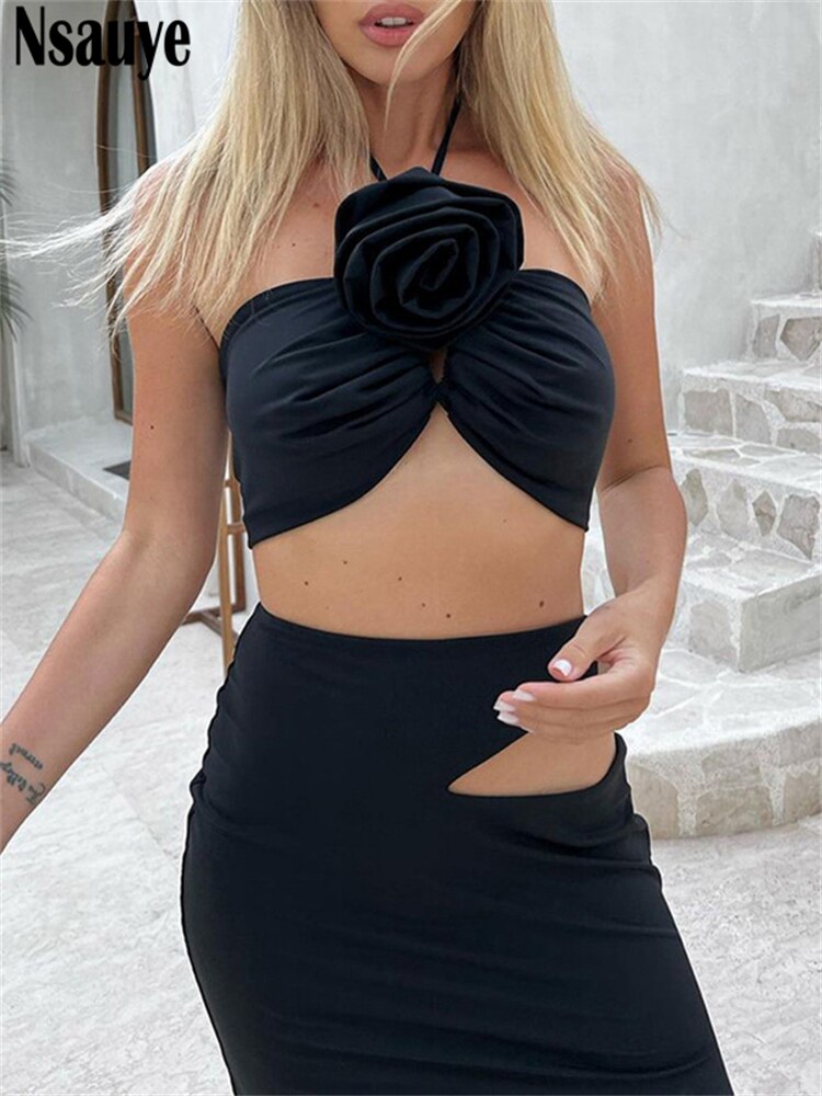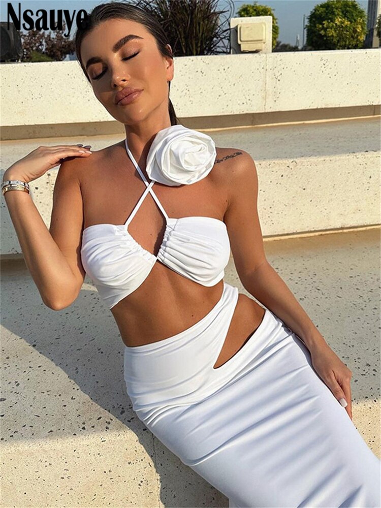 yipinpay Summer Casual Beach Women Sexy Club Skirt Suit Hollow Out Skinny Halter Crop Tops And Long Wrap Skirt Two Piece Set 2023
