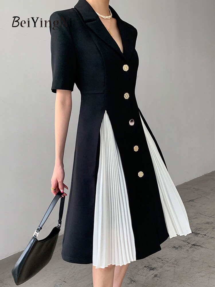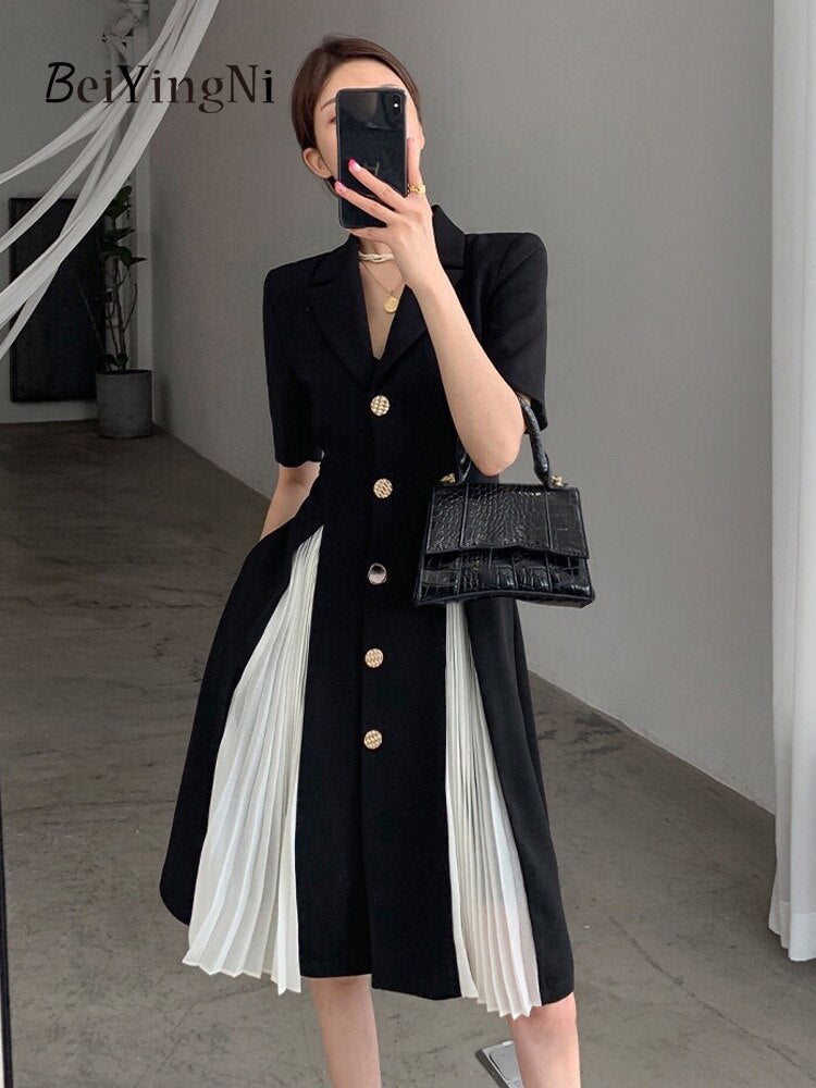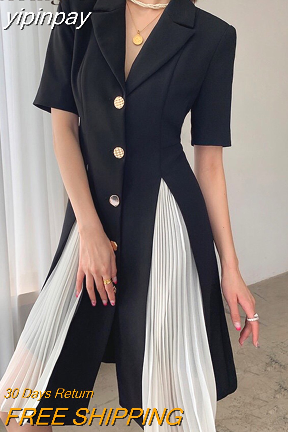yipinpay Summer Fashion Office Ladies Dresses Notched Buttons Short Sleeve Pleated Knee-Length Dress Women Patchwork Slim Dress