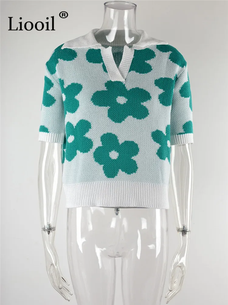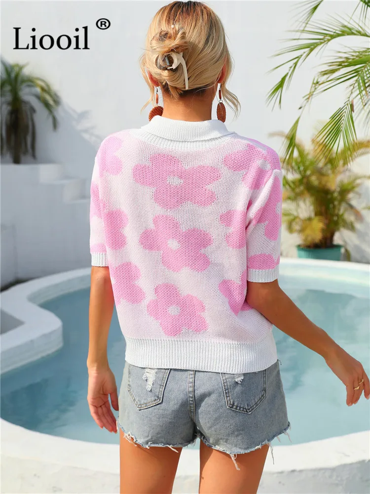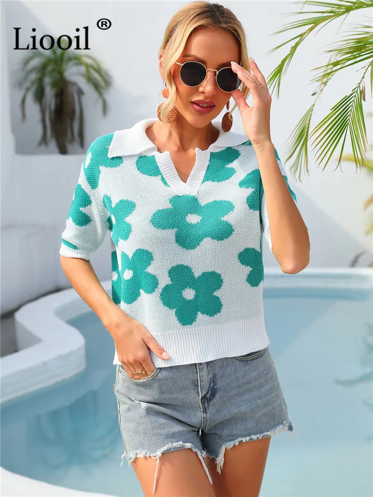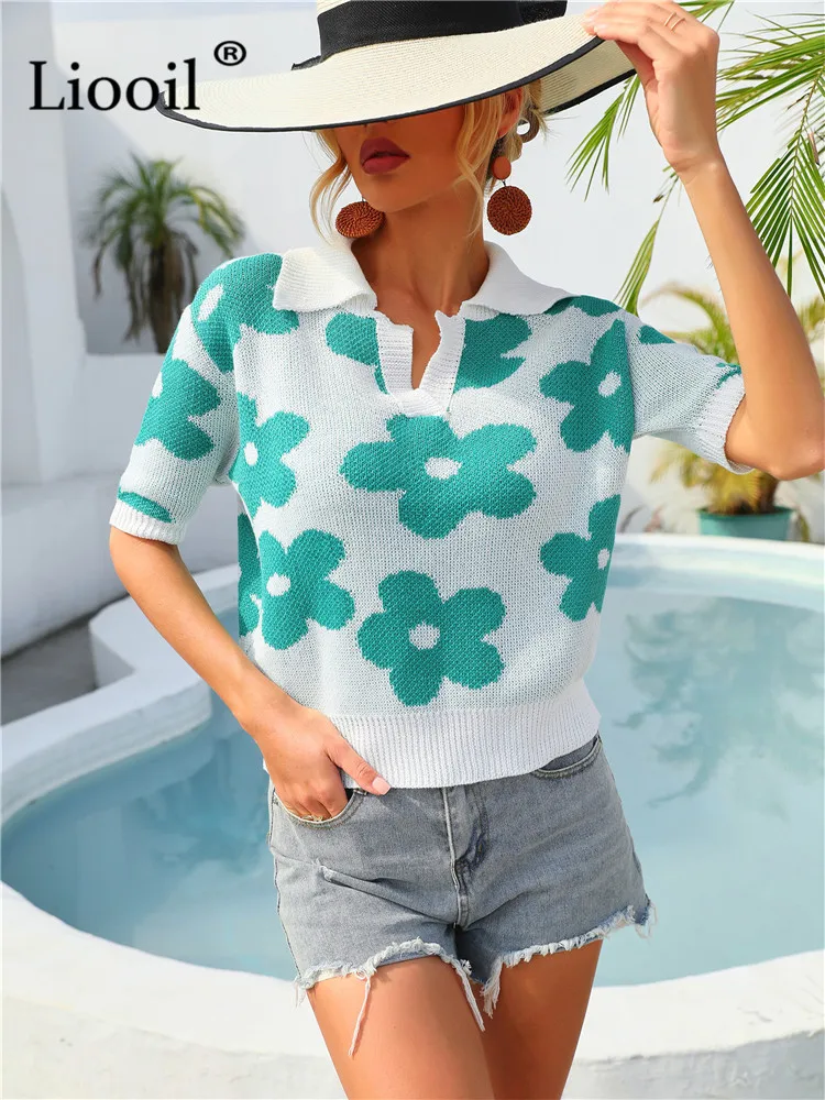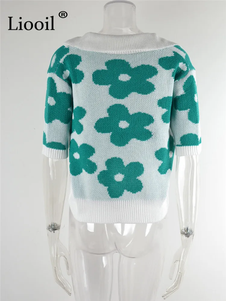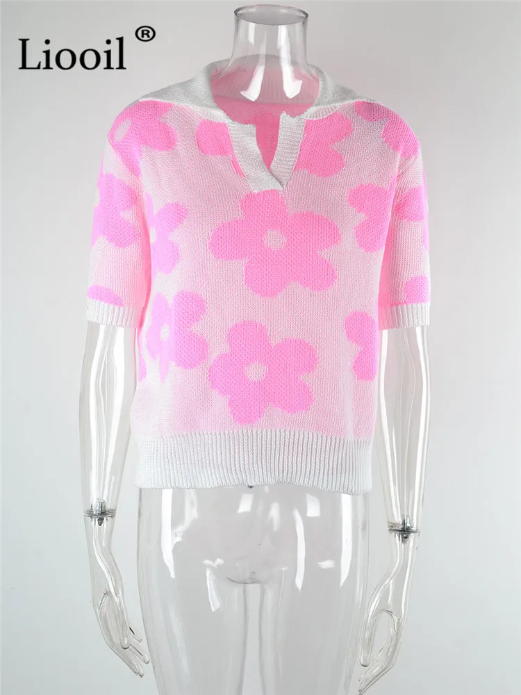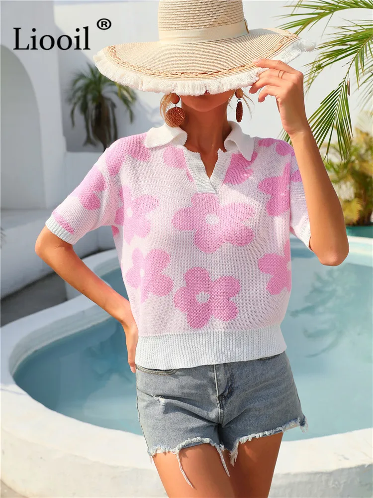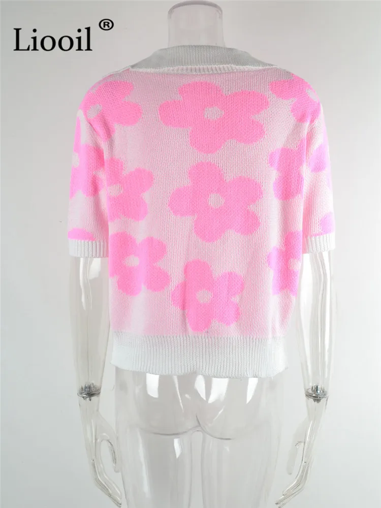Yipinpay Summer Floral Print Knit T Shirts Loose Top Women Pullovers 2023 New In Knitwears Basic Tees Streetwear Tshirt Sexy Tops