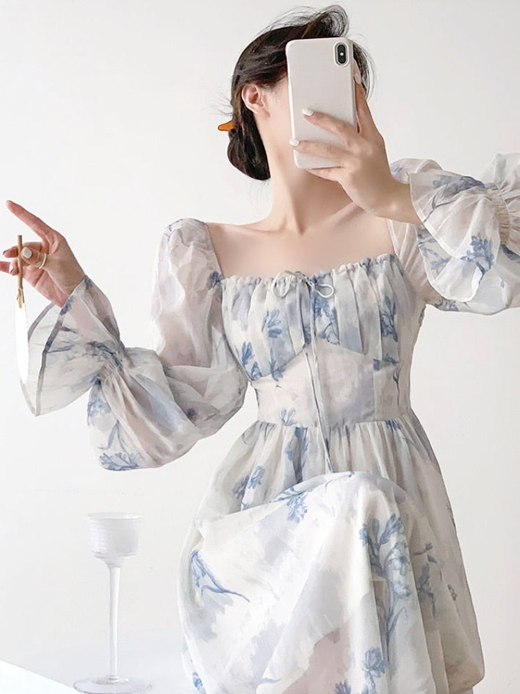 Yipinpay Summer French Elegant Floral Midi Dress Party Chiffon Vintage Fashion Dress Beach Long Sleeve Casual Dress Office Lady Chic