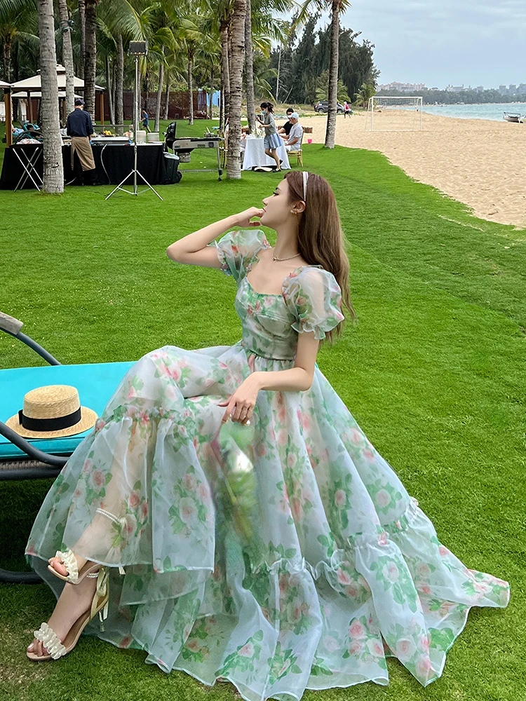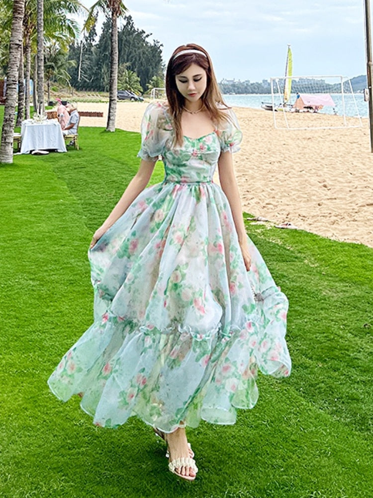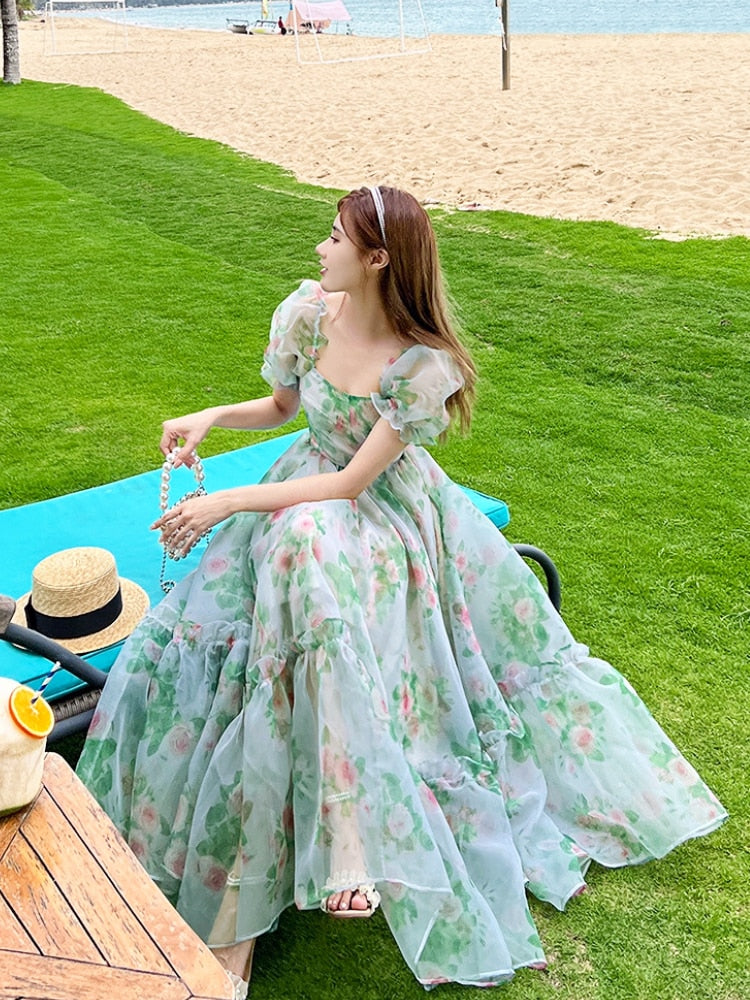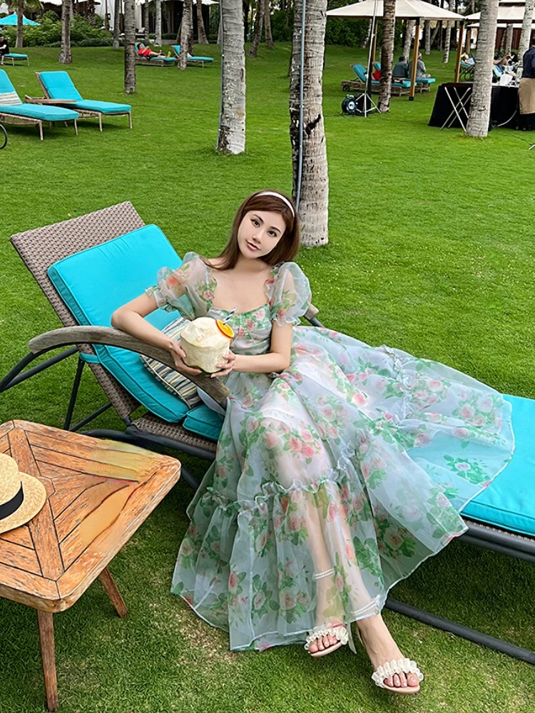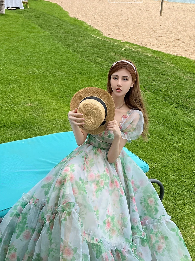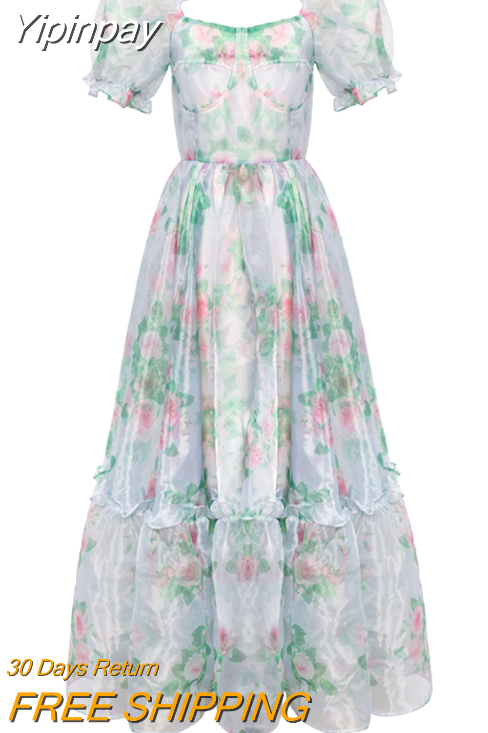 Yipinpay Summer French Elegant Floral Midi Dress Woman Puff Sleeve Vintage Fashion Dress Office Lady Beach Style Party Sundress Chic