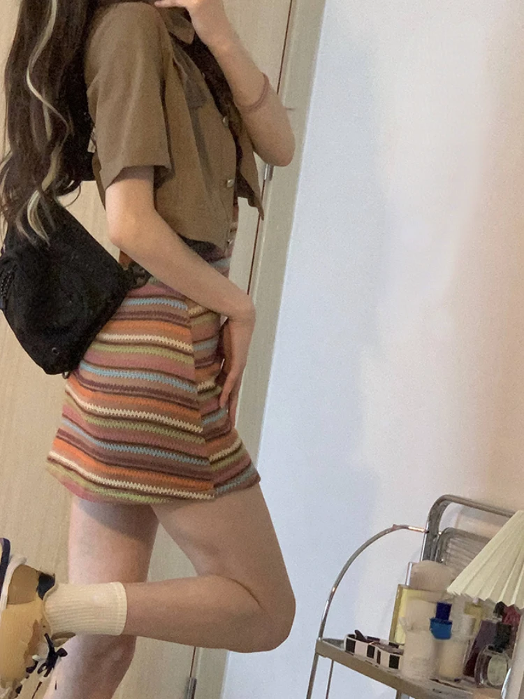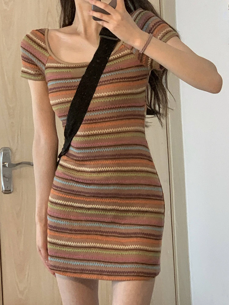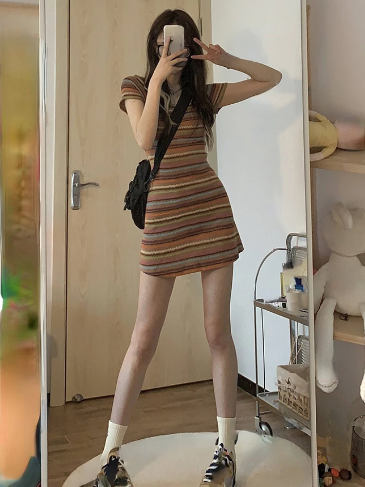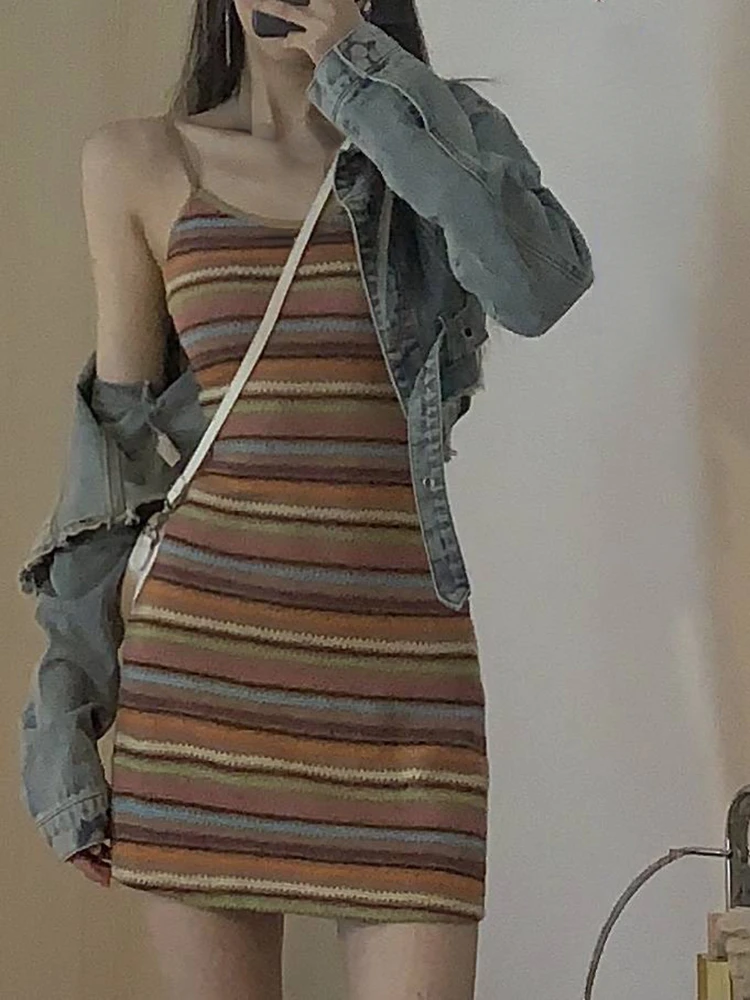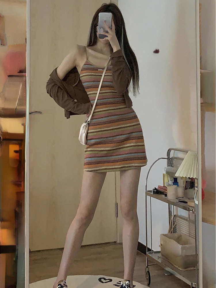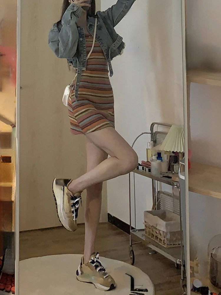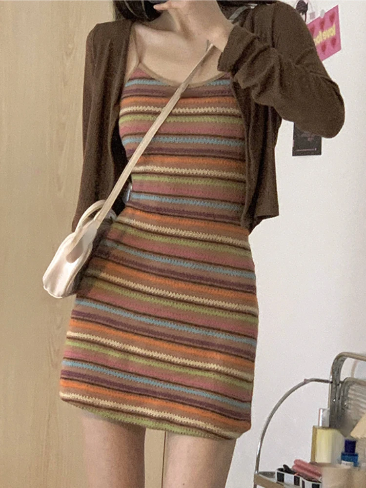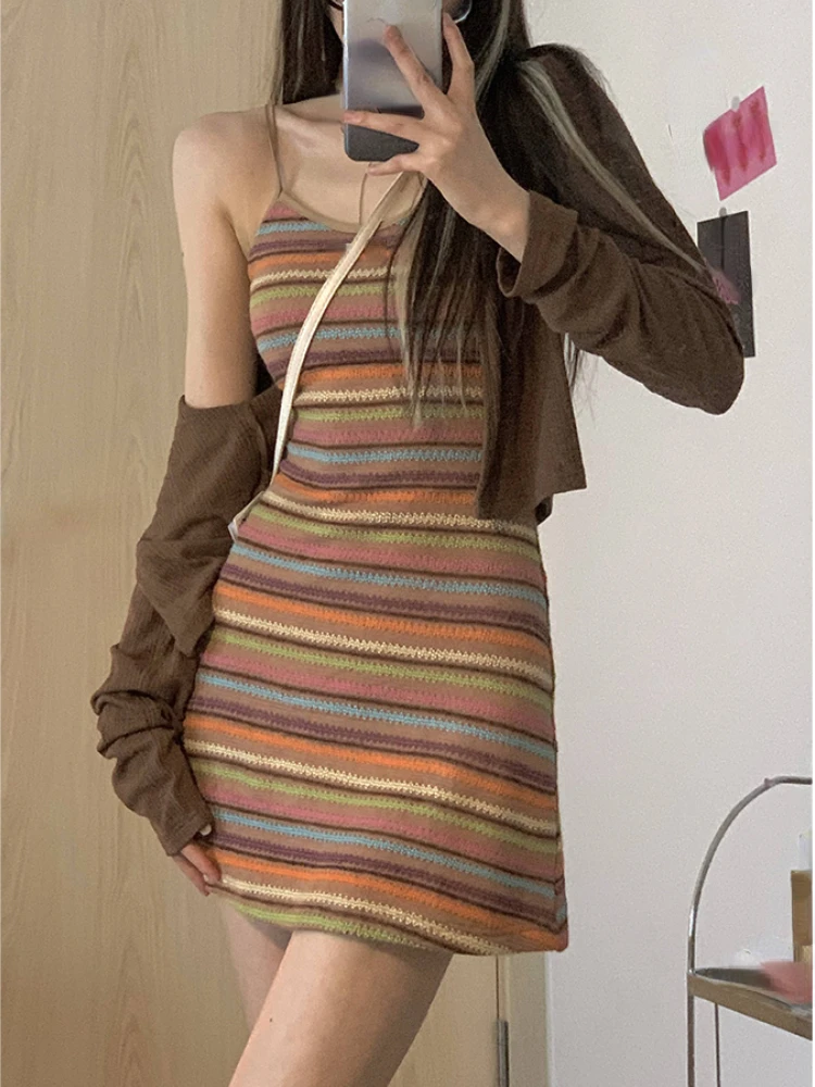 Yipinpay Summer Korean 2 Piece Dress Set Woman Rainbow Sexy Bodycon Strap Mini Dress + Pure Color Long Sleeve Tops Elegant Suit