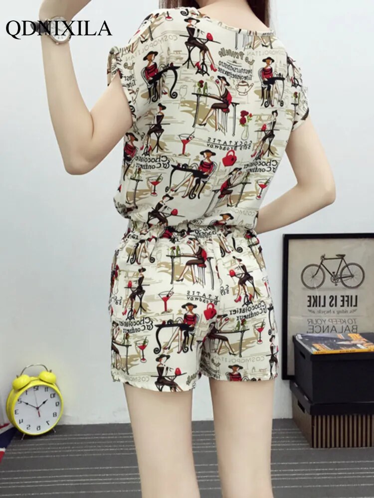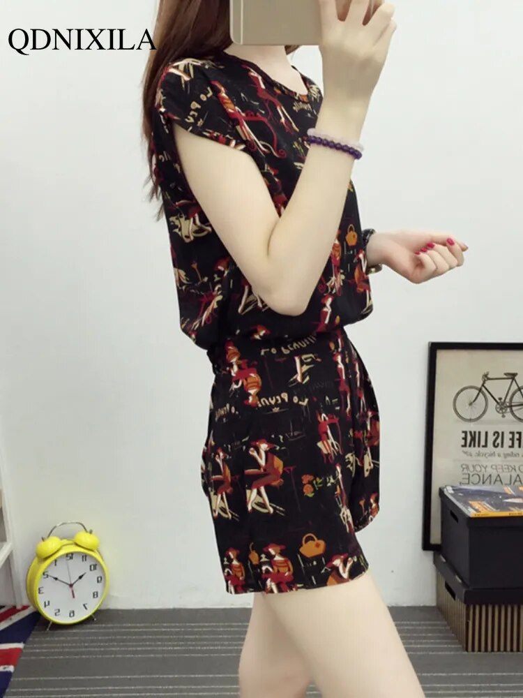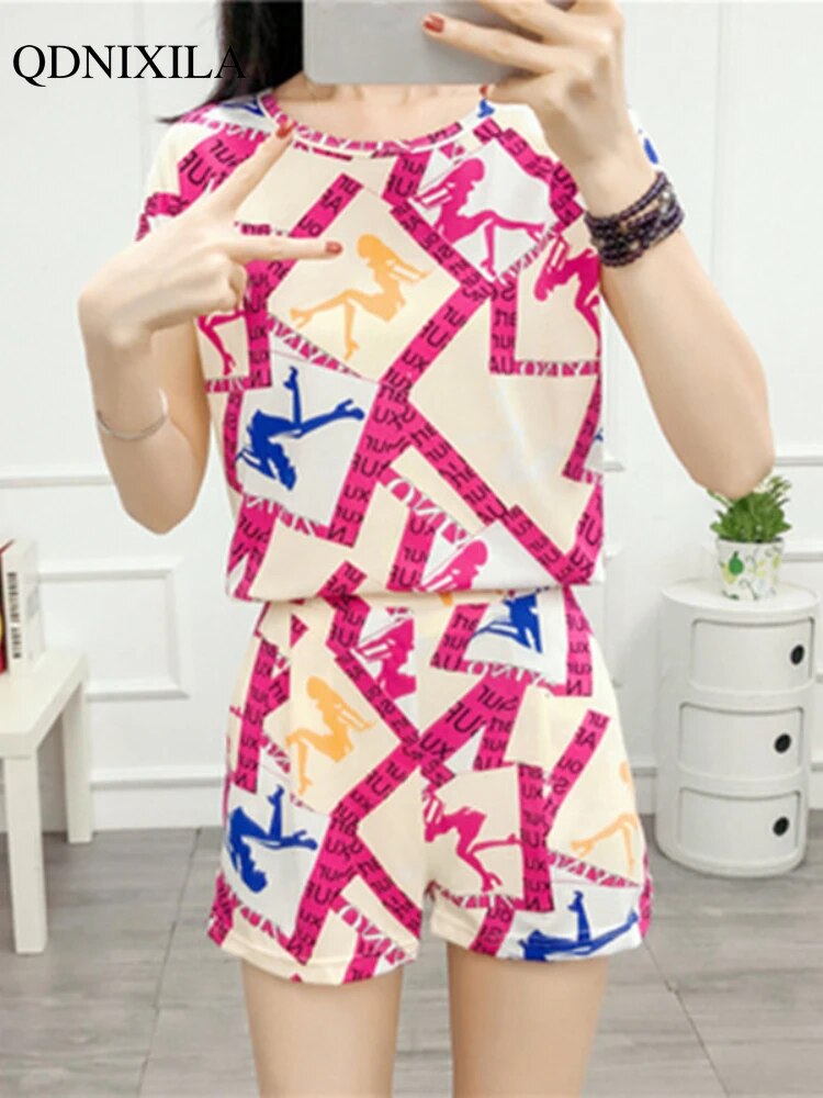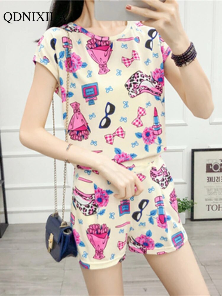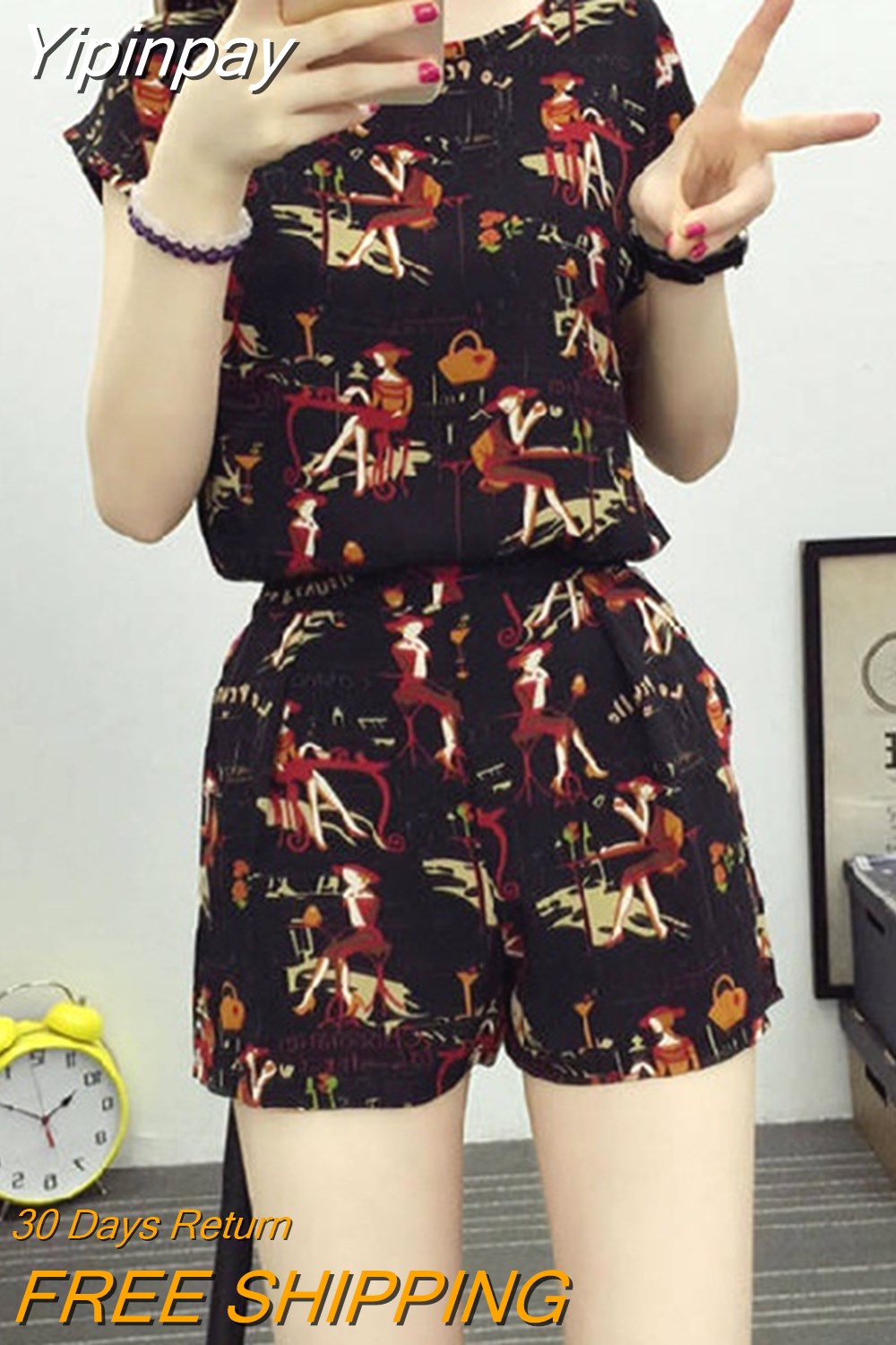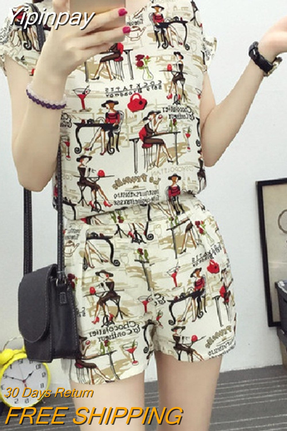Yipinpay Summer Loose Oversized Sweet Elegant Printed Women's Shorts Set Casual Fashion Short Sleeved Top T-shirt Shorts 2-piece Set