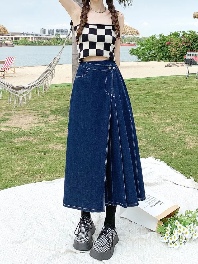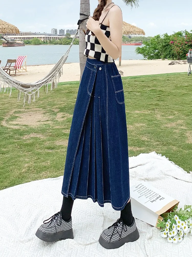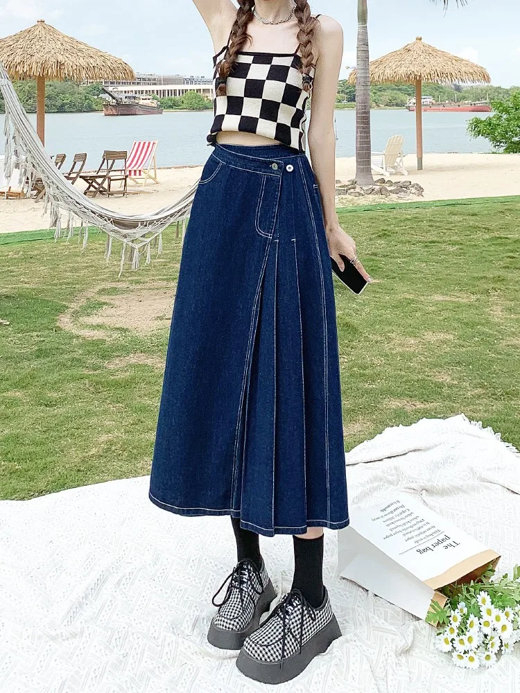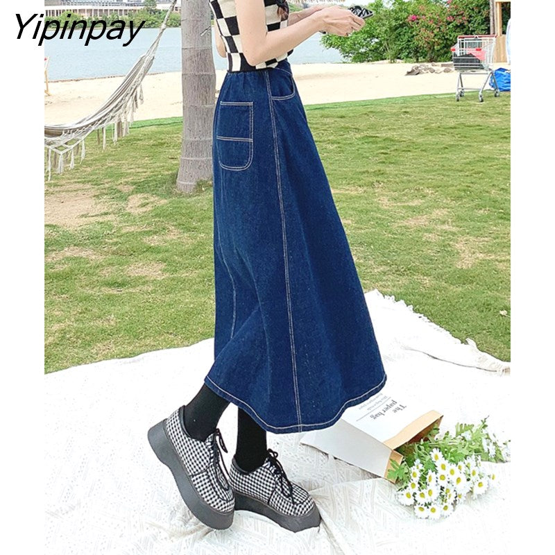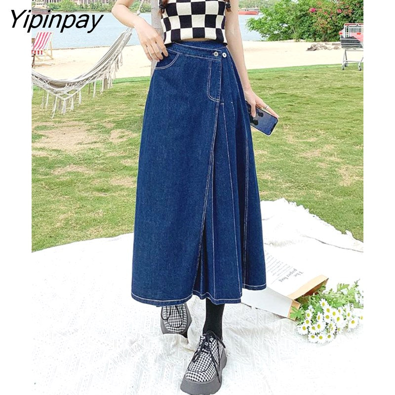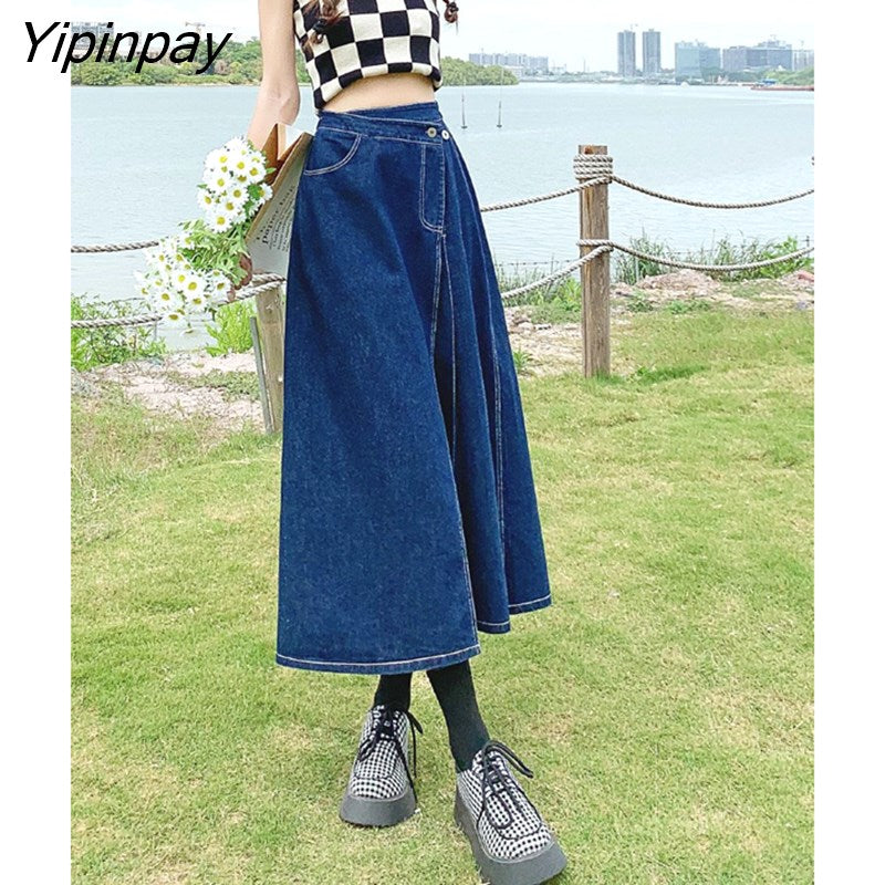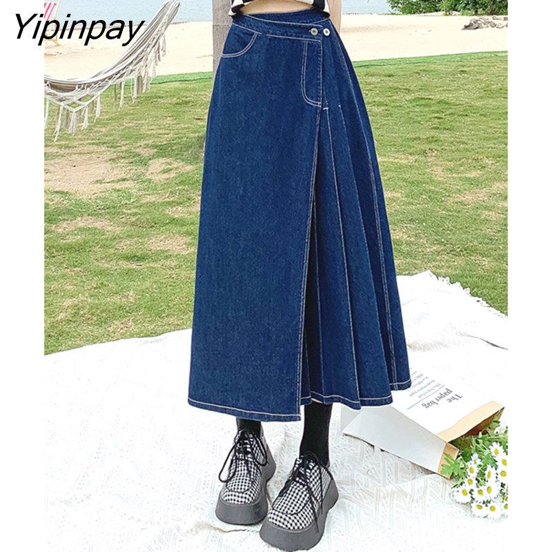 Yipinpay Summer Mid-length Denim Skirt Woman Pleated High Waist Thin A-line