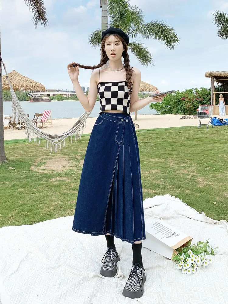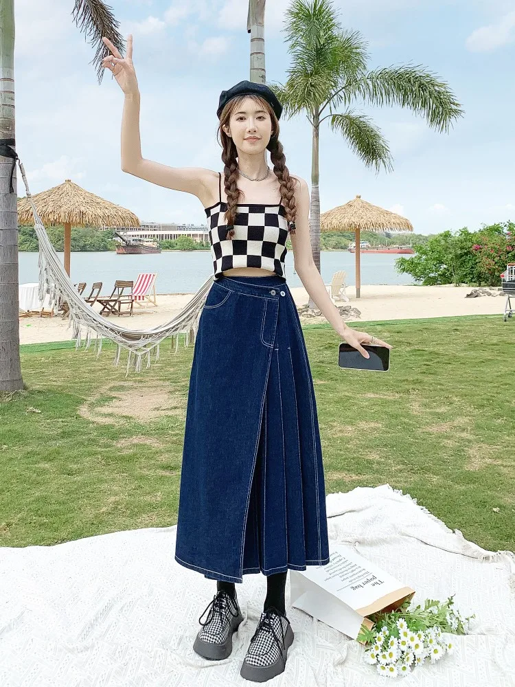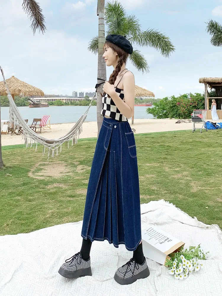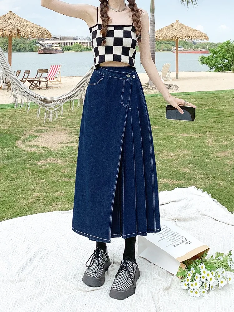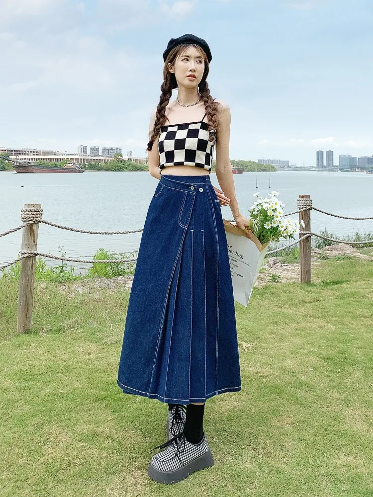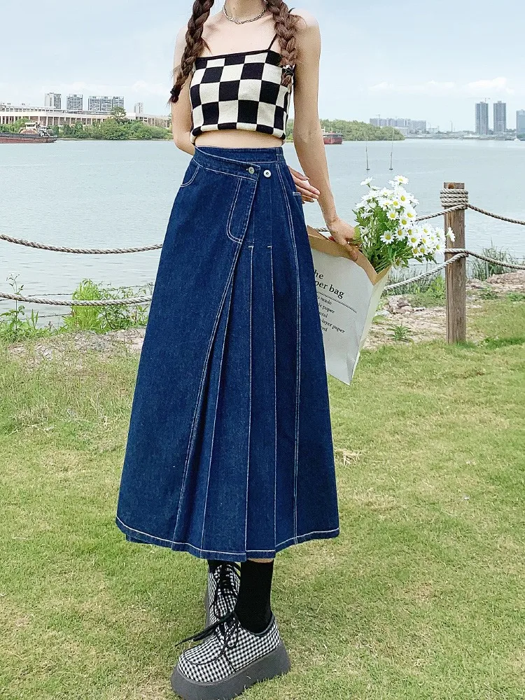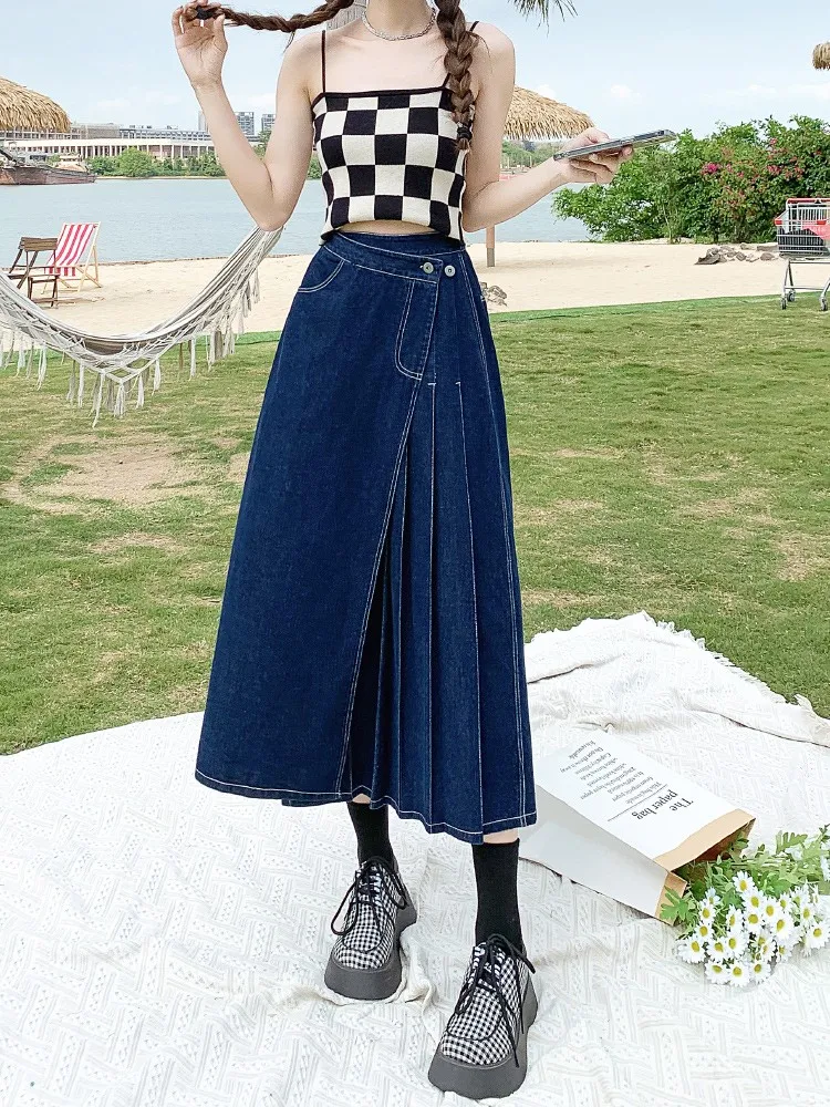 Yipinpay Summer Mid-length Denim Skirt Woman Pleated High Waist Thin A-line