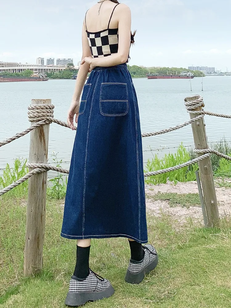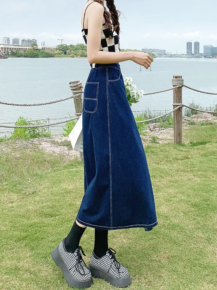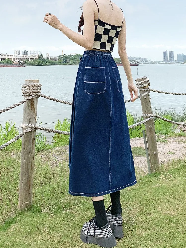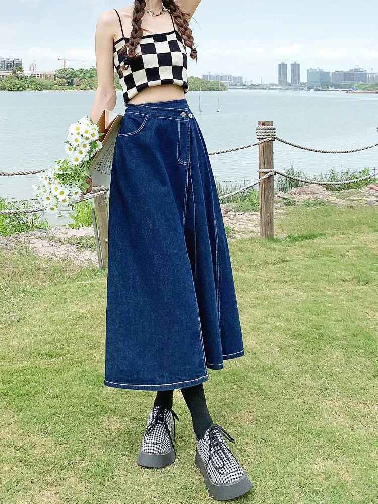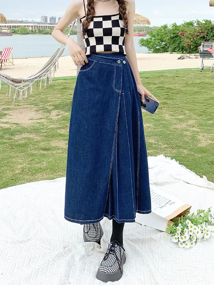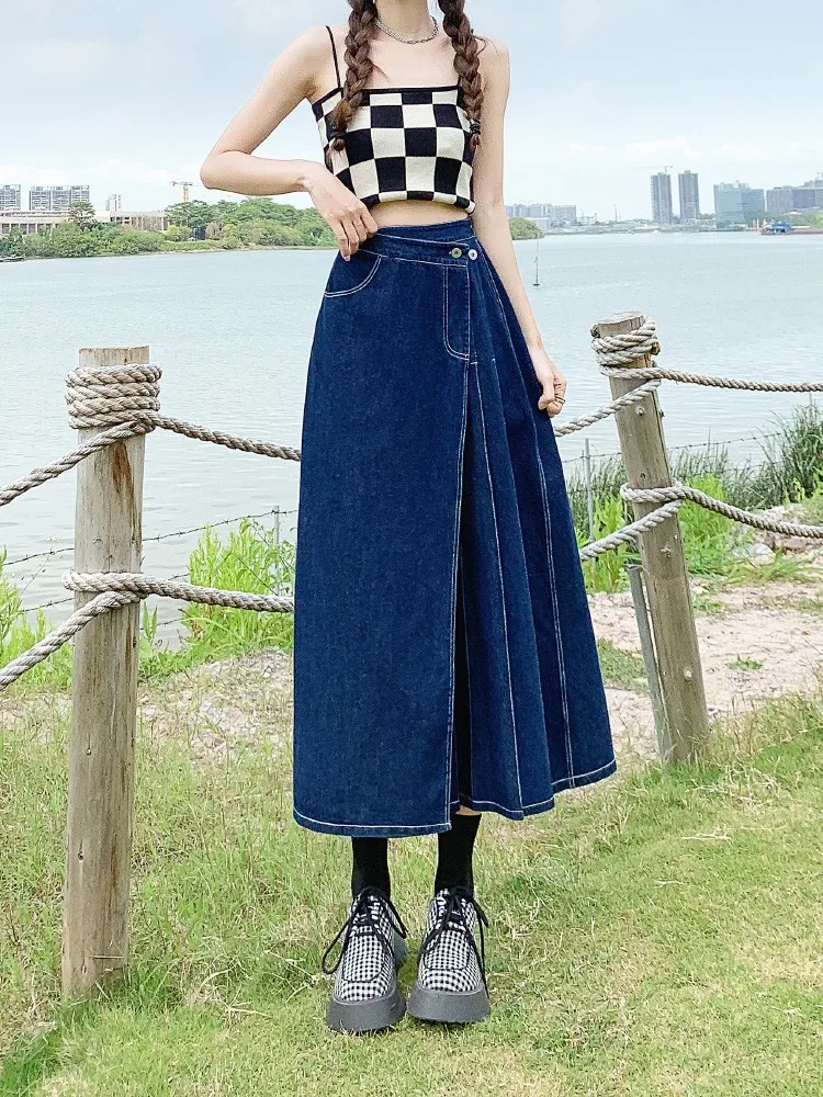 Yipinpay Summer Mid-length Denim Skirt Woman Pleated High Waist Thin A-line