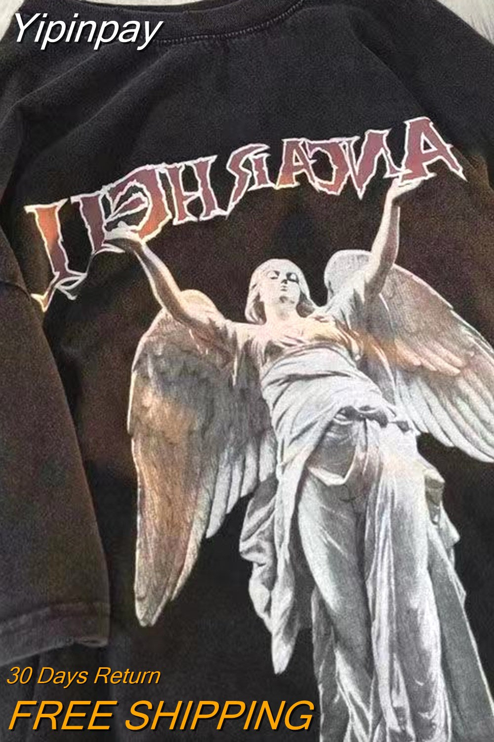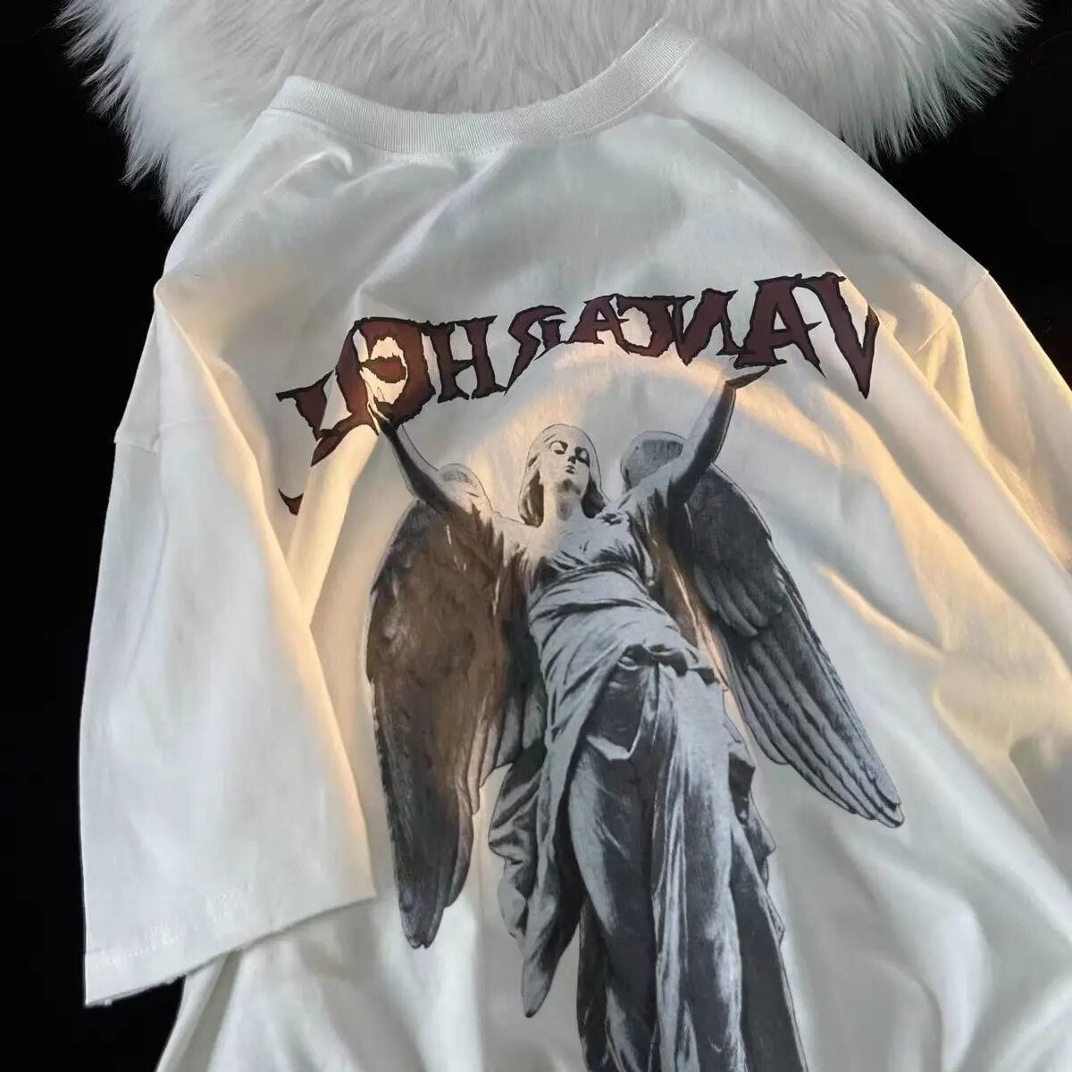 Yipinpay Summer New American Retro Angel Print Short Sleeve T-Shirt Women Street Trend Round Neck T-Shirt Couples Loose Casual Tops