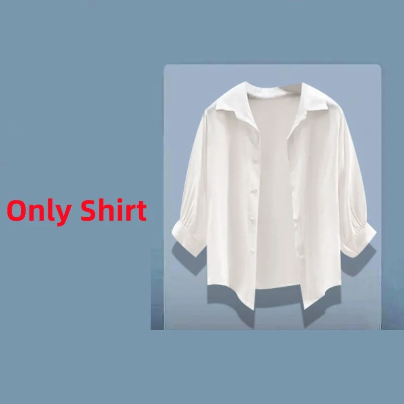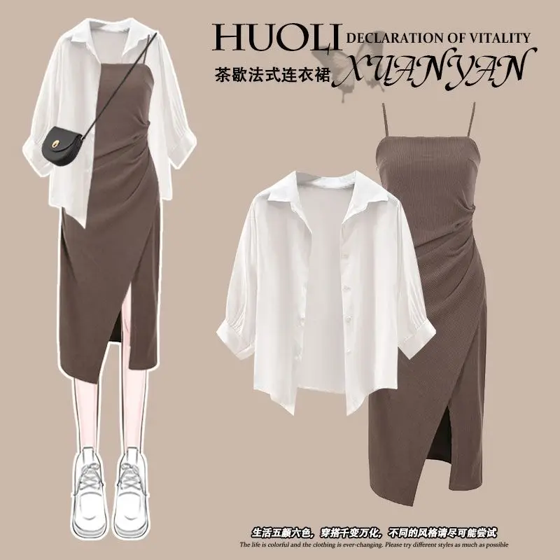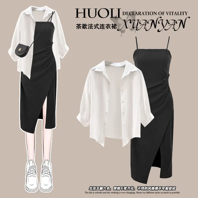 Yipinpay Summer New in Matching Set Women's Fashion Sunscreen Shirt+Strap Dress Two Piece Set Korean Chic Elegant Midi Skirt Suit