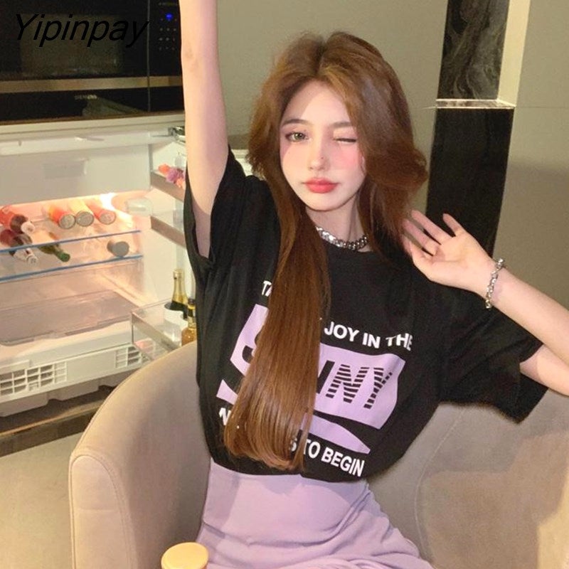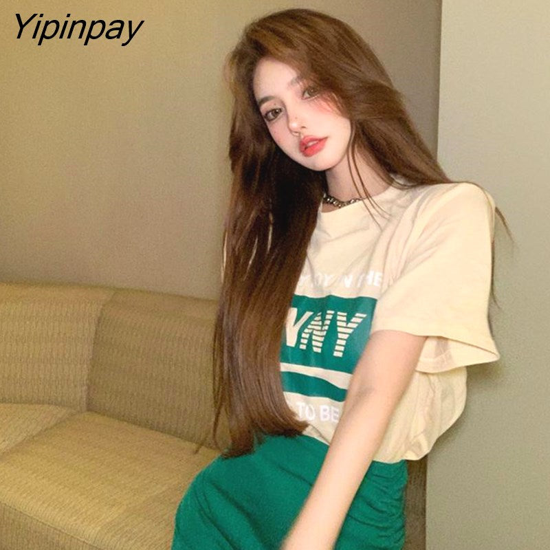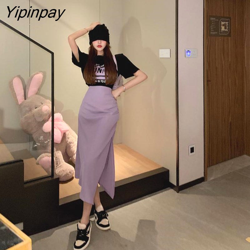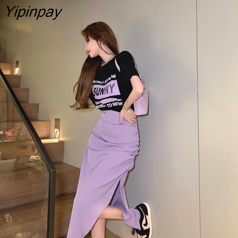 Yipinpay Summer New Two-piece Suit Loose Casual Print T-shirt And High Waist Slit Skirt 2 Piece Set Women