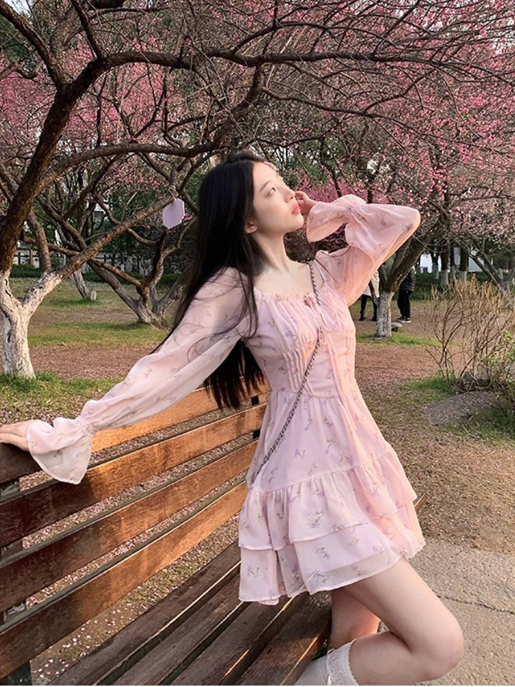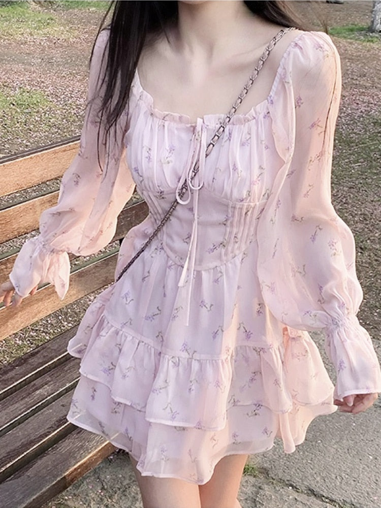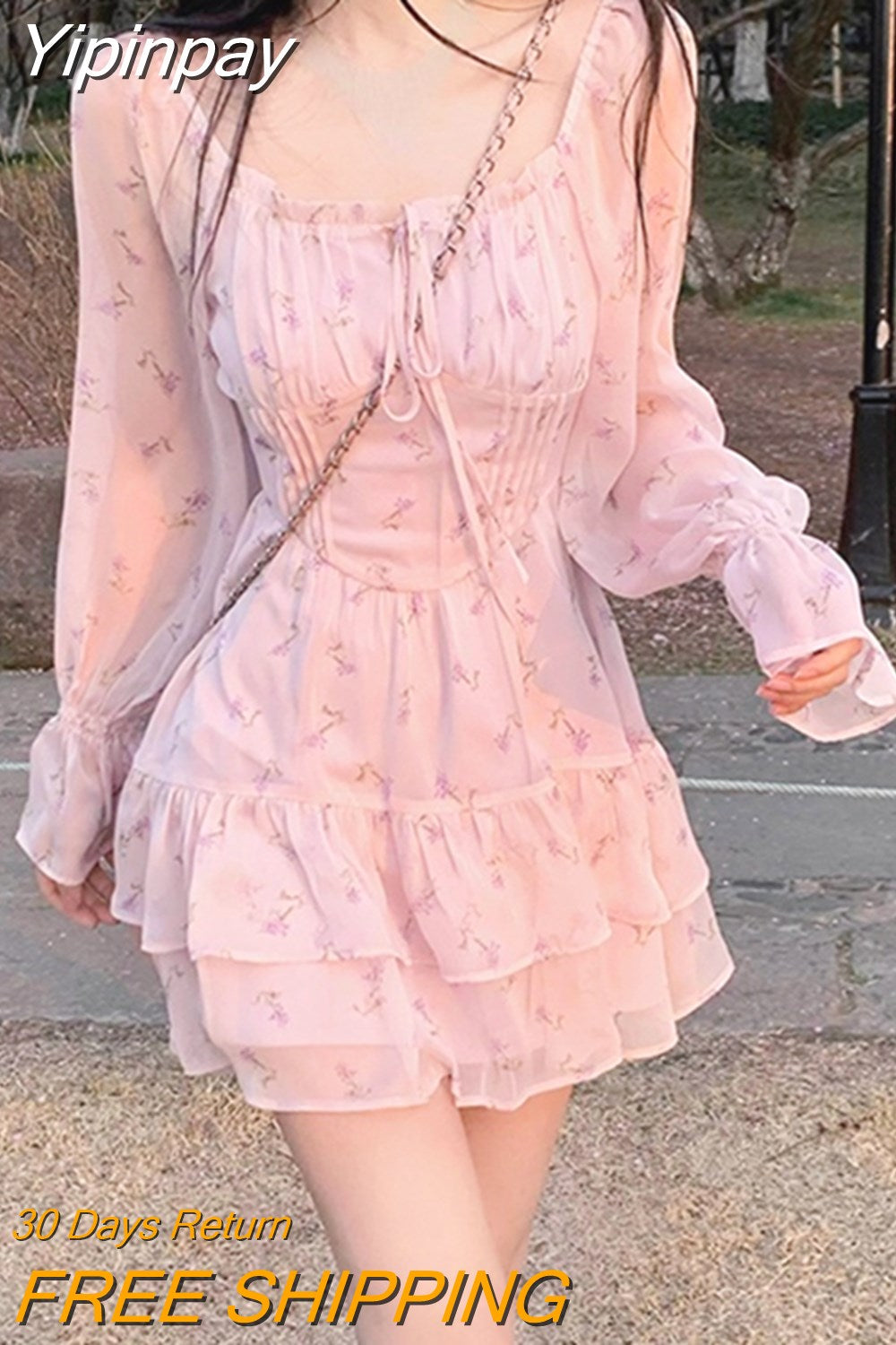 Yipinpay Summer Pink Floral Y2k Mini Dress Woman Sweet One Piece Dress Korean Fashion Chiffon Long Sleeve Short Party Dress Beach