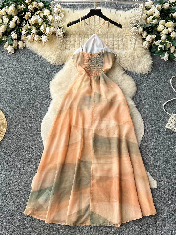 Yipinpay Summer Print Chiffon Long Dress Women Halter Elastic A Line Split Sexy Sundress Korean Tie Dye Backless Beach Dress