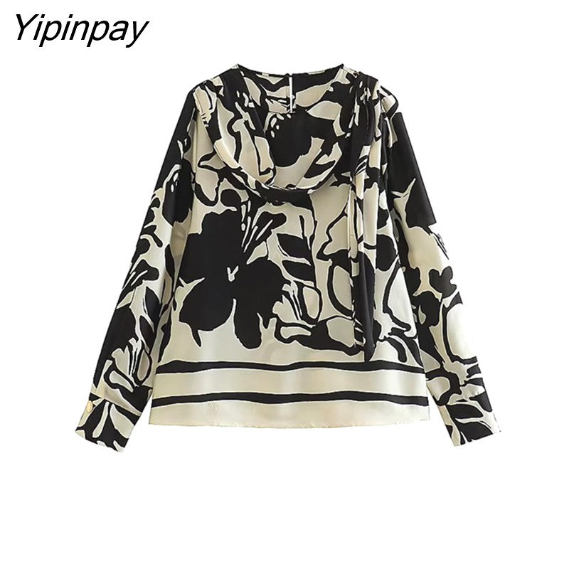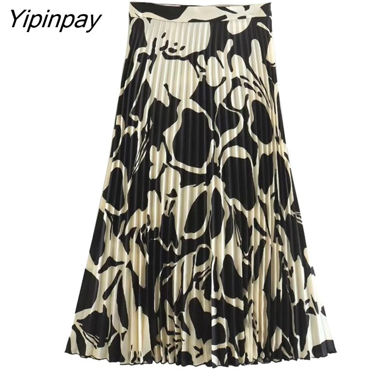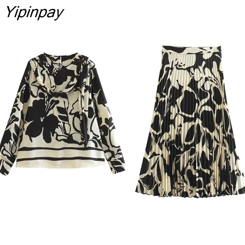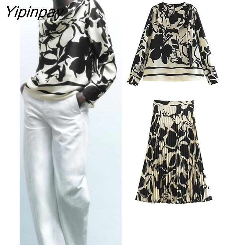 Yipinpay Summer Women Chain Skirt Sets Fashion Long Sleeve Printed Shirts High Waist Straight Elastic Pleated Skirts Casual Outwear