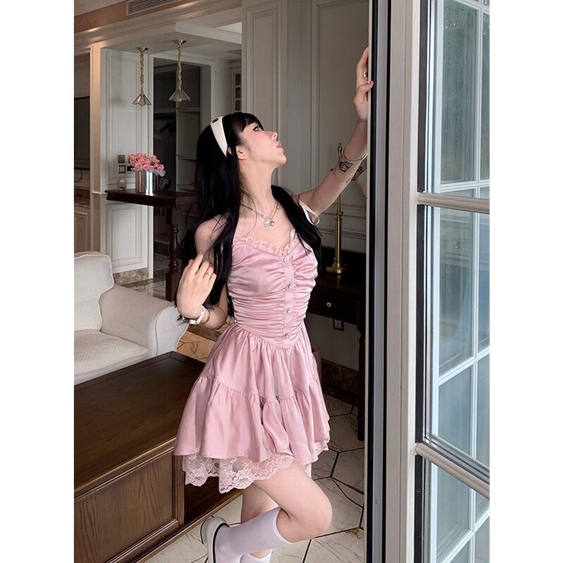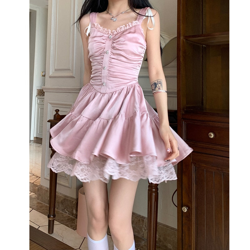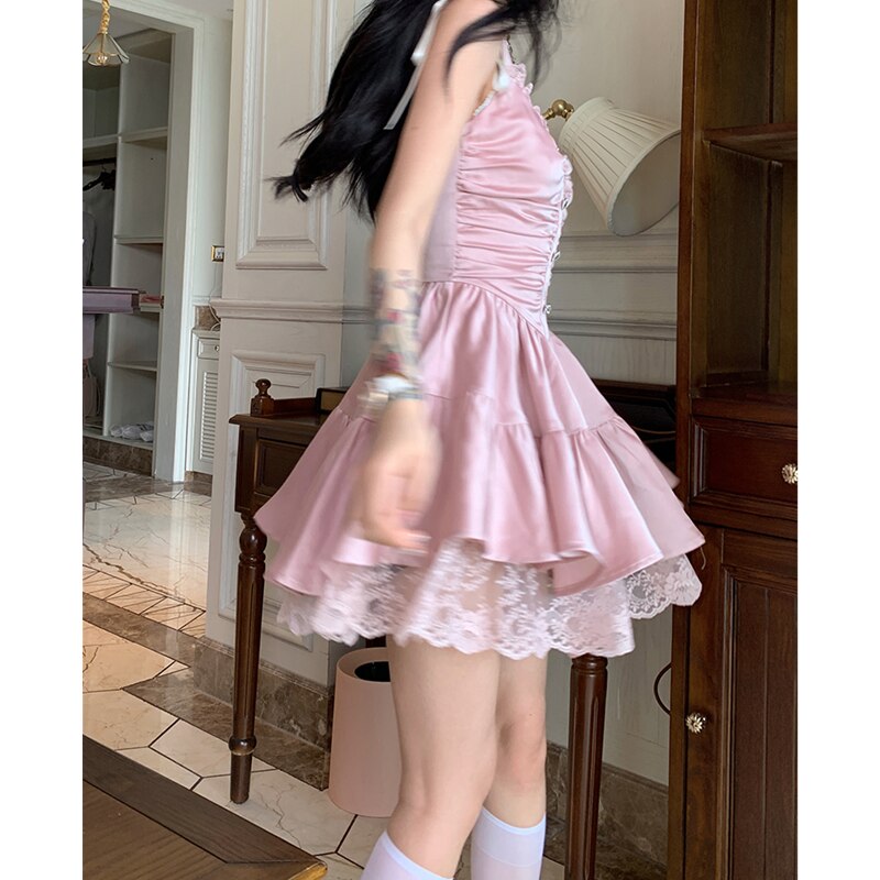 yipinpay Summer Women Suspender Pink Dress Sleeveless Holiday Style Puffy Skirt Fashion Satin Wrinkle Ballet Style Short Skirt Dress