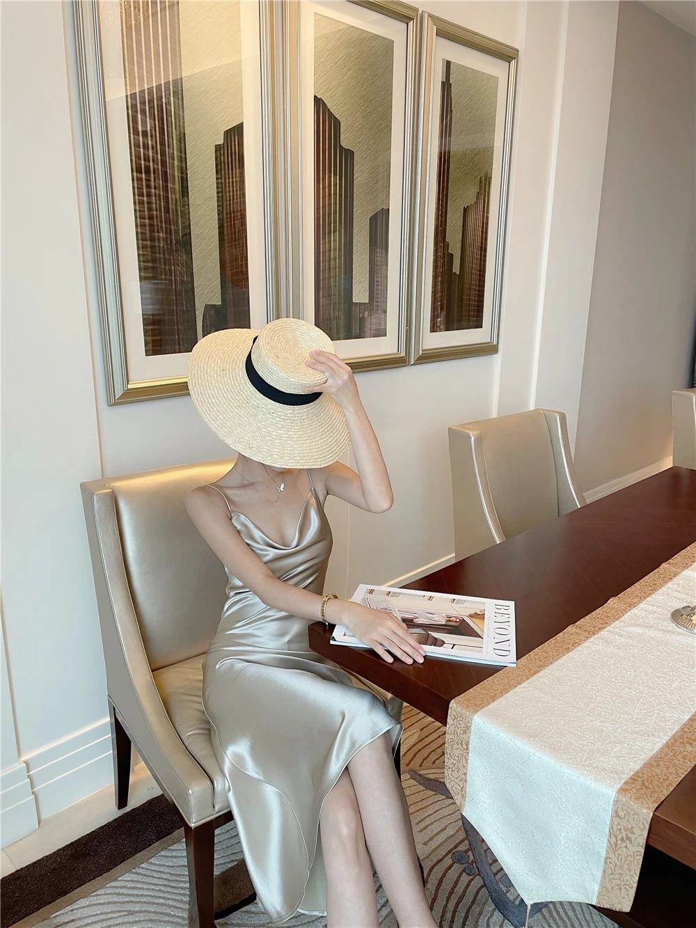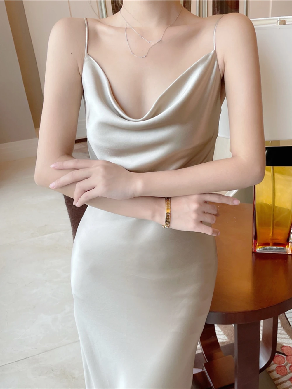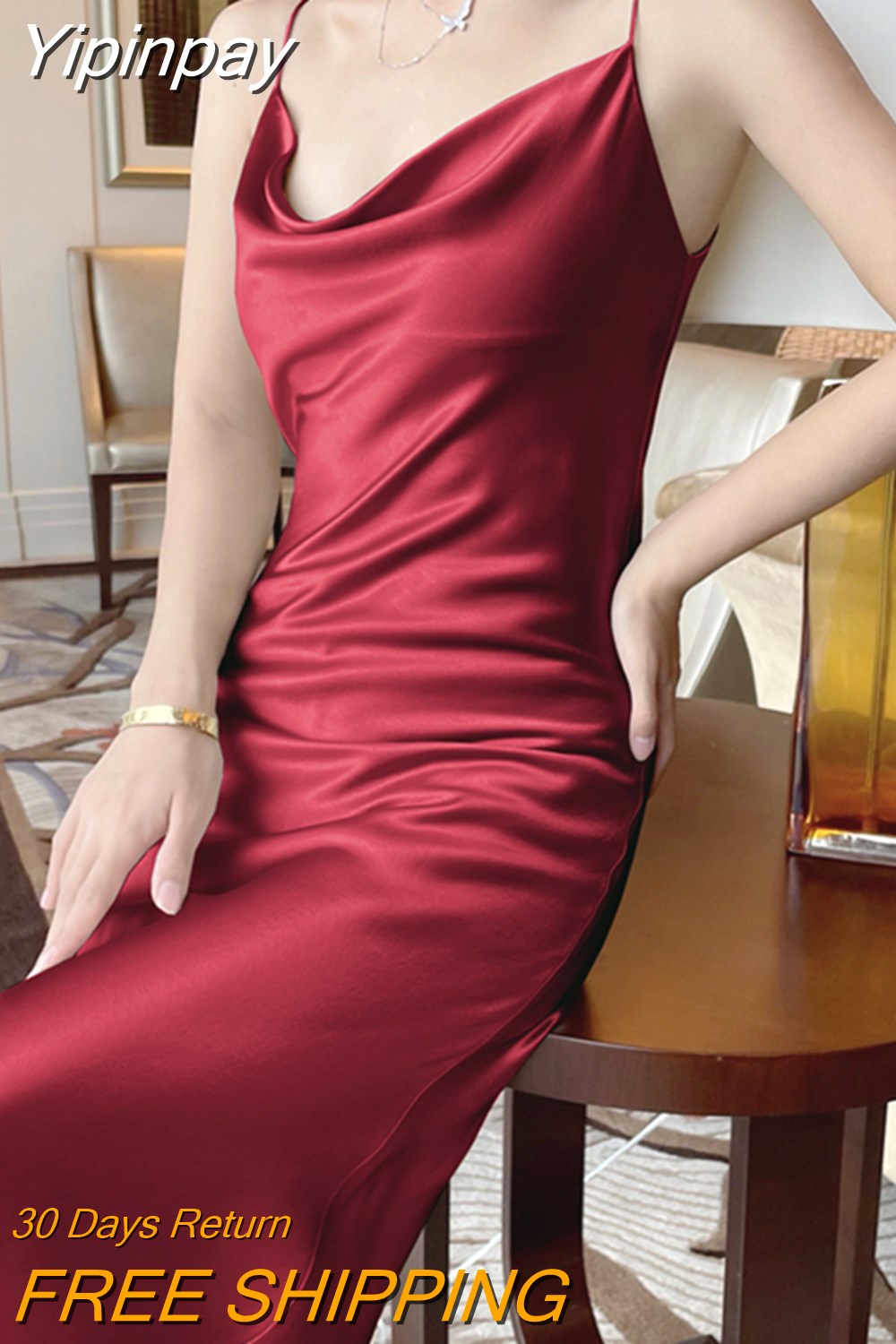 Yipinpay Summer Women's Dress Satin Swinging Collar French Designer Chic Elegant Fashion Casual Evening Party Sexy Sling Dresses