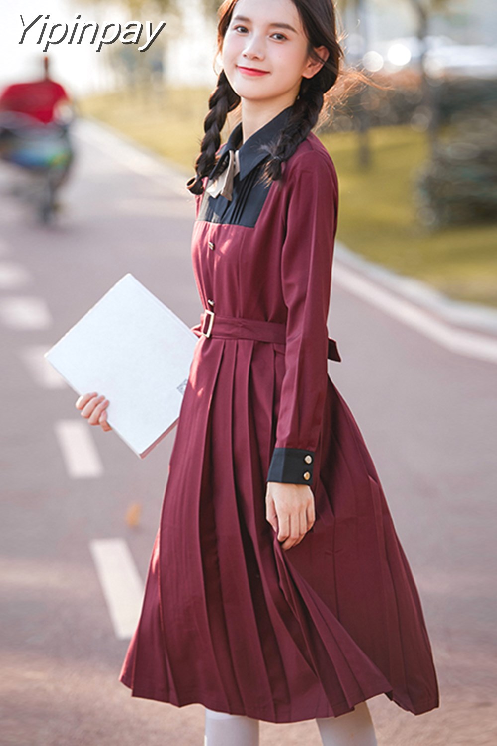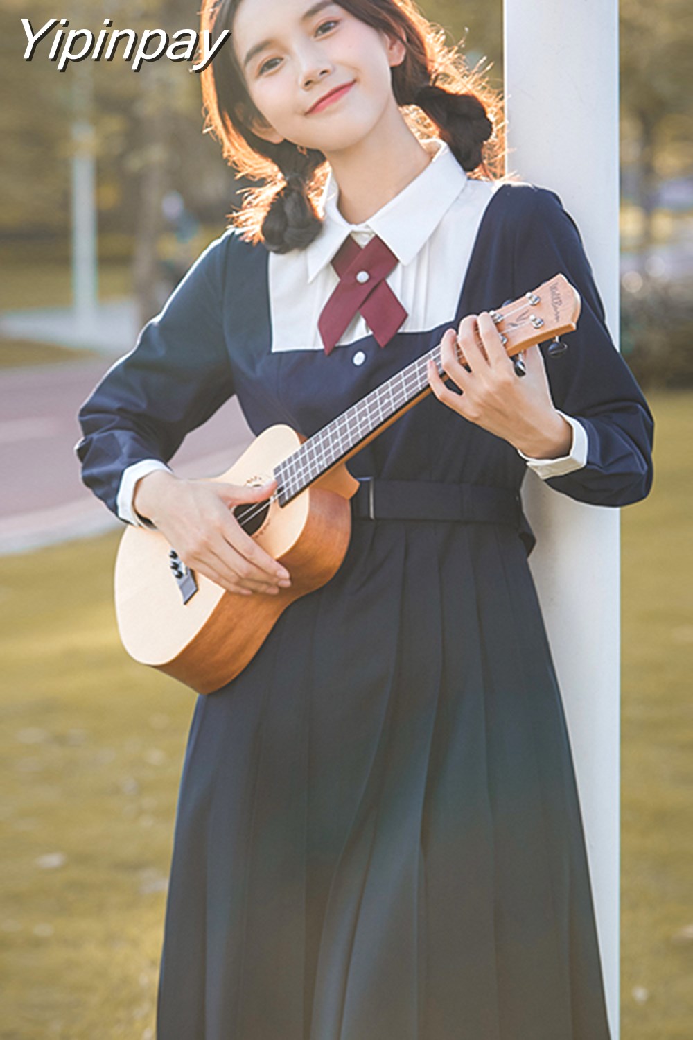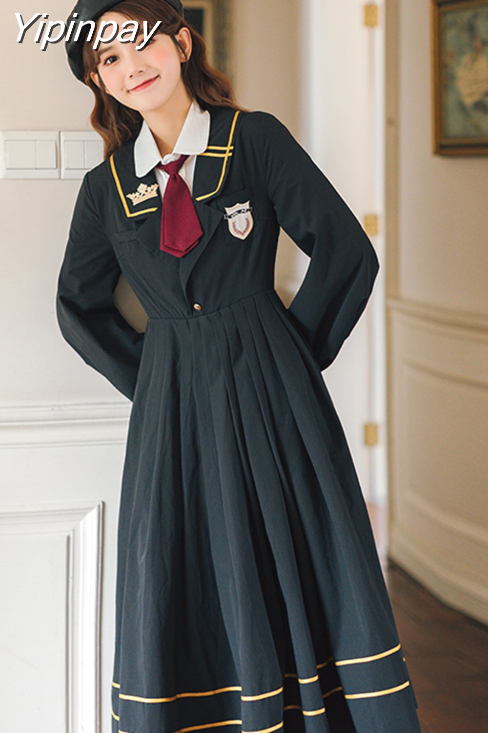 Yipinpay Sweet Autumn Women Pleated Dress JK Student Uniform Preppy Style Retro Embroidery Female Dresses 2023 HOT High Waist