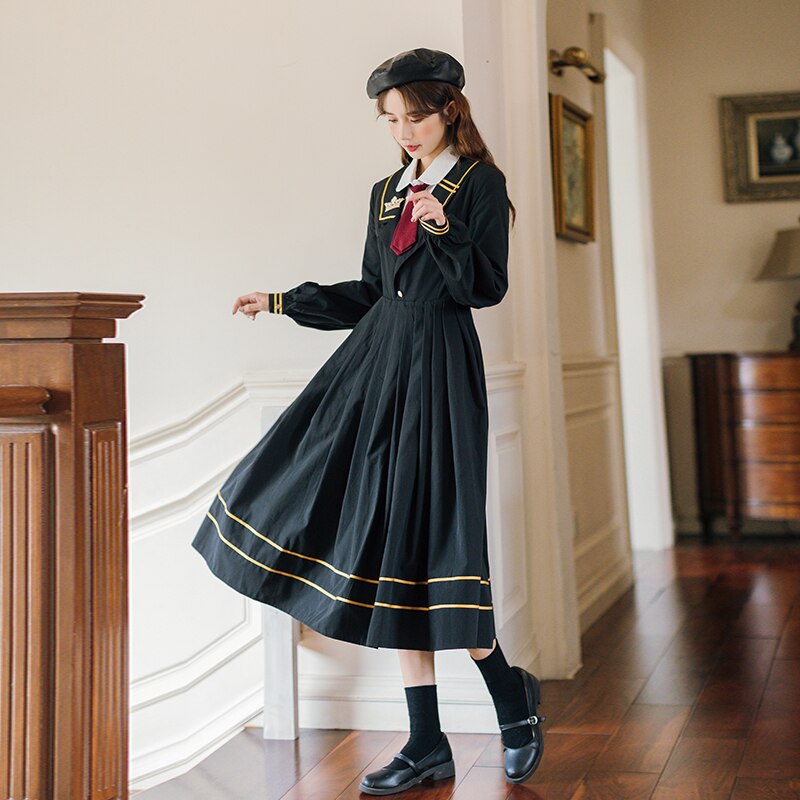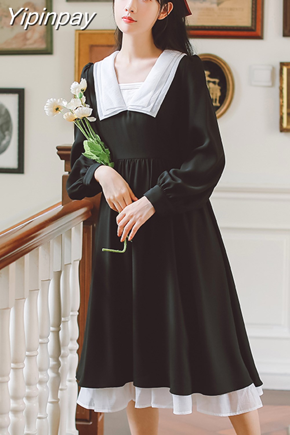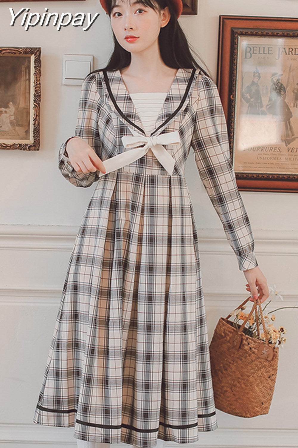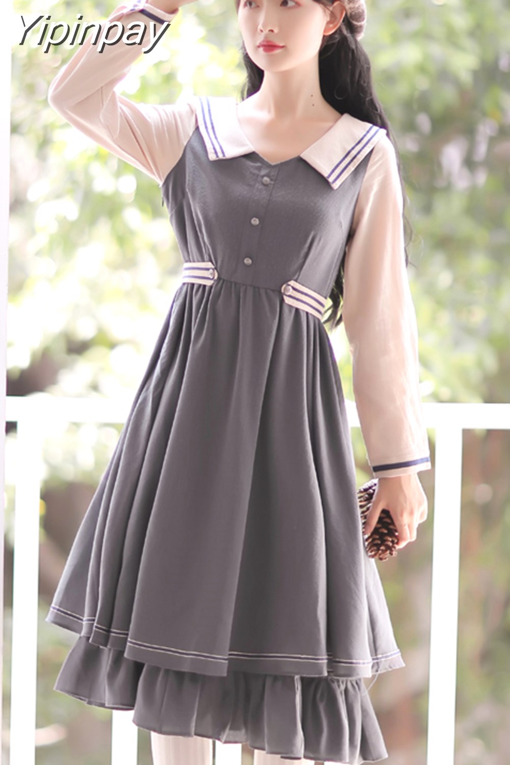 Yipinpay Sweet Autumn Women Pleated Dress JK Student Uniform Preppy Style Retro Embroidery Female Dresses 2023 HOT High Waist