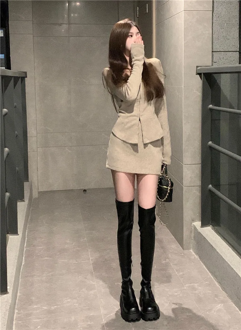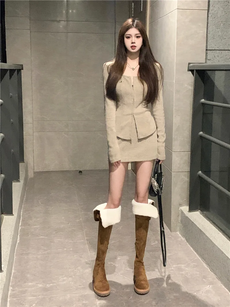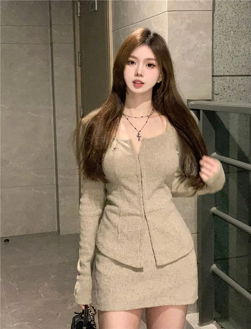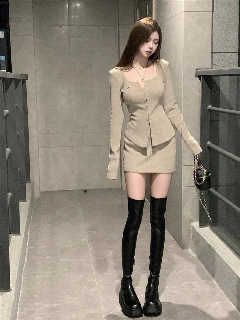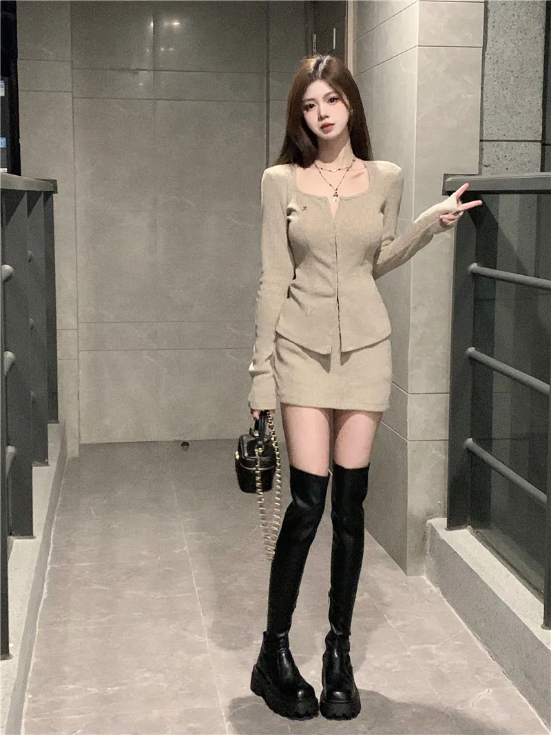 Yipinpay Sweet Hot Girl Suit Women's Autumn Square Collar Long-sleeved Knitted Shirt High Waist Short Skirt Fashion Two-piece Set