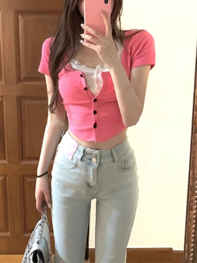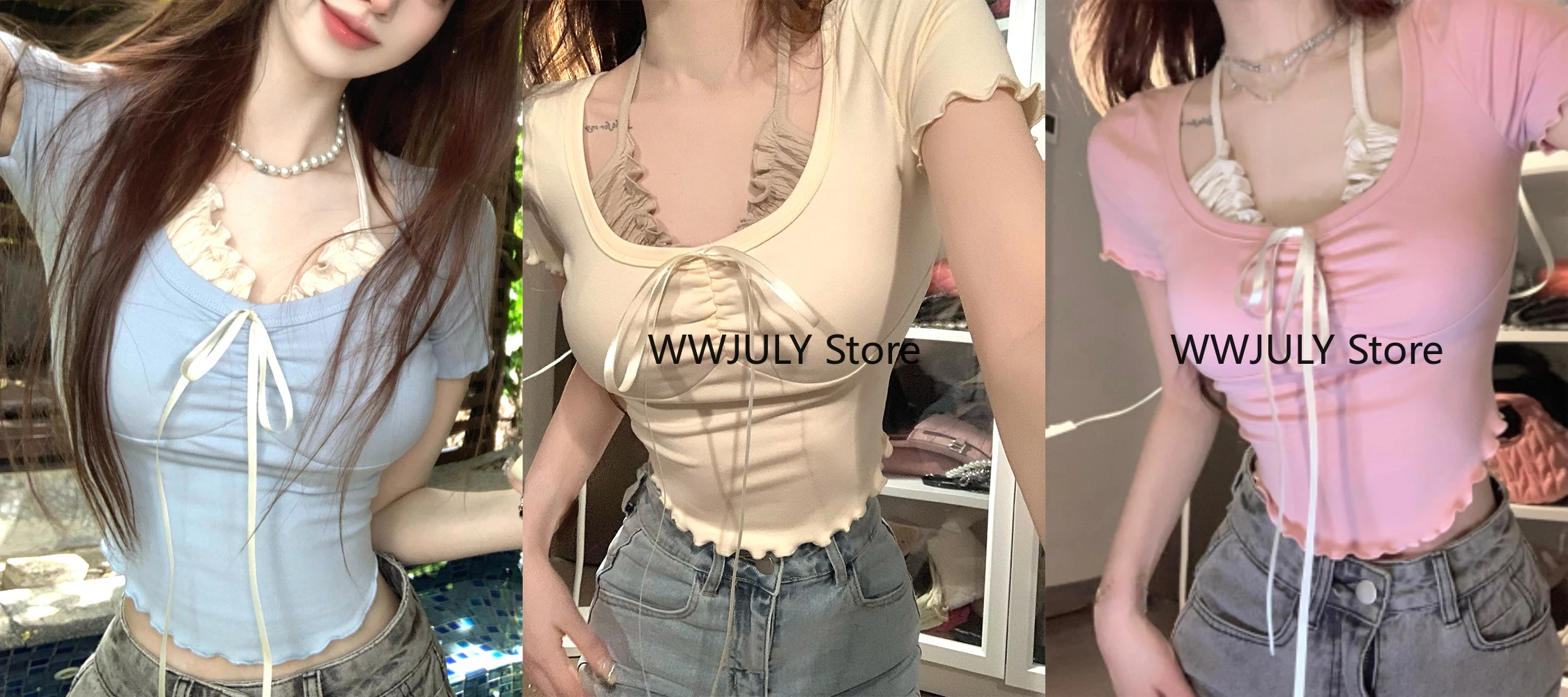Yipinpay Sweet Slim Blouse Women 2024 Summer Short Sleeve Bodycon Y2k Crop Tops Basic Korean Style Fashion Fake Two T Shirt Casual