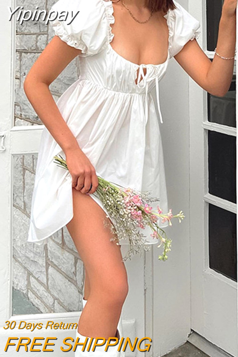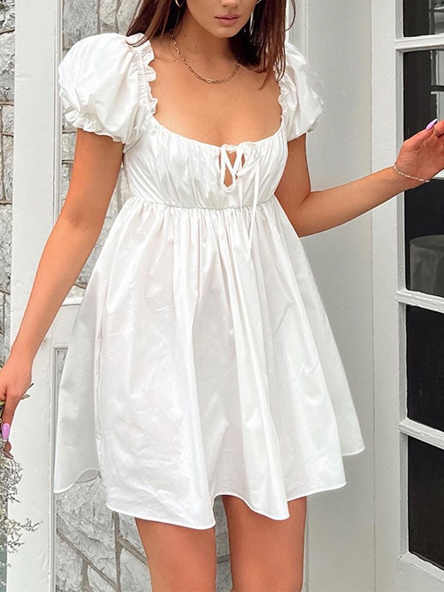 Yipinpay Sweet White Short Puff Sleeve Short Dress Elegant Summer Women Girls Square Neck Ruffles Trim Tie-Up A-Line Dress
