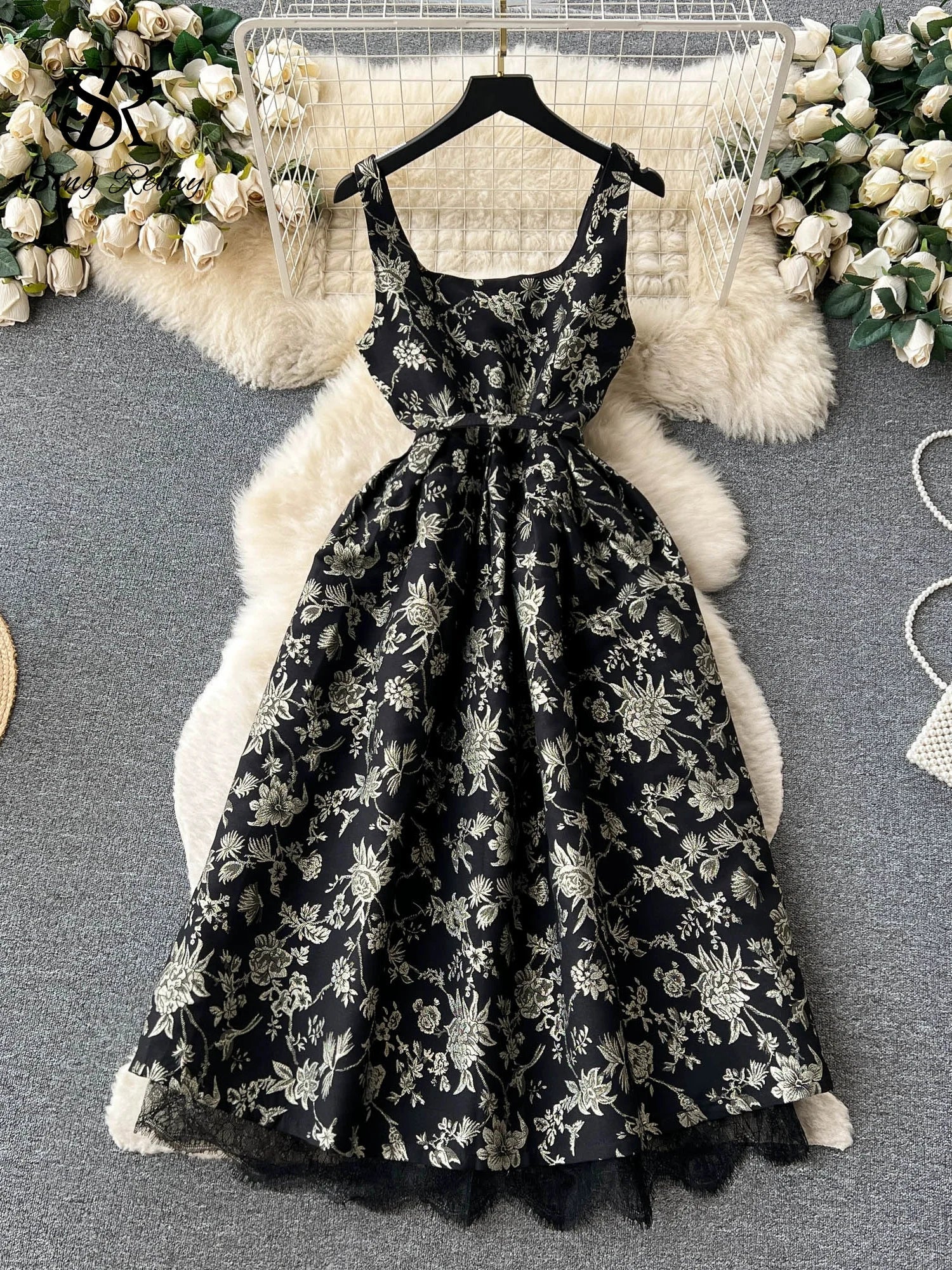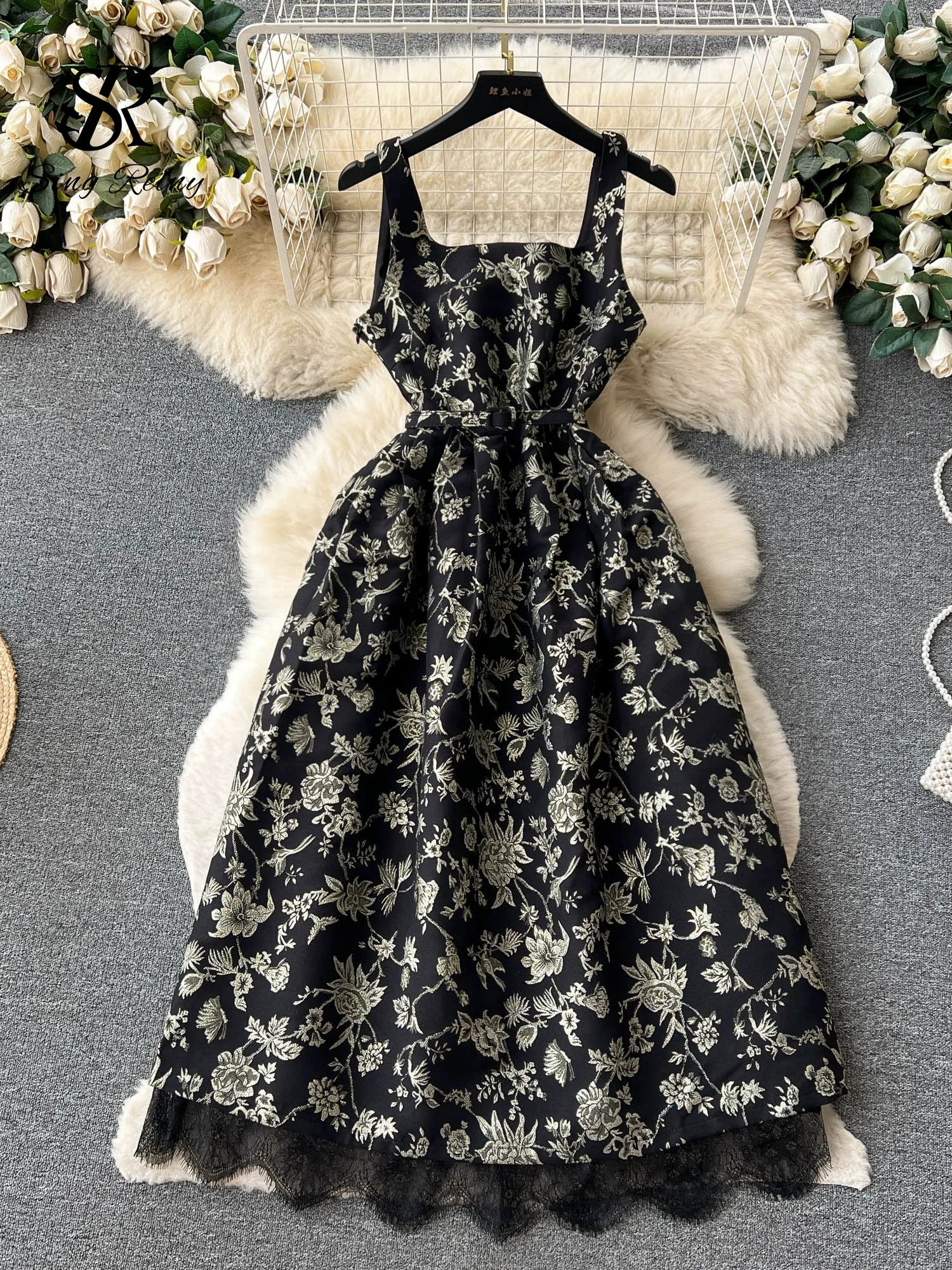 Yipinpay Temperament Embroidery Lace Dress Women Zipper Belt Off Shoulder Sleeveless French Floral Spaghetti Strap Long Dress