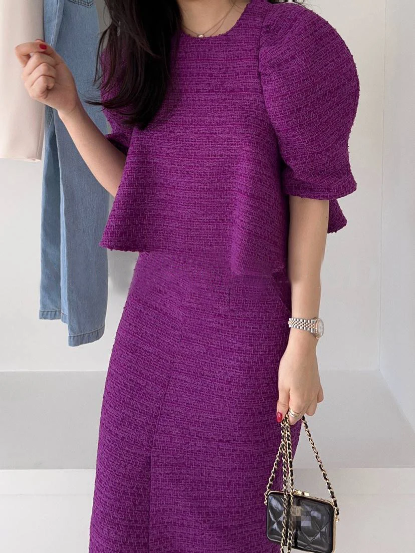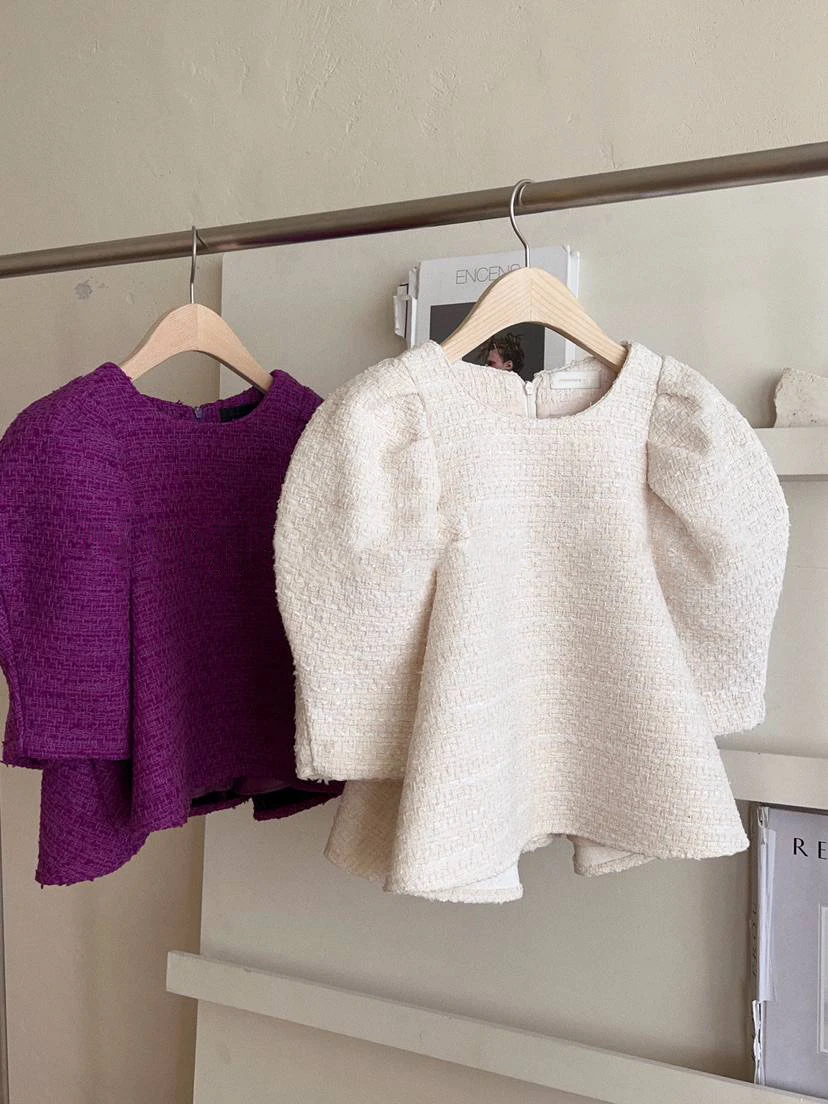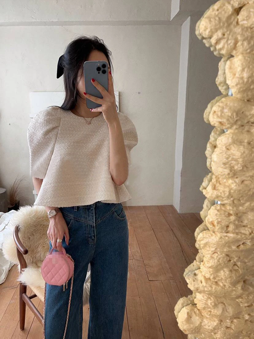 Yipinpay Temperament Zipper Round Puff Sleeve Top Crop Tweed Shirts Women Blusas Mujer De Moda 2023 Fall Elegant Blouse