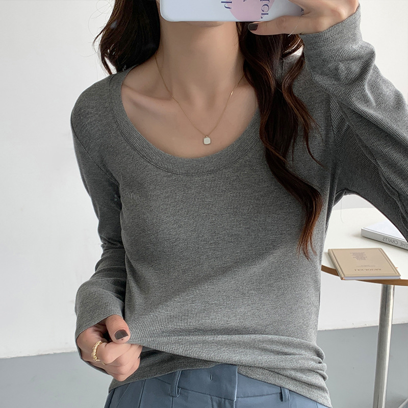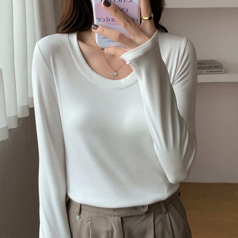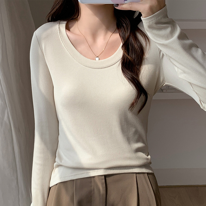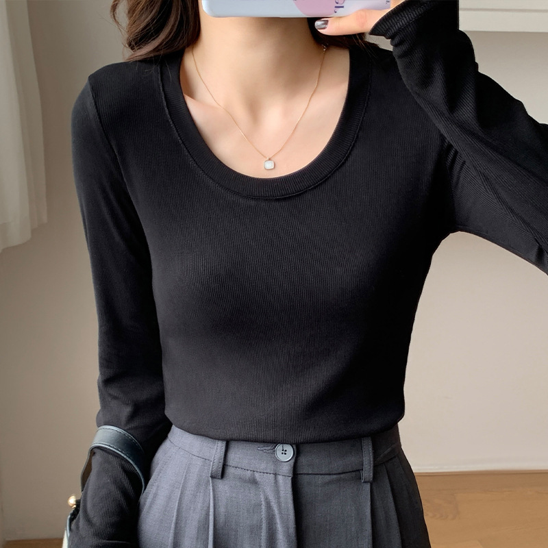 Yipinpay Threaded U-Collar Long-Sleeved Bottomed Shirt In Early Autumn New Plain Color Simple And Slim Blouse