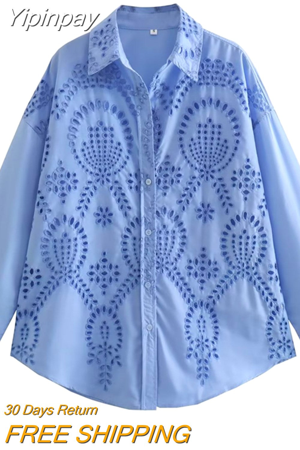 Yipinpay TRAF Fashion Embroidery Women's Shirt 2023 Summer Hollow Out Long Sleeve Blouse Top for Women Ladies Single-breasted Tops