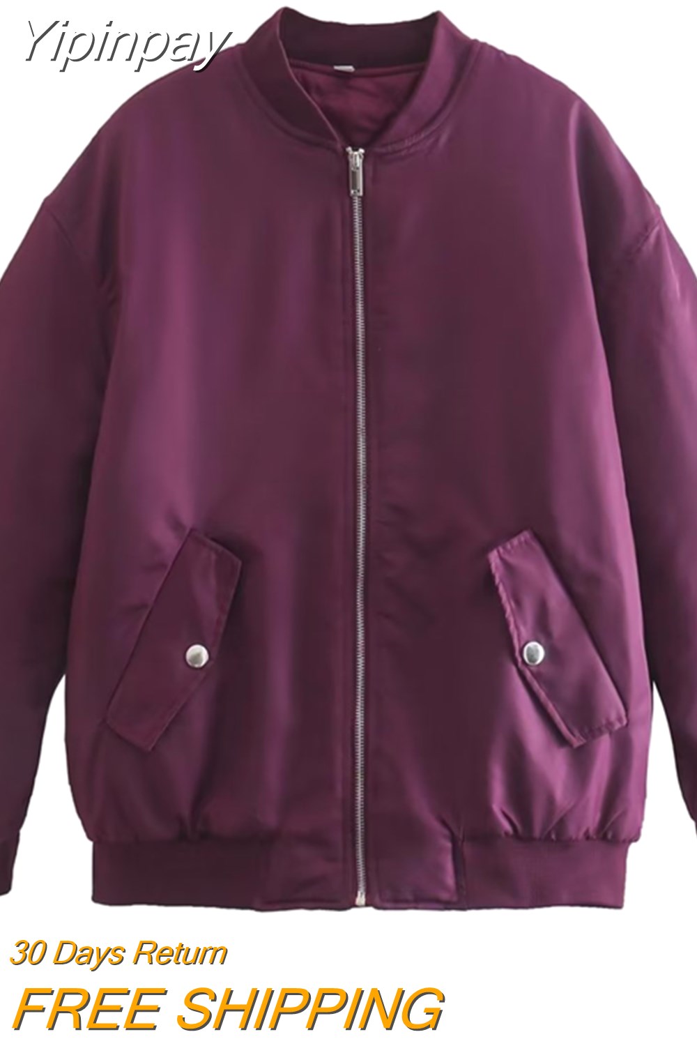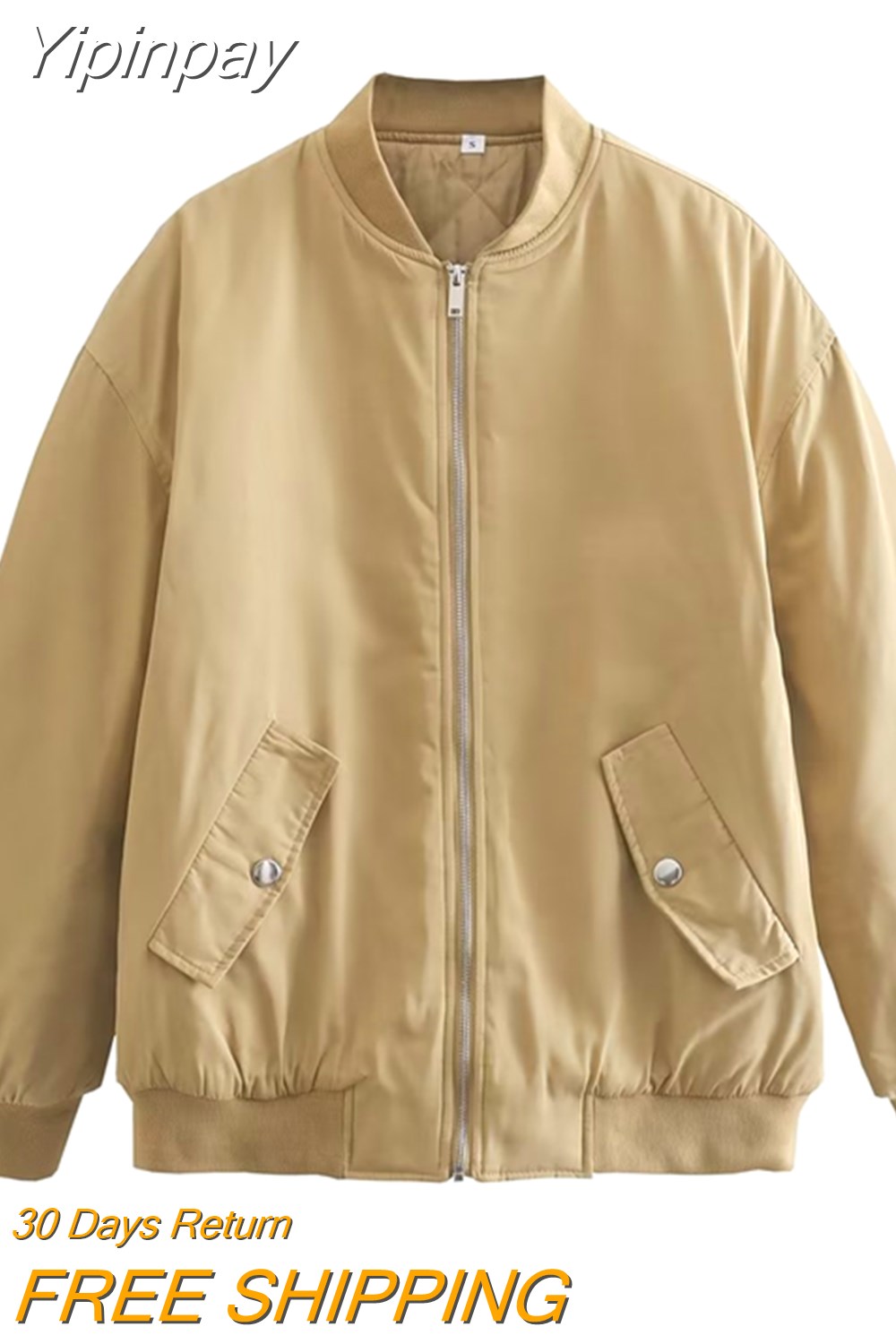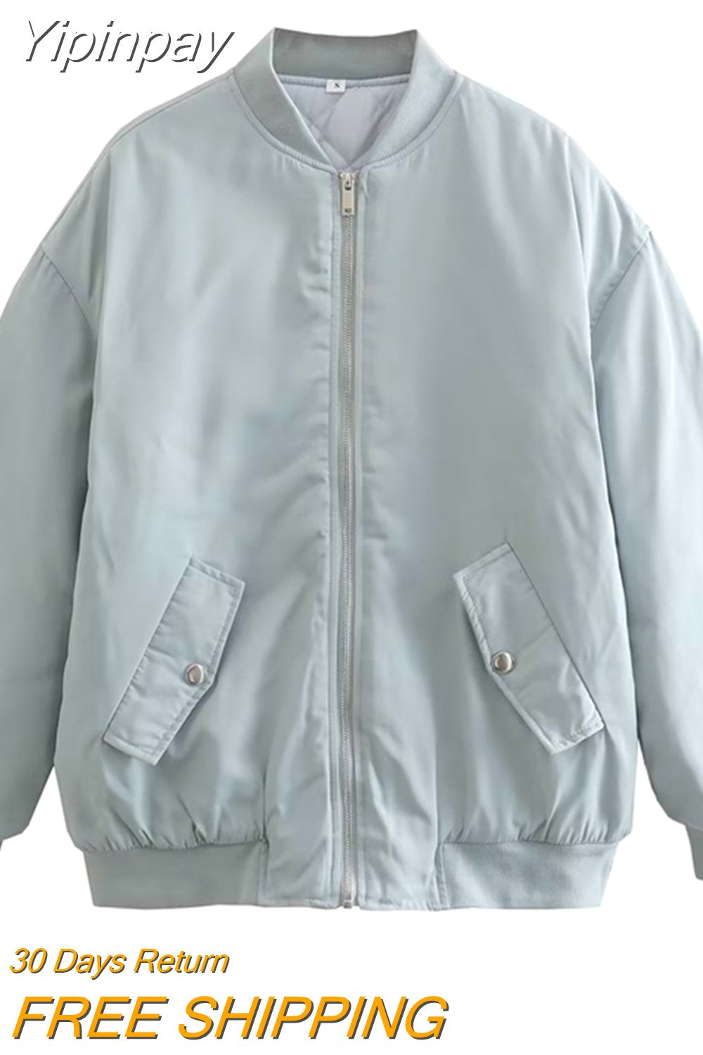Yipinpay TRAF Fashion Oversized Bomber Jackets for Women 2023 Winter Casual Coats Female Chic with Pockets Long Sleeves Outerwear