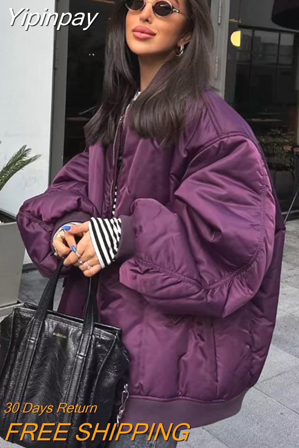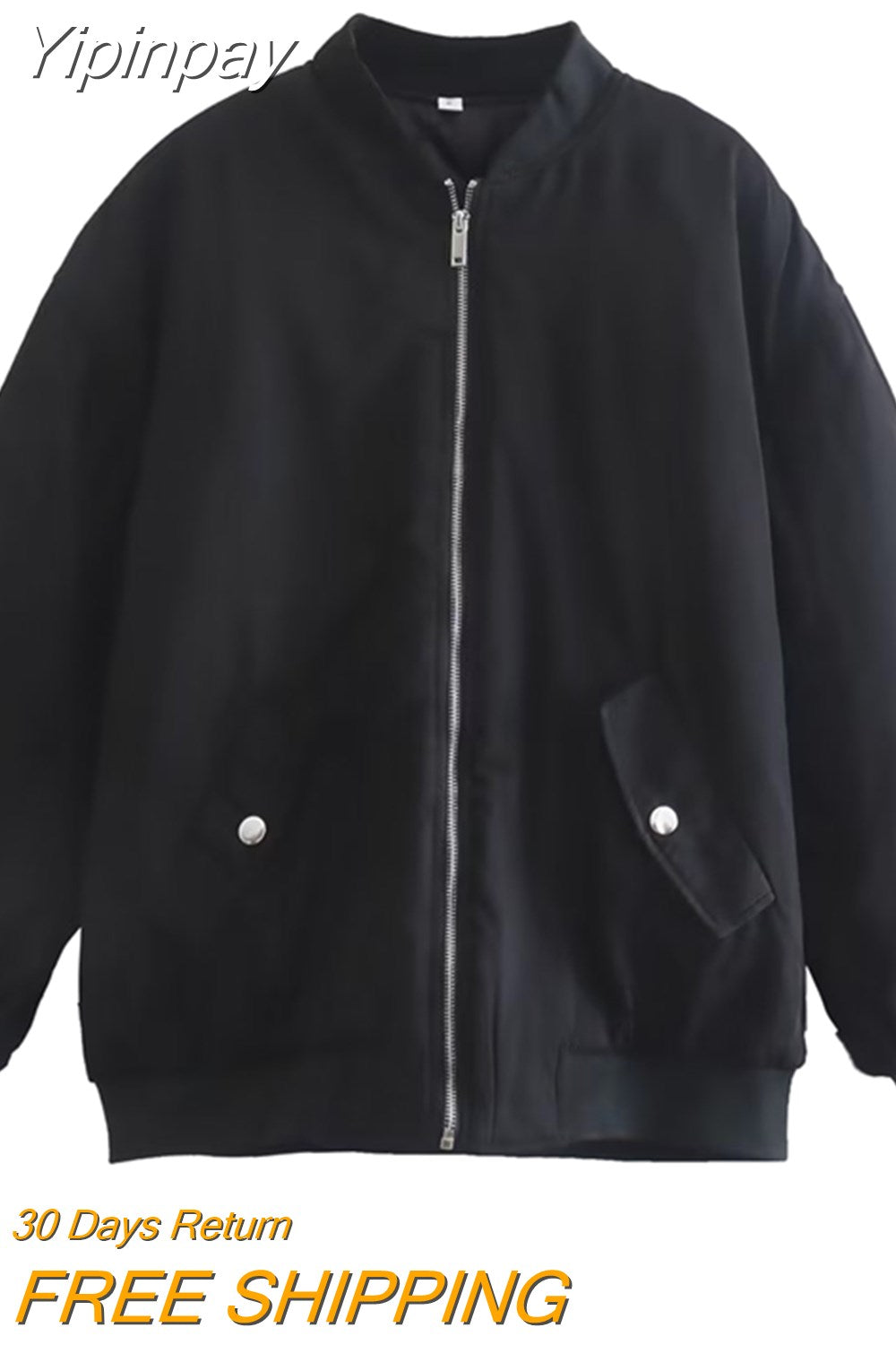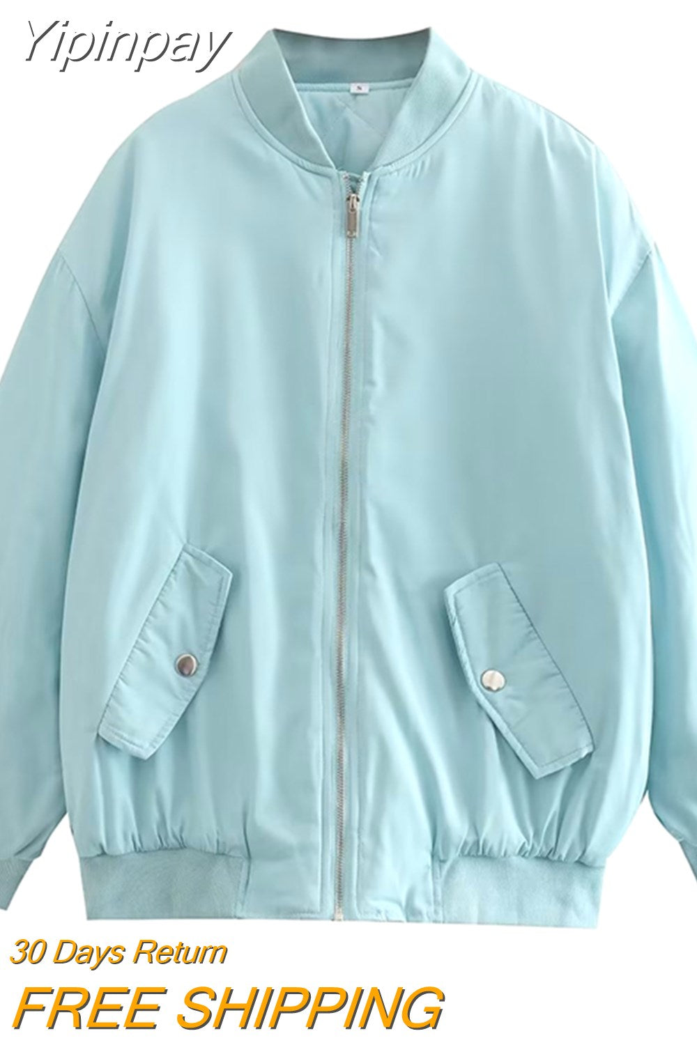 Yipinpay TRAF Fashion Oversized Bomber Jackets for Women 2023 Winter Casual Coats Female Chic with Pockets Long Sleeves Outerwear