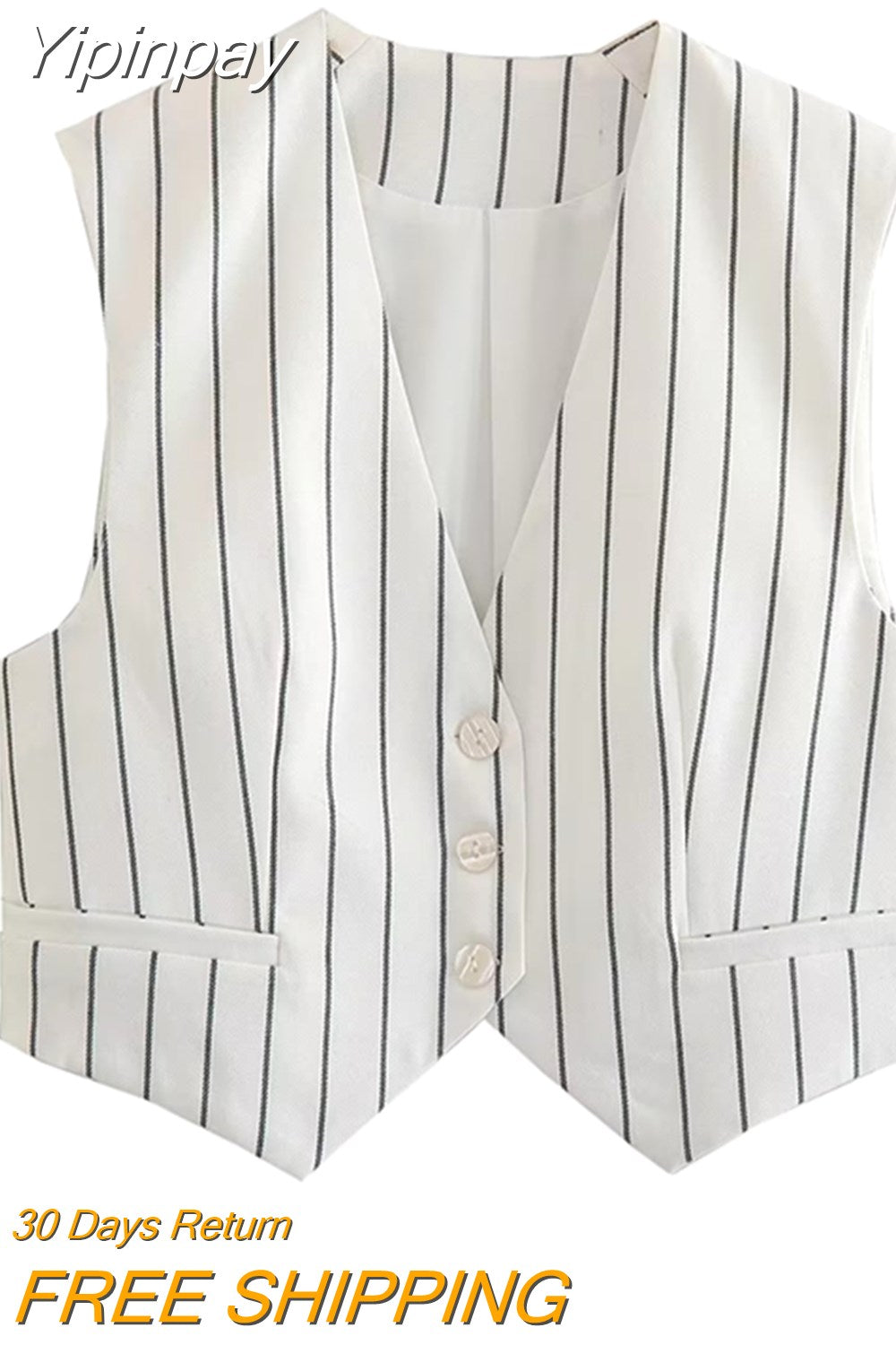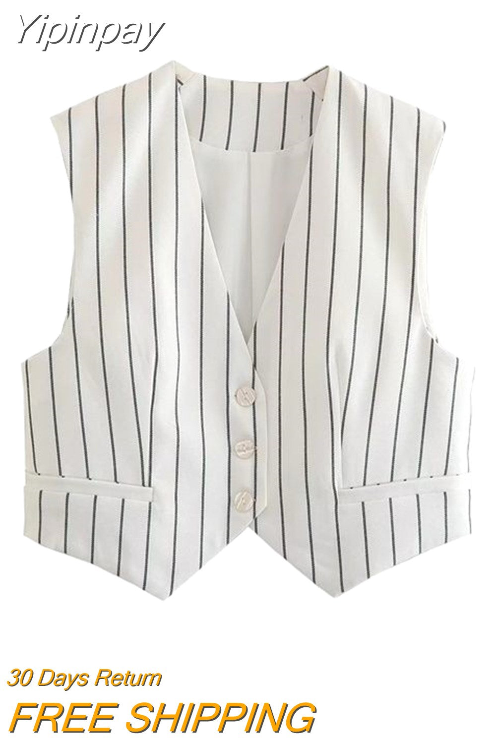 Yipinpay TRAF Fashion Striped Women's Vest 2023 Summer V-Neck Female Sleeveless Vests for Women Ladies Single-breasted Waistcoat