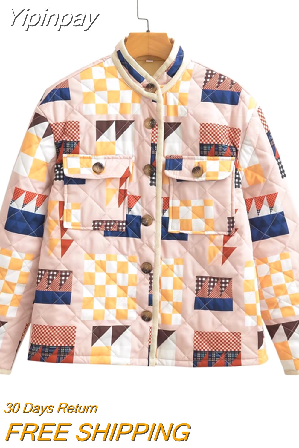 Yipinpay TRAF Plaid Print Quilted Coat for Women 2023 Autumn Stand Collar Parka Coats Female Single-breasted Jackets New Outerwear
