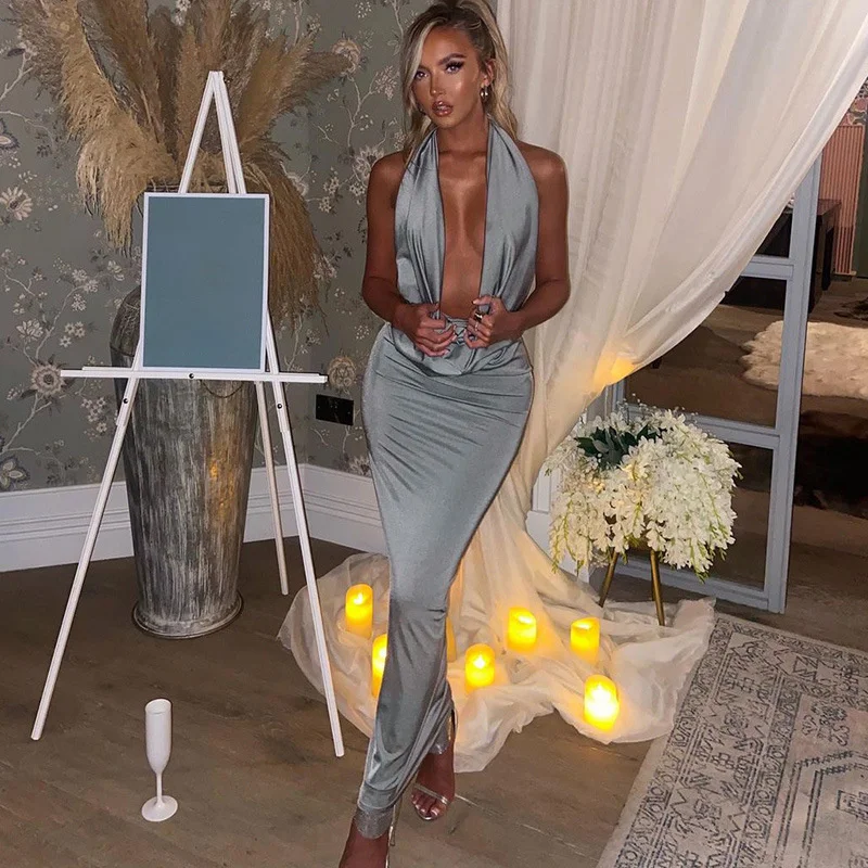 Yipinpay V-Neck Satin Slim Vestidos For Women Red Halter Backless Sexy Evening Party Clubwear Dresses Ladies Bodycon Maxi Dress