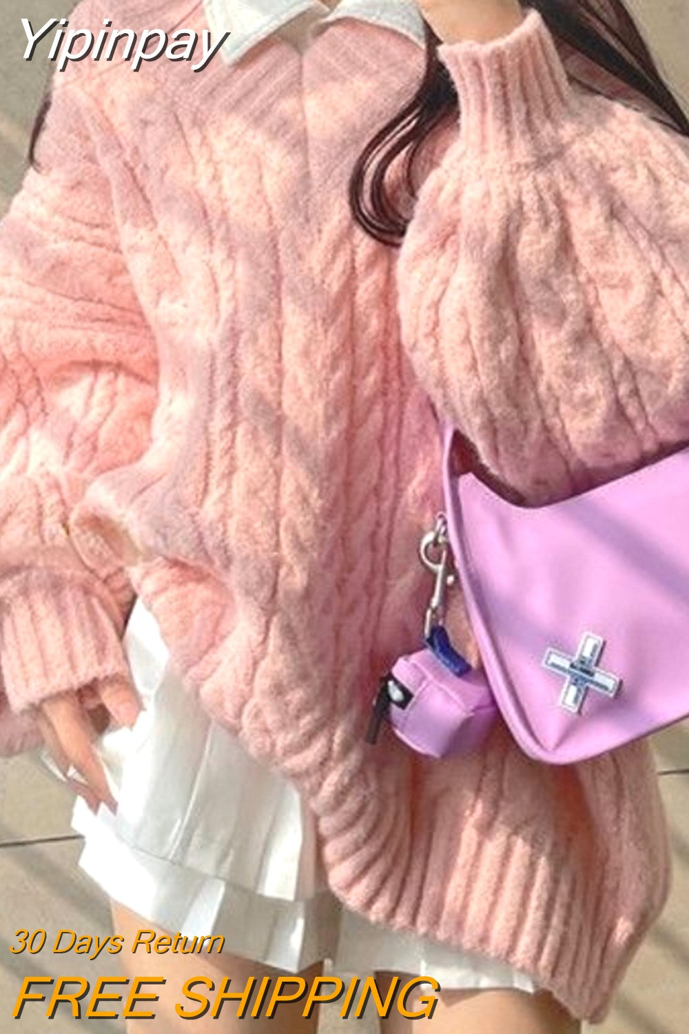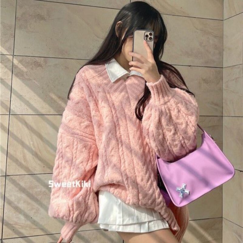 Yipinpay V-neck Women's Sweater Vintage Casual Loose Solid Knit Sweater Preppy Cute Tops Autumn Winter Korean Fashion Pullover