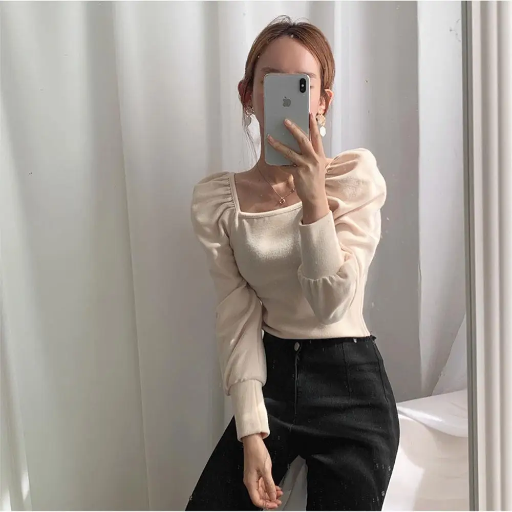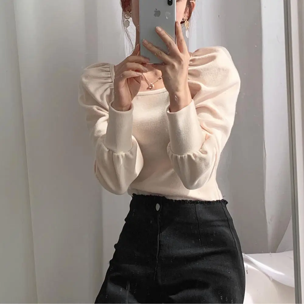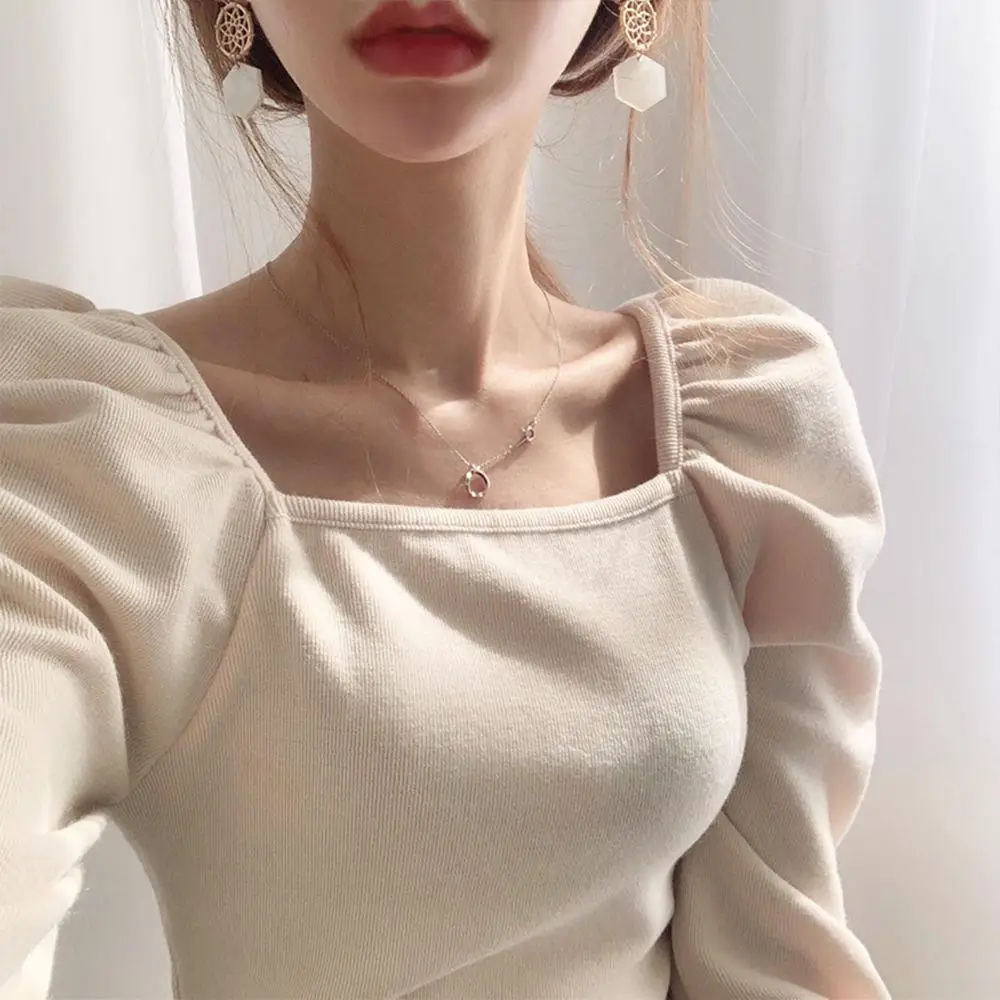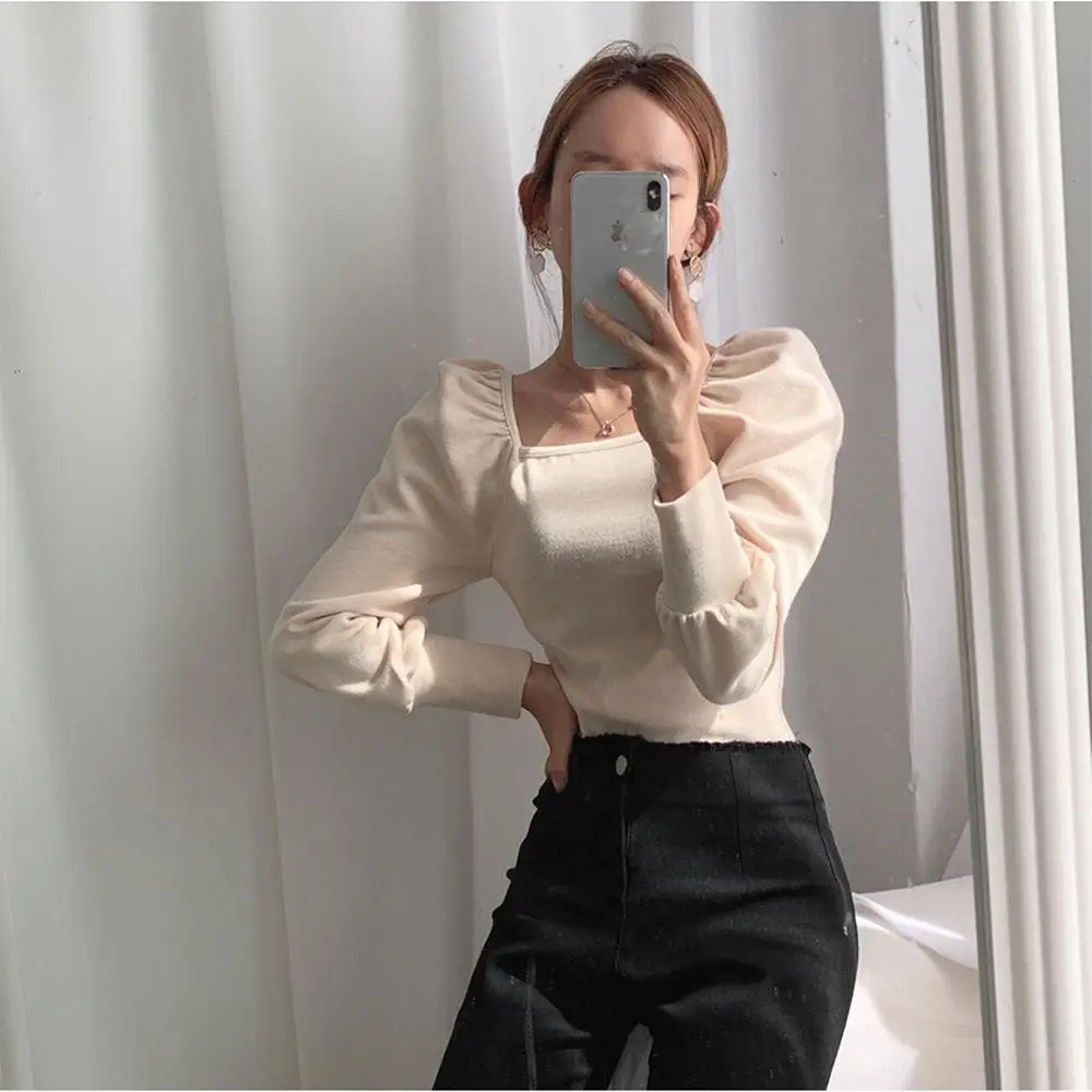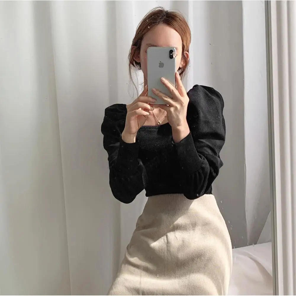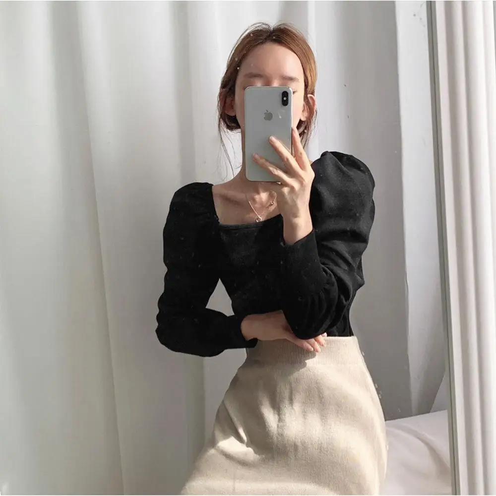 Yipinpay Velvet 2023 Shirts for Women Chic Square Pleated Puff Sleeve T-shirt Solid Wild Black Knitwear Thin Sweaters Tee Top