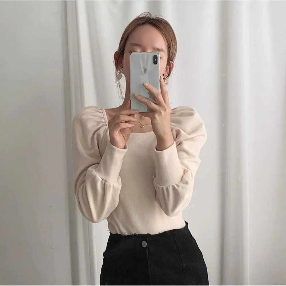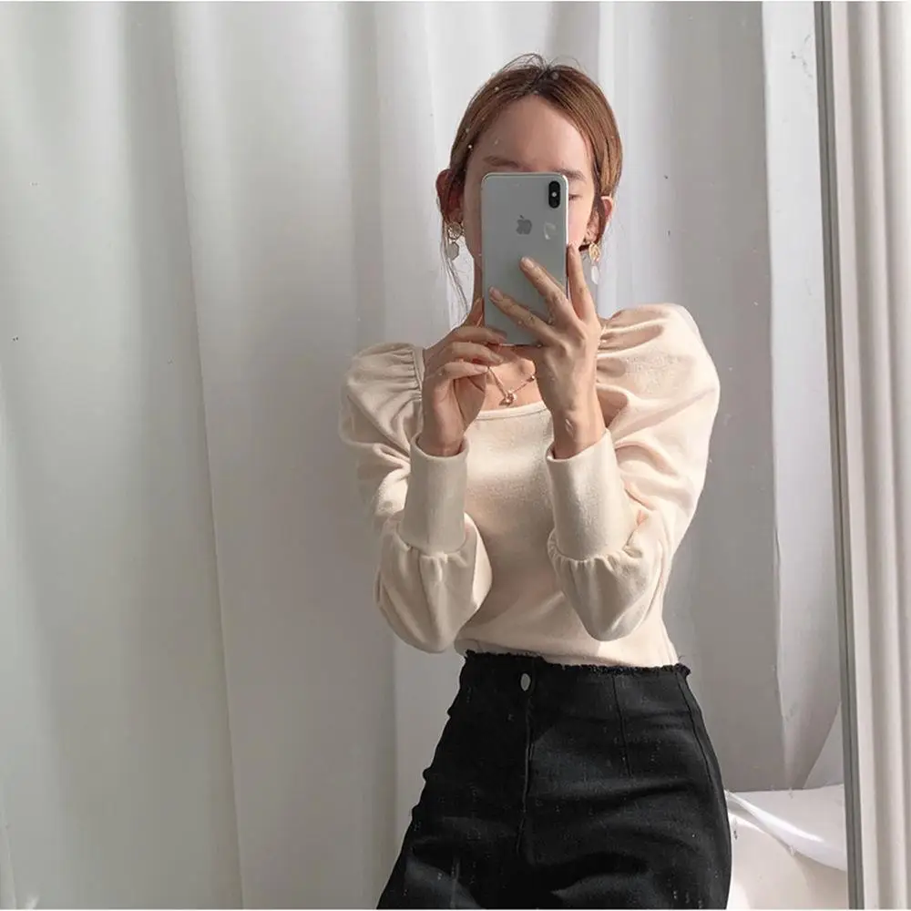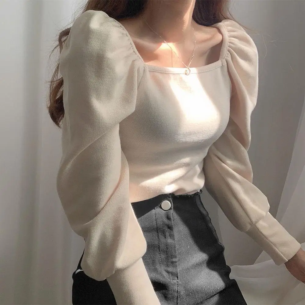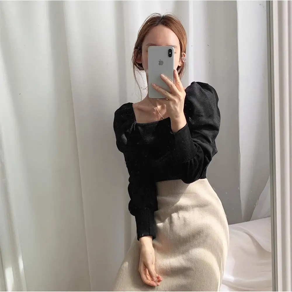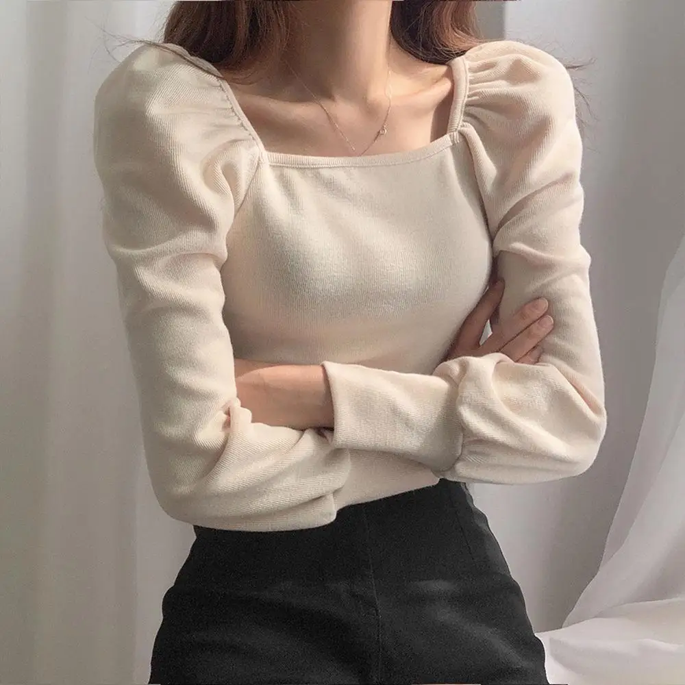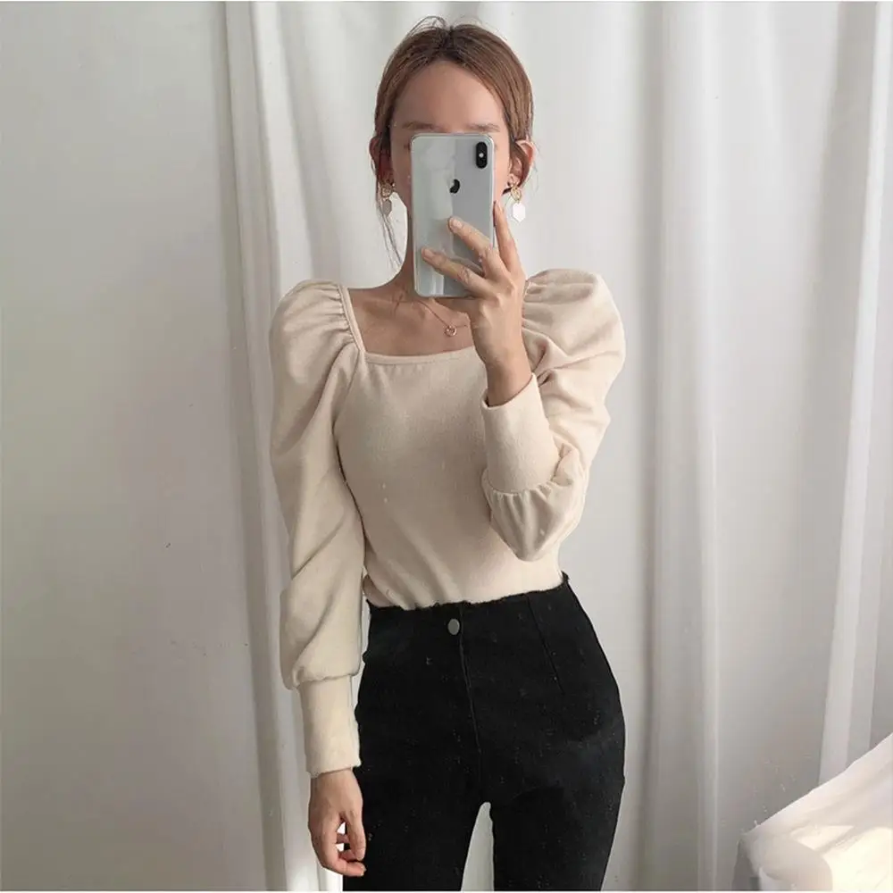 Yipinpay Velvet 2023 Shirts for Women Chic Square Pleated Puff Sleeve T-shirt Solid Wild Black Knitwear Thin Sweaters Tee Top