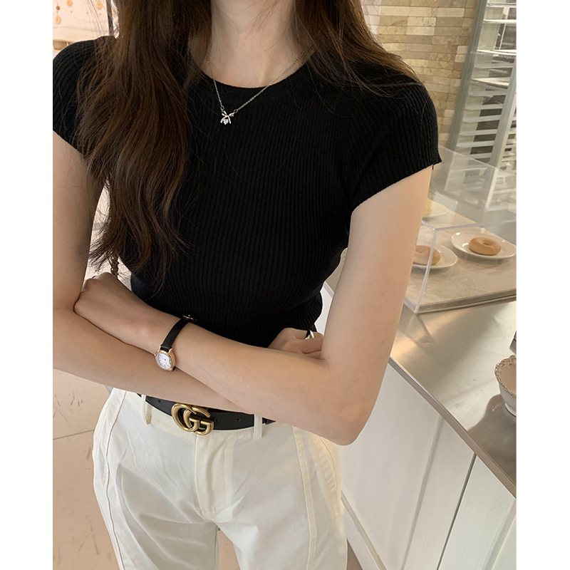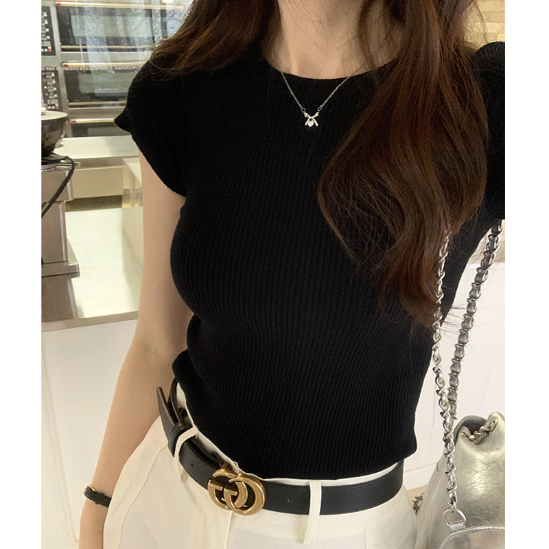Yipinpay Version Of Simple Knitted Short-Sleeved T-Shirt Women's Spring And Summer New Minority Design Slim Full-Color Blouse