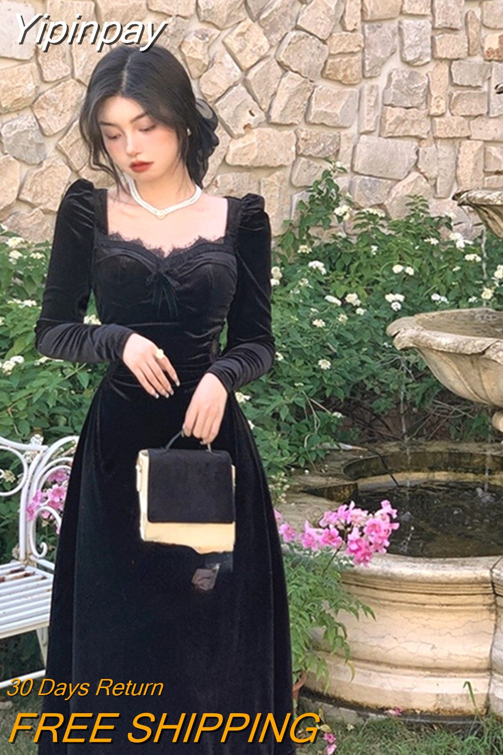 Yipinpay Vintage Balck Long Sleeve Dress Woman Elegant Fashion Velvet Midi Dress Korean Style Even Party Dress Casual 2023 Spring