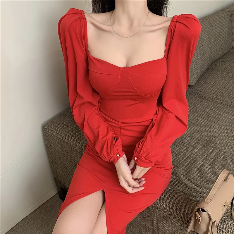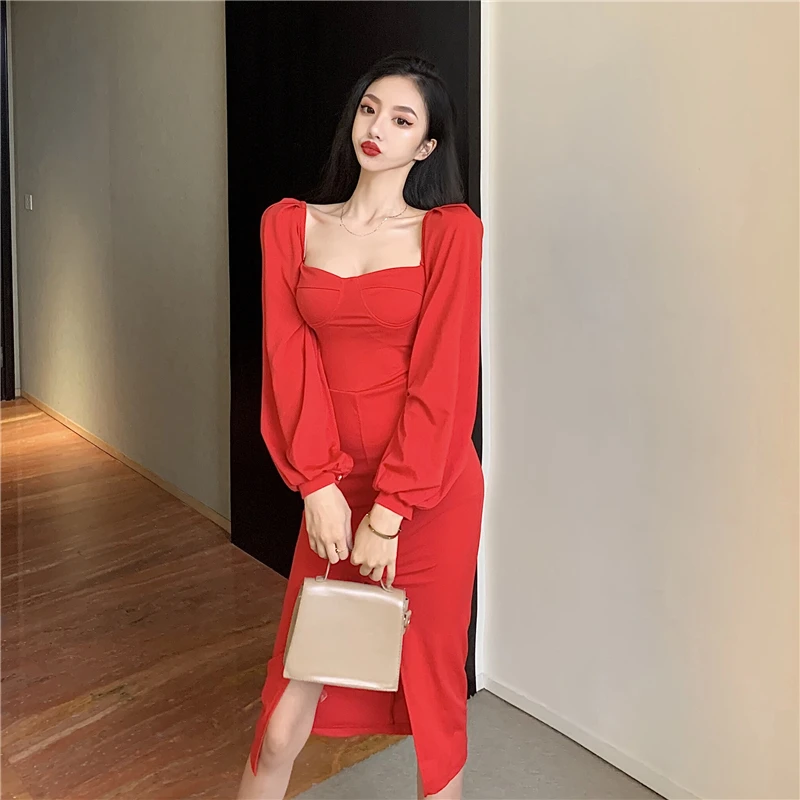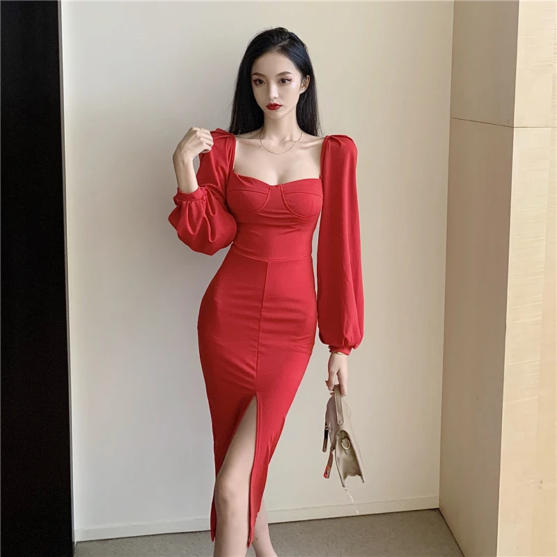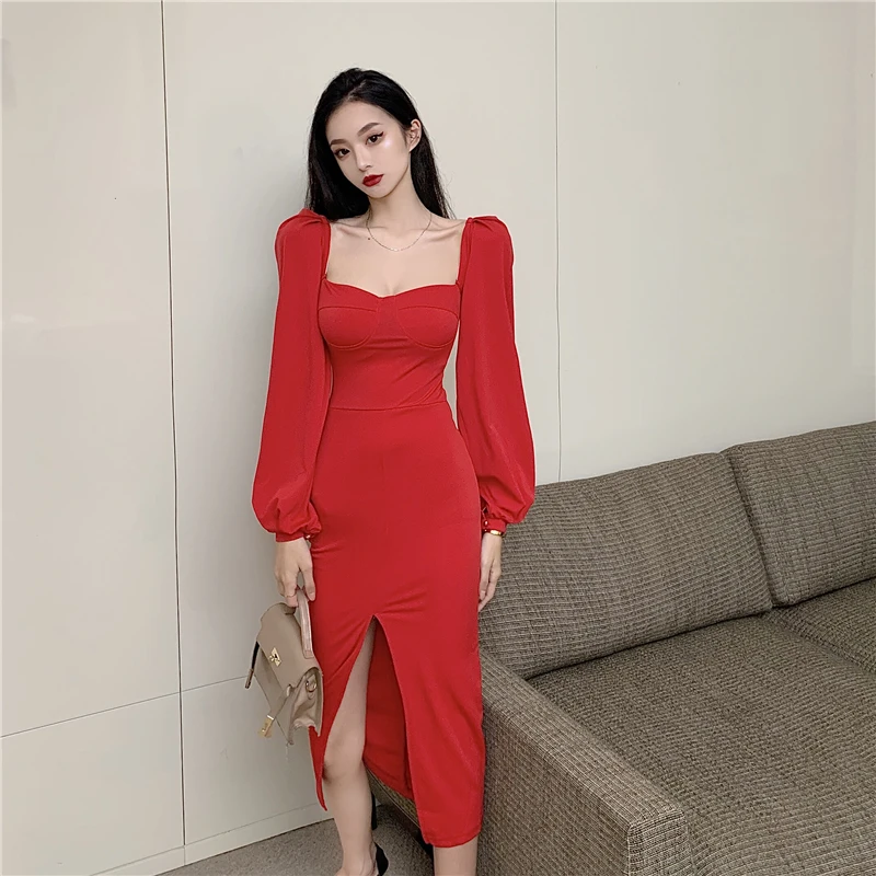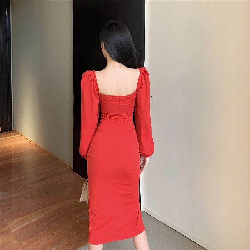 Yipinpay Vintage Dresses Women Puff Long Sleeve Square Collar Autumn Fashion Backless Split Slim Sexy Dress Elegant Party Ladies