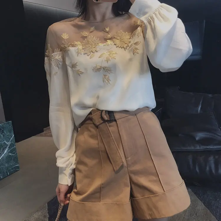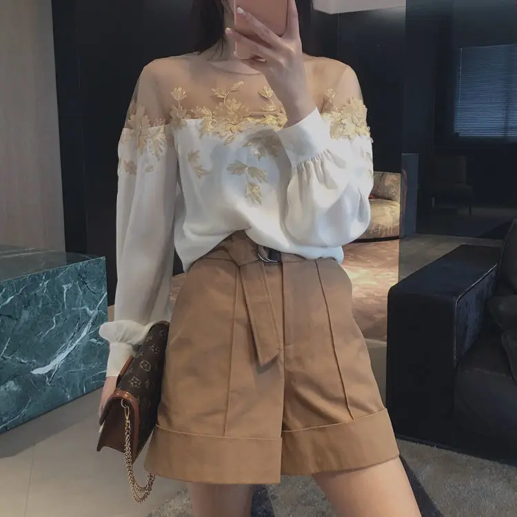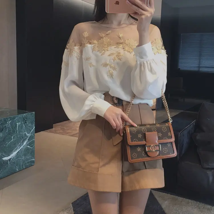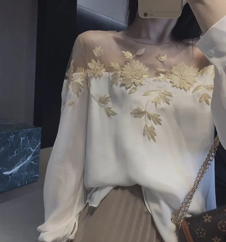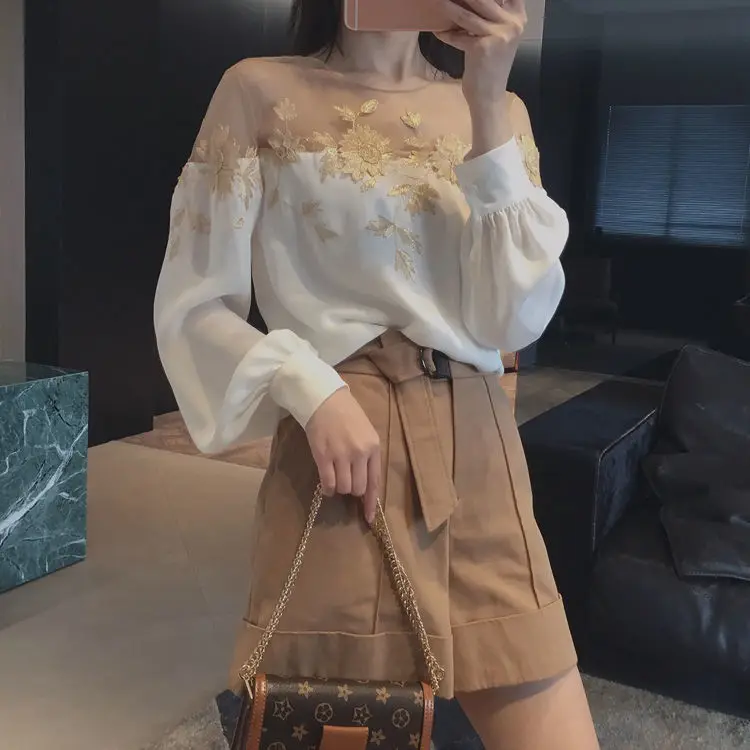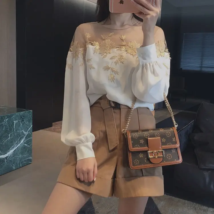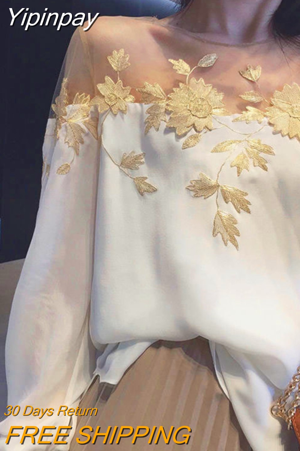 Yipinpay Vintage Floral Blouses Women Long Sleeve O-Neck Shirts Embroidery Shirts Famale Sexy Lace Elegant Tops Ladies 2023 Summer