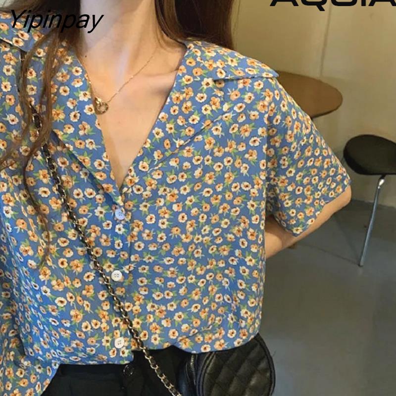 Yipinpay Vintage Floral Printing Button Up Women Shirt Notched Neck Short Sleeve Womens Blouse 2023 Summer Loose Tunic Female Shirts