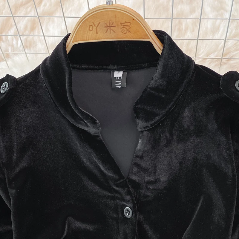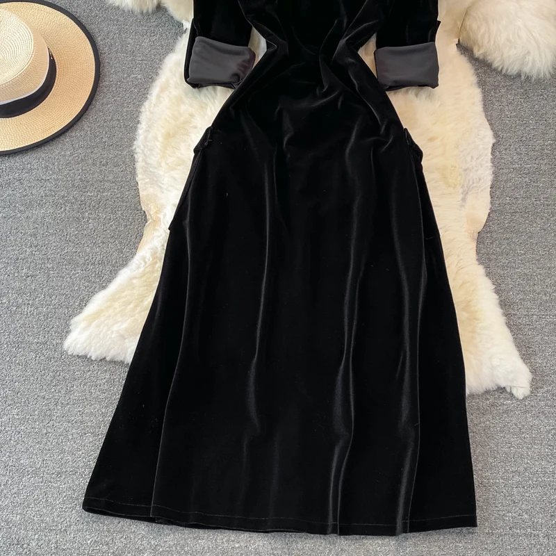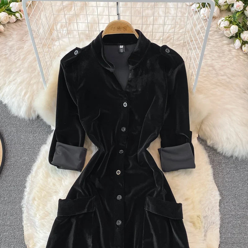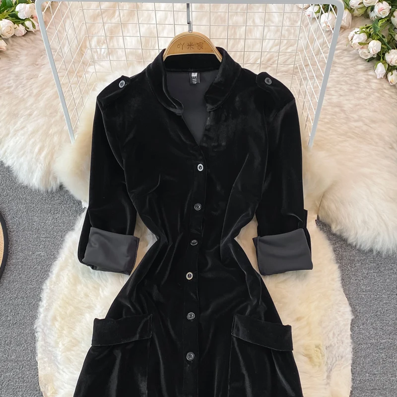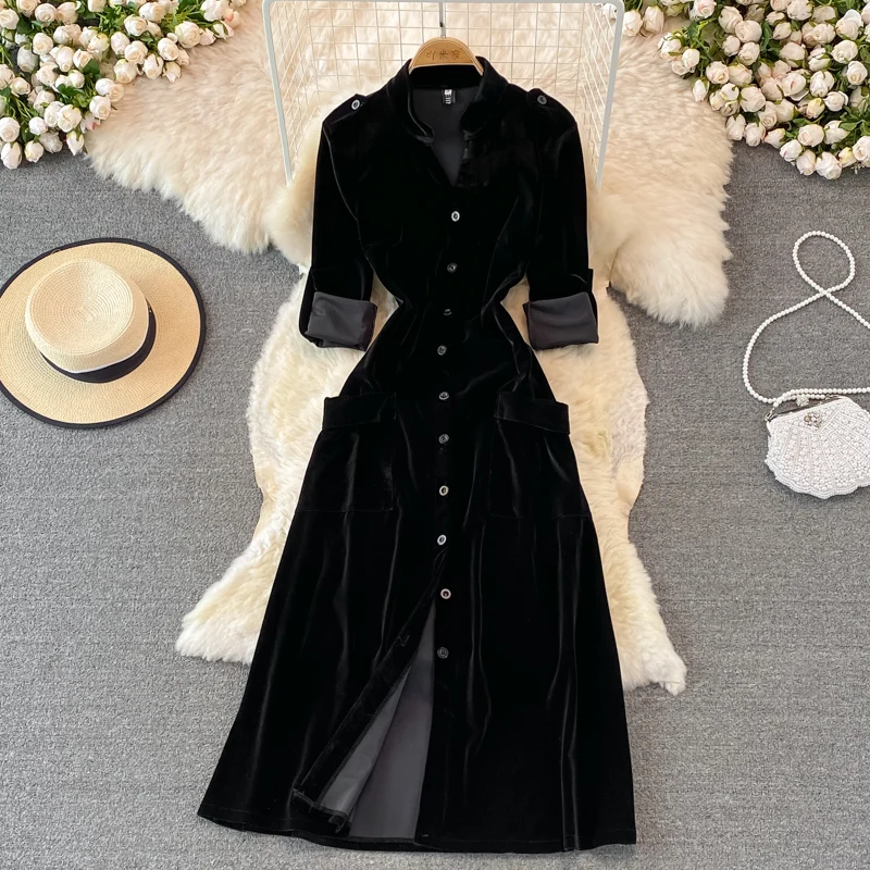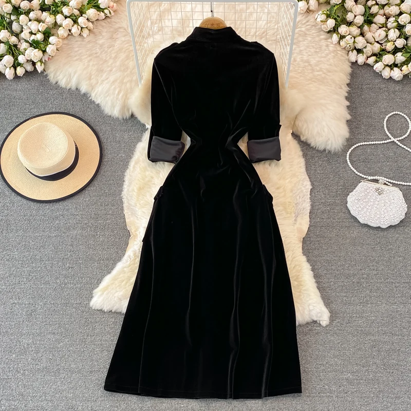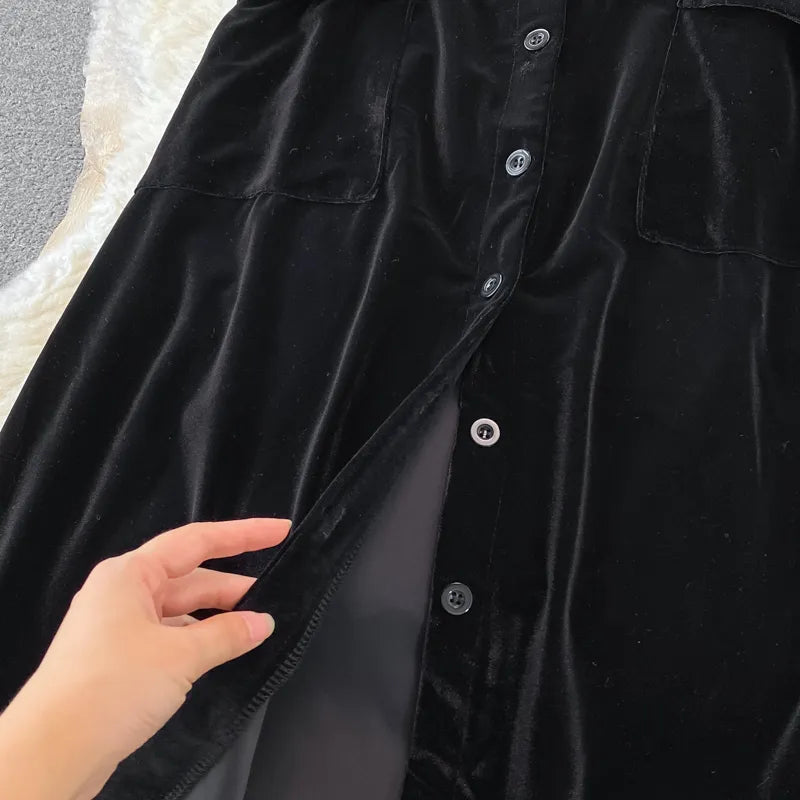 Yipinpay Vintage Maxi Pocket Single-Breasted Black Velvet Dress for Women Long Vestidos Mujer Party Autumn Winter Clothes A Line Robe