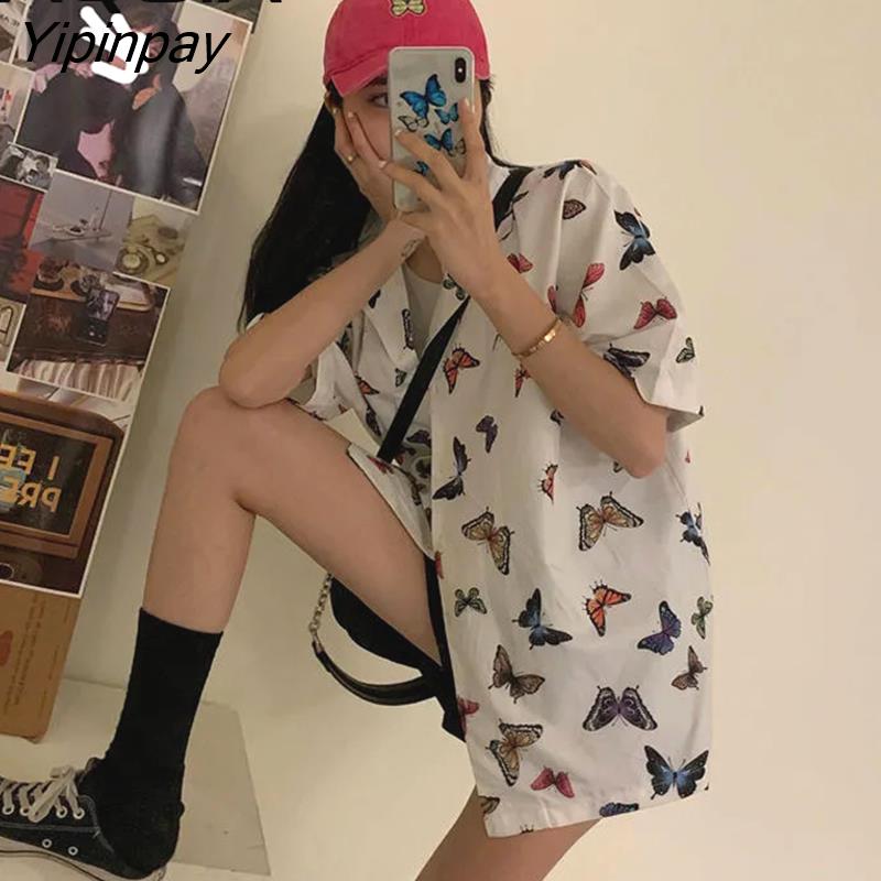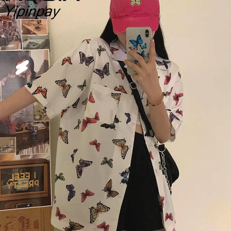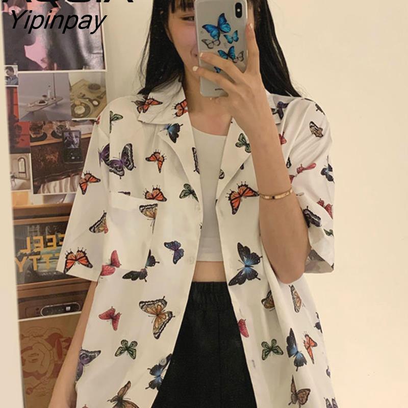 Yipinpay Vitage Short Sleeve Loose Women Blouse Shirt Y2K Butterfly Printing Button Up Pockets Womens Shirts 2023 Summer Y2K Tops